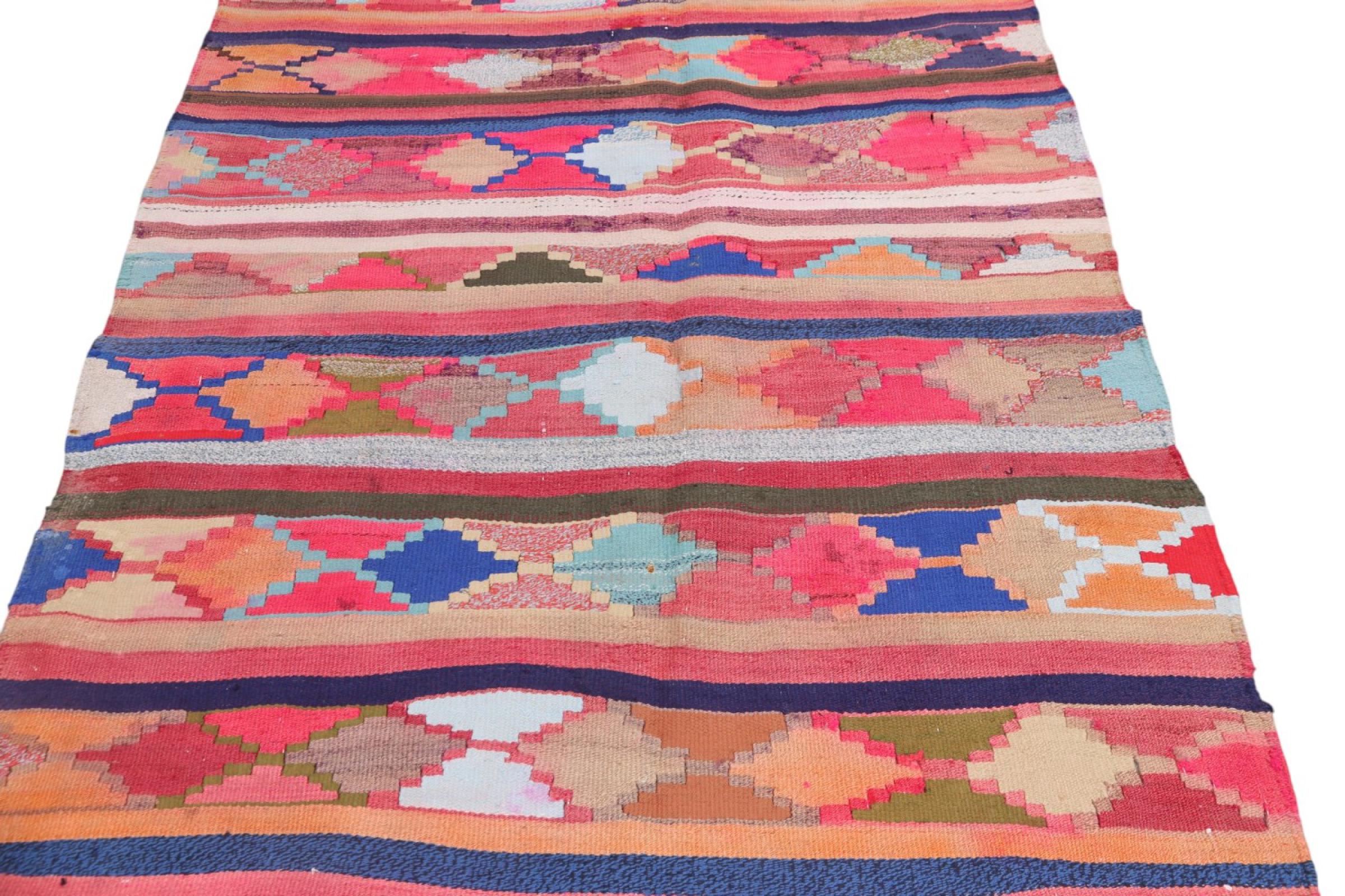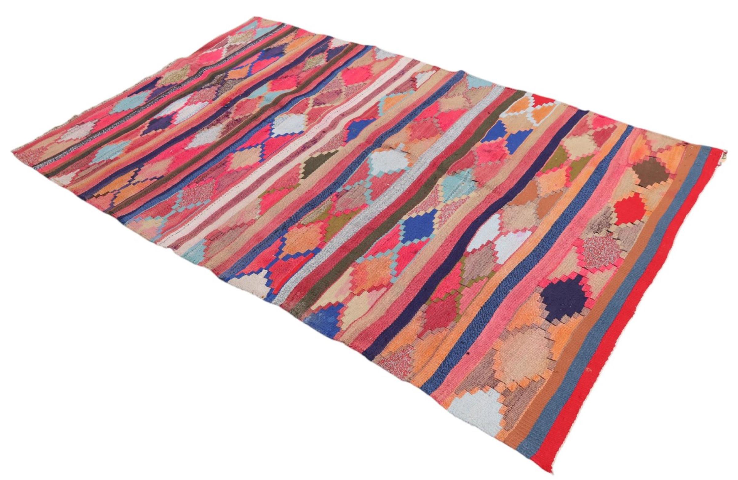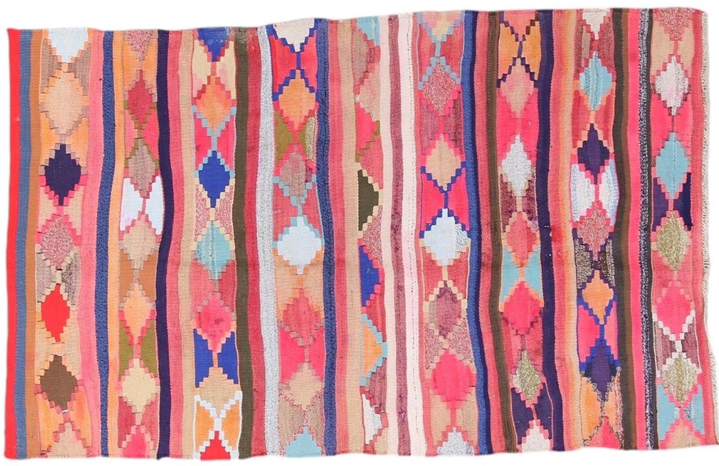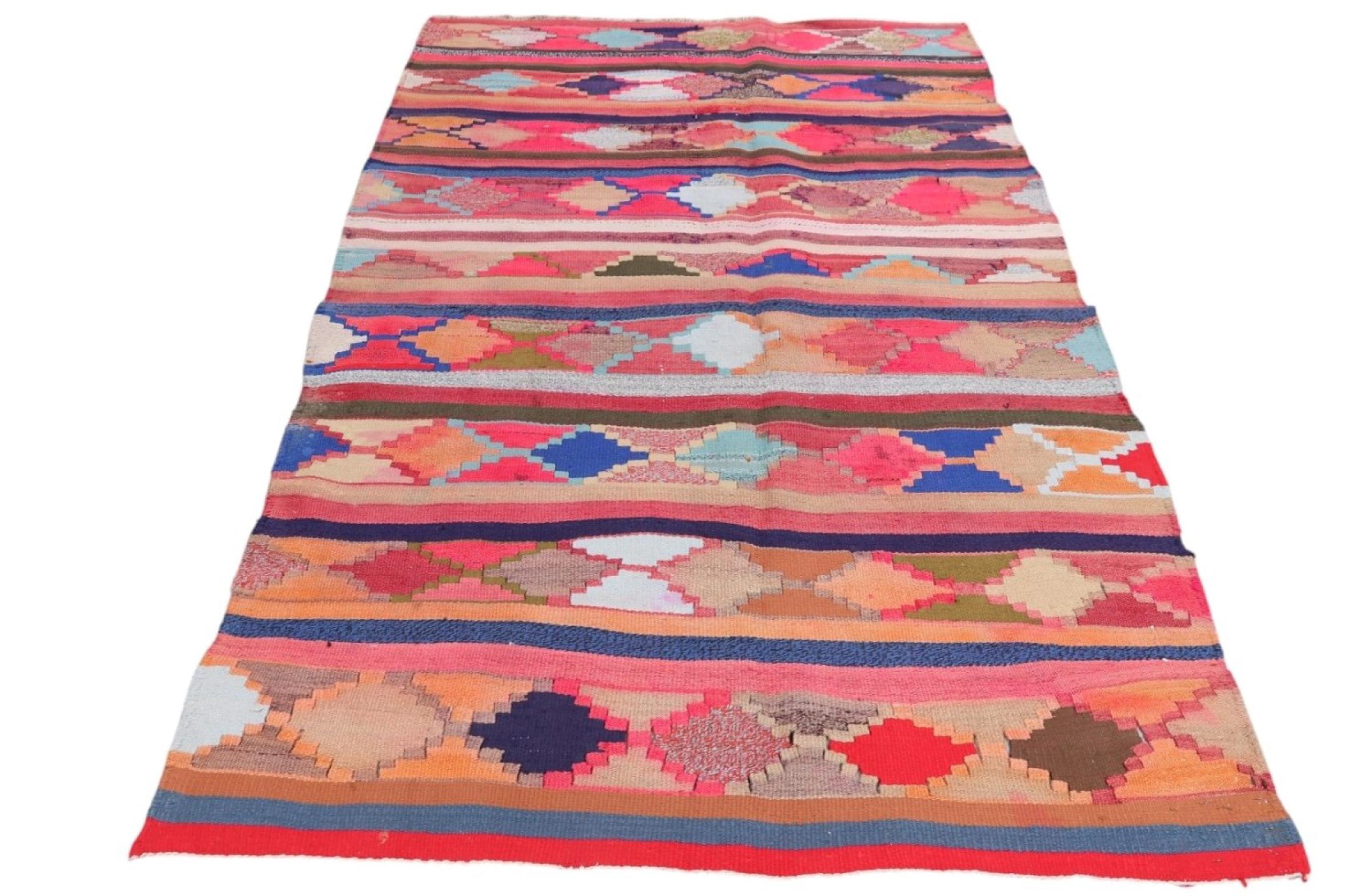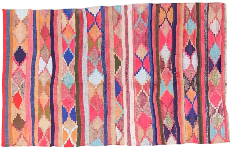 Dieser Teppich ist als Flachgewebe von Hand am Webstuhl gefertigt worden. Als Flachgewebe bezeichnet man Teppiche, die keinen Flor besitzen. Wie der Name verspricht, werden diese Teppiche gewebt und nicht geknotet. Dies hat einen flachen Teppich mit strukturierter Oberfläche zur Folge. Flachgewebe sind nicht so weich und meist dünner als geknüpfte Teppiche. Gleichzeitig sind sie deutlich weniger aufwändig in der Fertigung und lassen sich meist von beiden Seiten (Vorder- und Rückseite) auslegen. Ihre Muster sind in der Regel geometrisch, was durch das Gewebe bedingt ist.