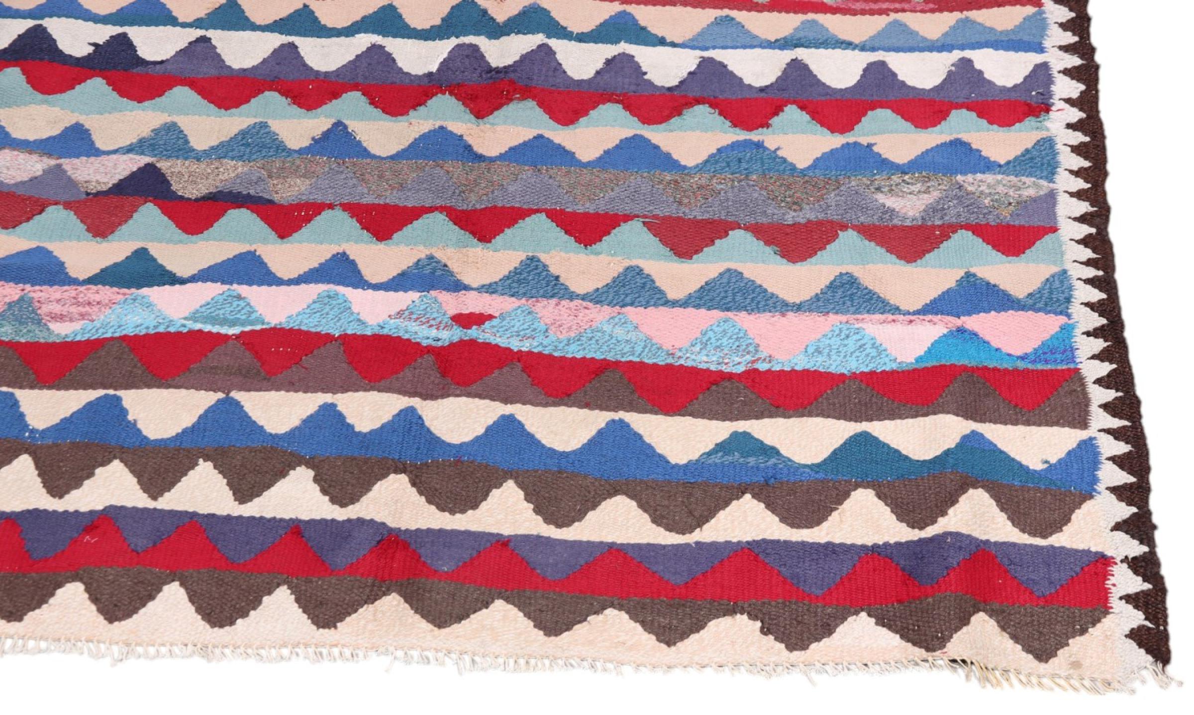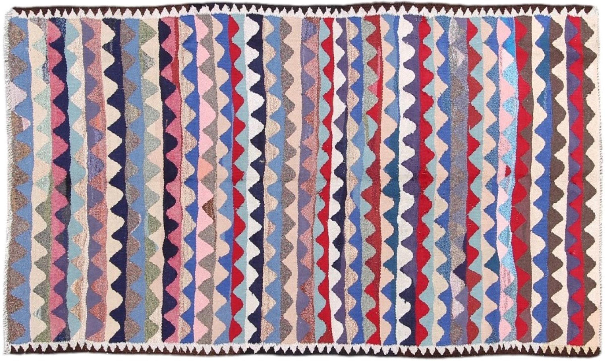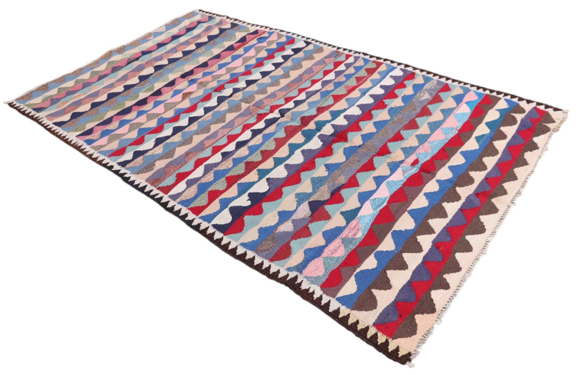 Dieser Teppich ist als Flachgewebe von Hand am Webstuhl gefertigt worden. Als Flachgewebe bezeichnet man Teppiche, die keinen Flor besitzen. Wie der Name verspricht, werden diese Teppiche gewebt und nicht geknotet. Dies hat einen flachen Teppich mit strukturierter Oberfläche zur Folge. Flachgewebe sind nicht so weich und meist dünner als geknüpfte Teppiche. Gleichzeitig sind sie deutlich weniger aufwändig in der Fertigung und lassen sich meist von beiden Seiten (Vorder- und Rückseite) auslegen. Ihre Muster sind in der Regel geometrisch, was durch das Gewebe bedingt ist.