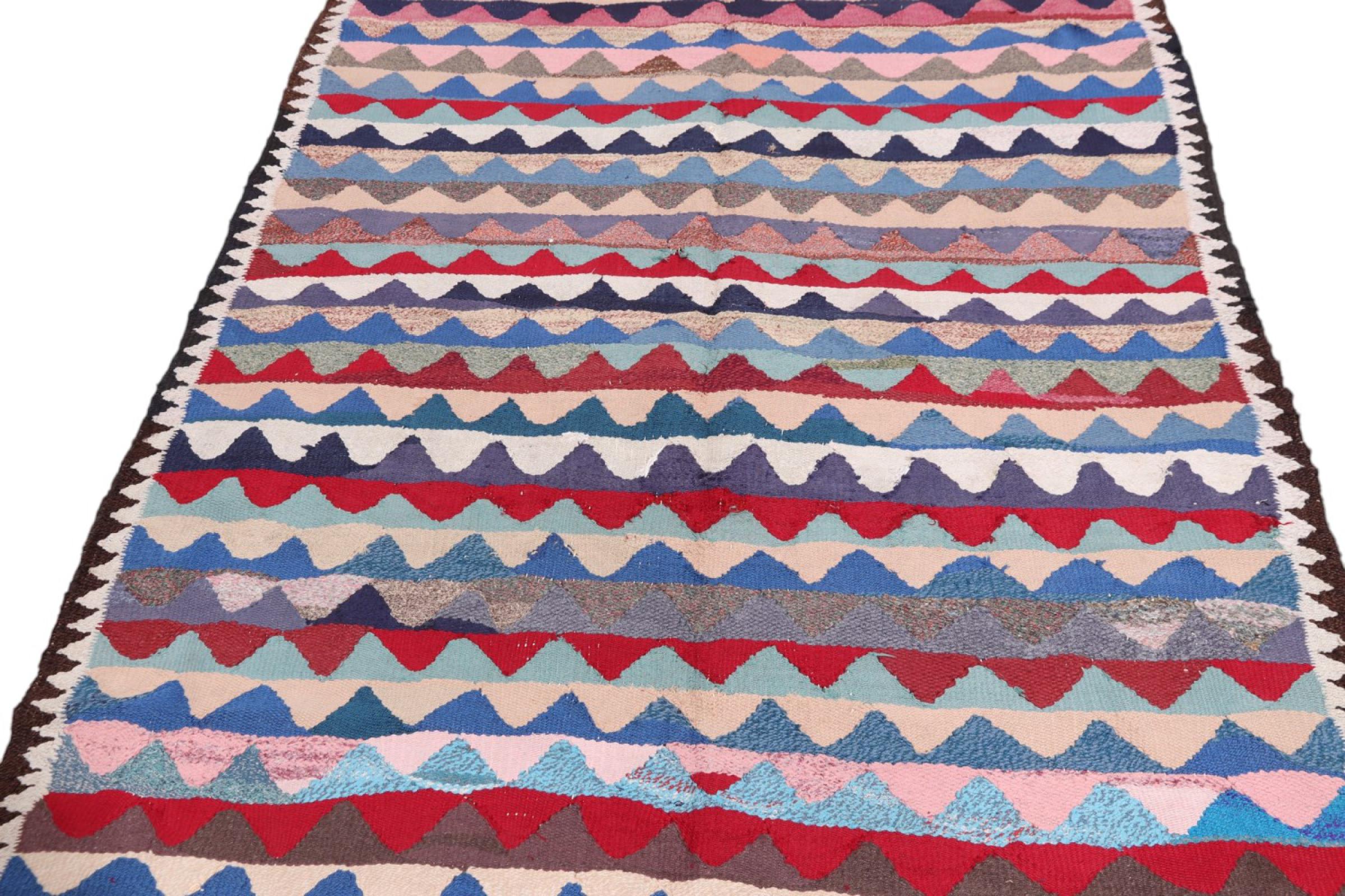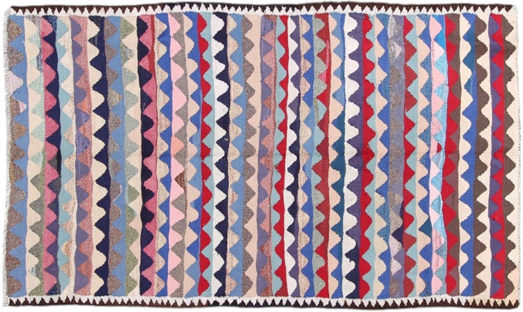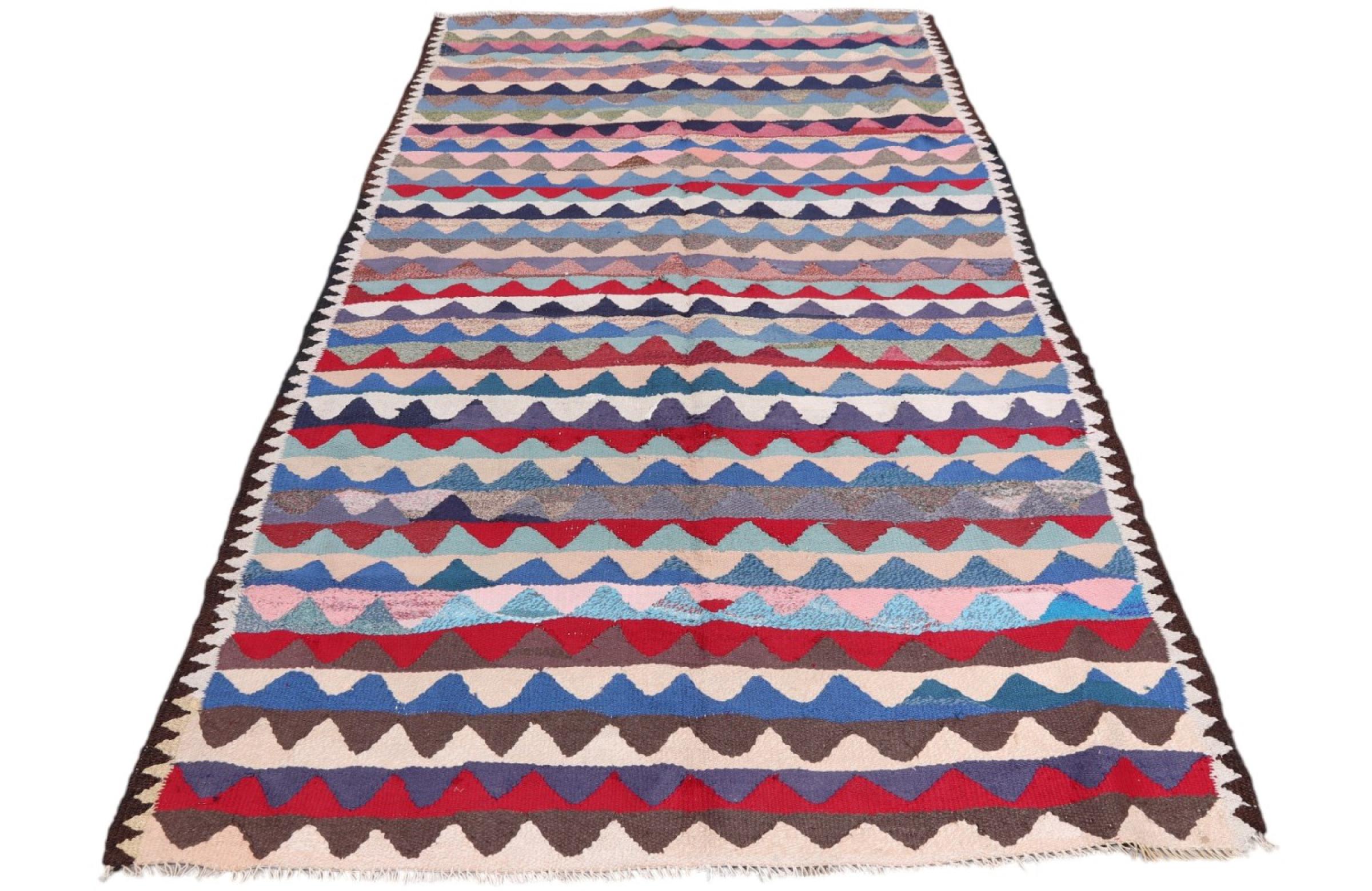 Dieser Teppich ist als Flachgewebe von Hand am Webstuhl gefertigt worden. Als Flachgewebe bezeichnet man Teppiche, die keinen Flor besitzen. Wie der Name verspricht, werden diese Teppiche gewebt und nicht geknotet. Dies hat einen flachen Teppich mit strukturierter Oberfläche zur Folge. Flachgewebe sind nicht so weich und meist dünner als geknüpfte Teppiche. Gleichzeitig sind sie deutlich weniger aufwändig in der Fertigung und lassen sich meist von beiden Seiten (Vorder- und Rückseite) auslegen. Ihre Muster sind in der Regel geometrisch, was durch das Gewebe bedingt ist.