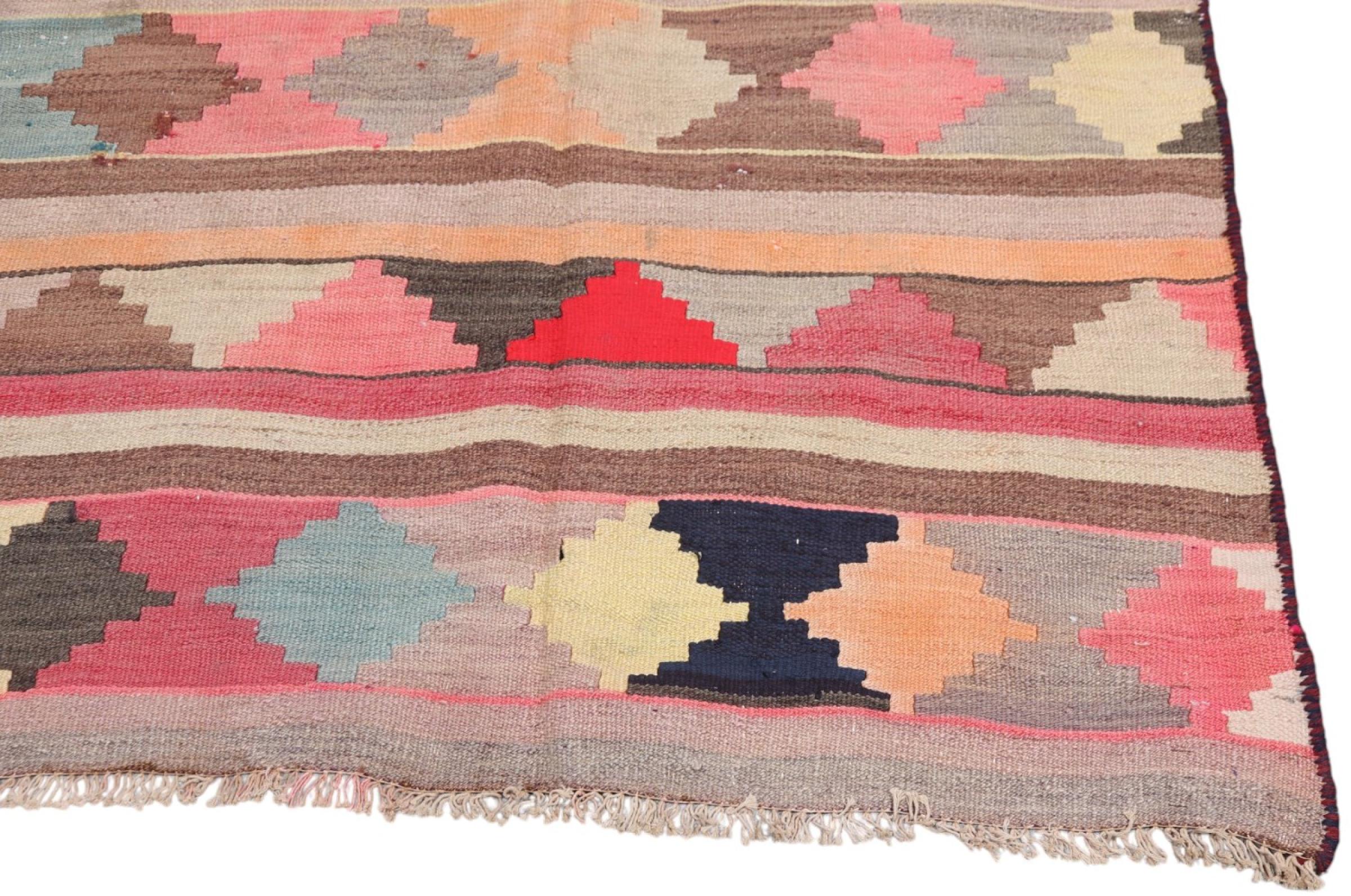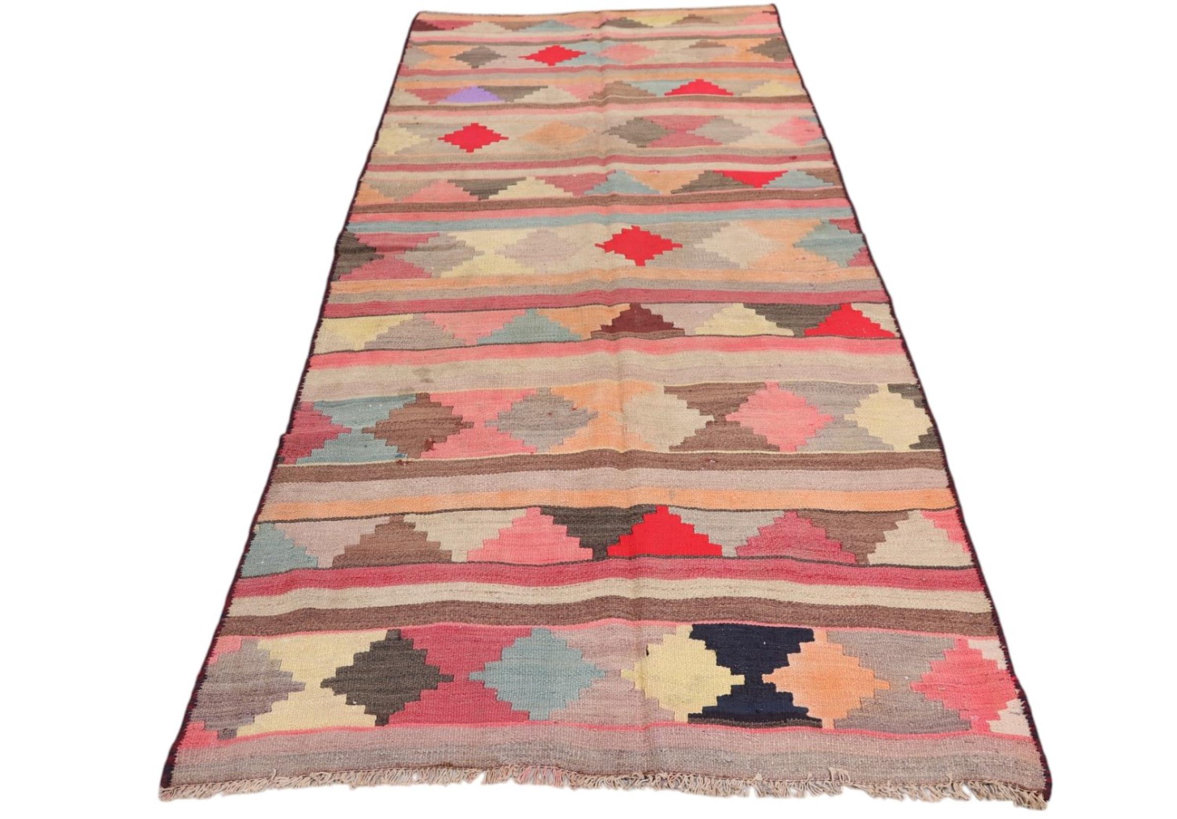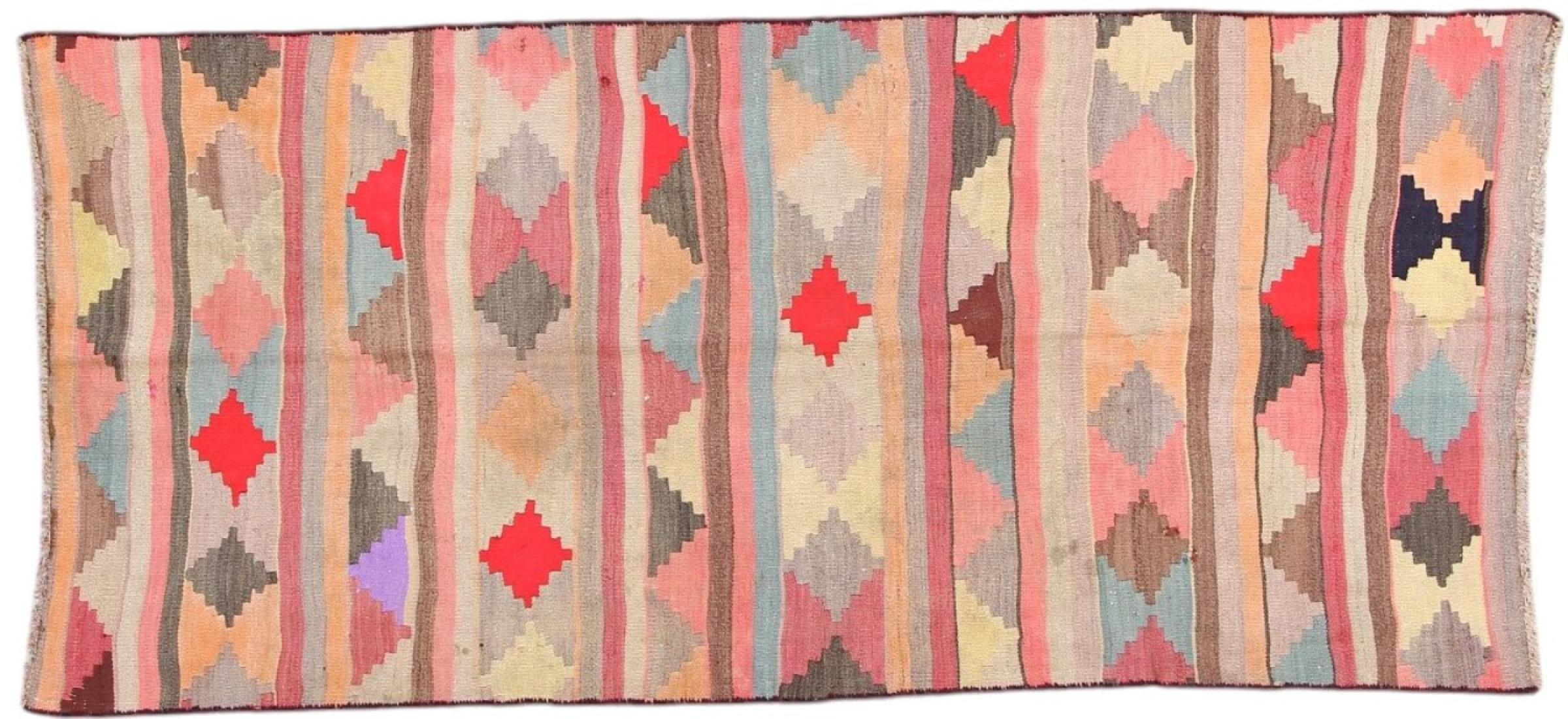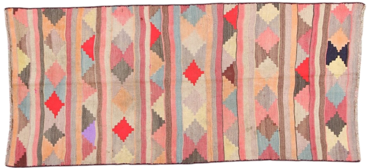 Dieser Teppich ist als Flachgewebe von Hand am Webstuhl gefertigt worden. Als Flachgewebe bezeichnet man Teppiche, die keinen Flor besitzen. Wie der Name verspricht, werden diese Teppiche gewebt und nicht geknotet. Dies hat einen flachen Teppich mit strukturierter Oberfläche zur Folge. Flachgewebe sind nicht so weich und meist dünner als geknüpfte Teppiche. Gleichzeitig sind sie deutlich weniger aufwändig in der Fertigung und lassen sich meist von beiden Seiten (Vorder- und Rückseite) auslegen. Ihre Muster sind in der Regel geometrisch, was durch das Gewebe bedingt ist.