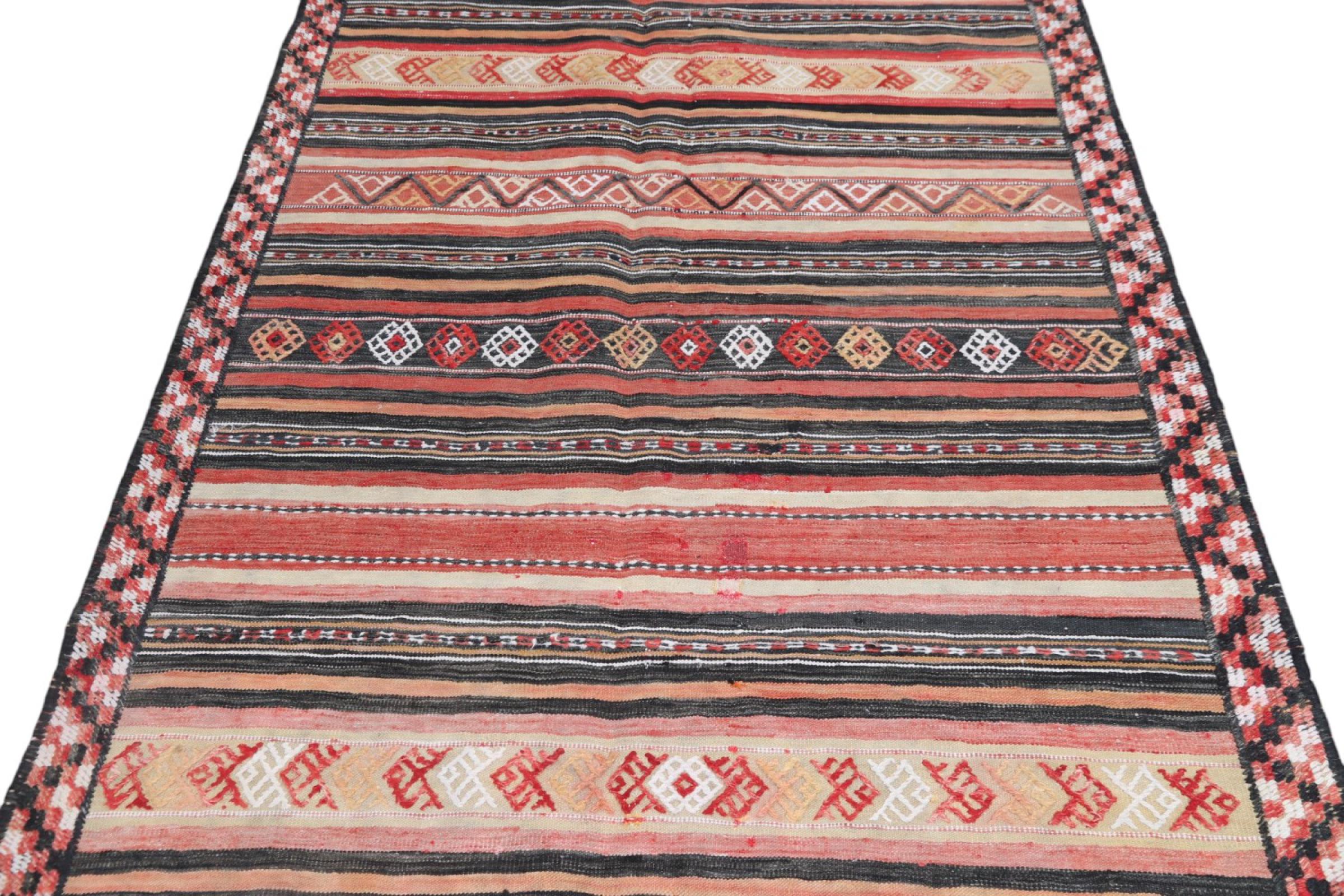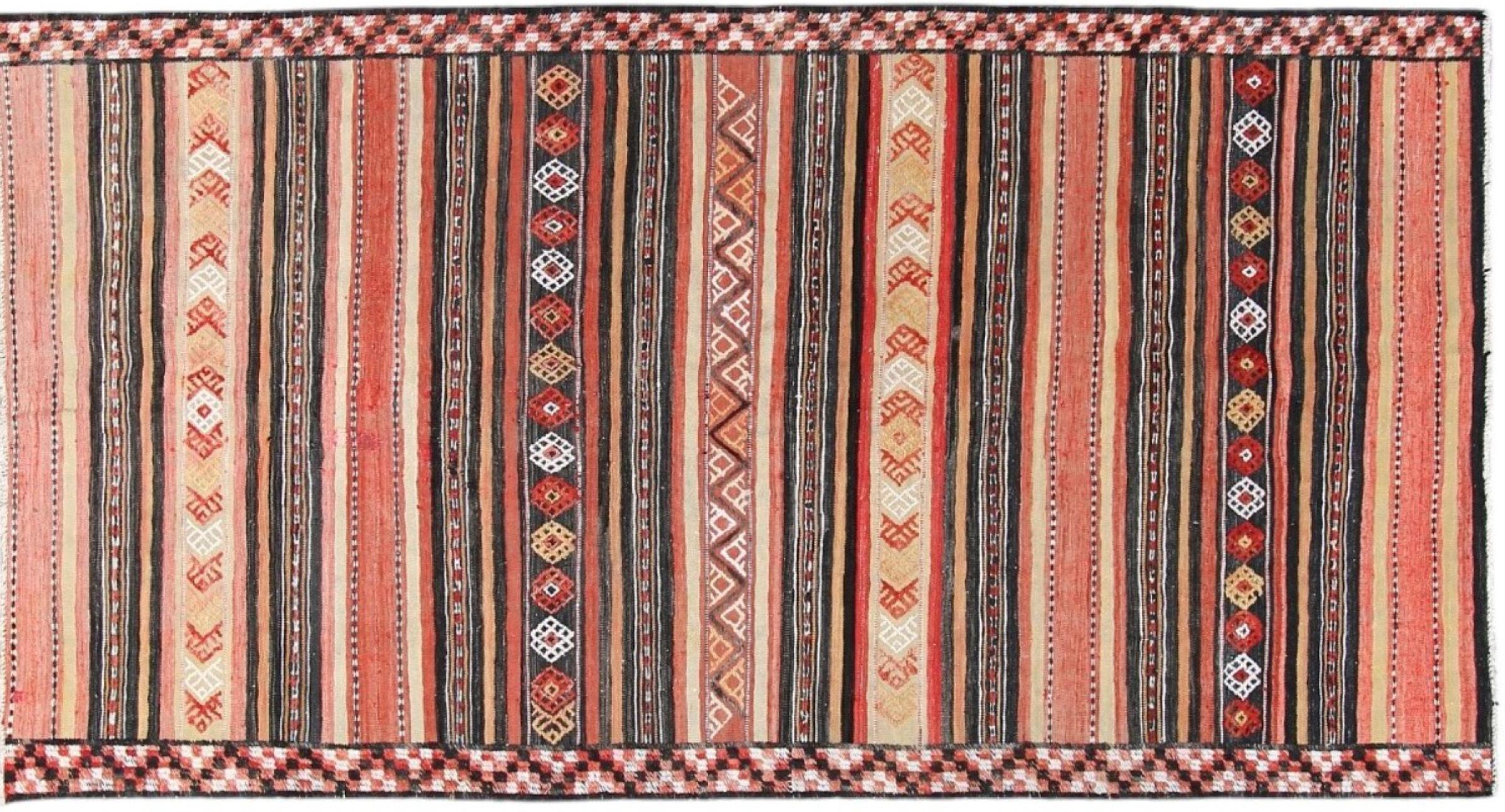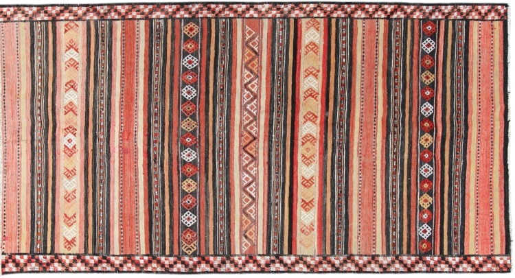 Dieser Teppich ist als Flachgewebe von Hand am Webstuhl gefertigt worden. Als Flachgewebe bezeichnet man Teppiche, die keinen Flor besitzen. Wie der Name verspricht, werden diese Teppiche gewebt und nicht geknotet. Dies hat einen flachen Teppich mit strukturierter Oberfläche zur Folge. Flachgewebe sind nicht so weich und meist dünner als geknüpfte Teppiche. Gleichzeitig sind sie deutlich weniger aufwändig in der Fertigung und lassen sich meist von beiden Seiten (Vorder- und Rückseite) auslegen. Ihre Muster sind in der Regel geometrisch, was durch das Gewebe bedingt ist.