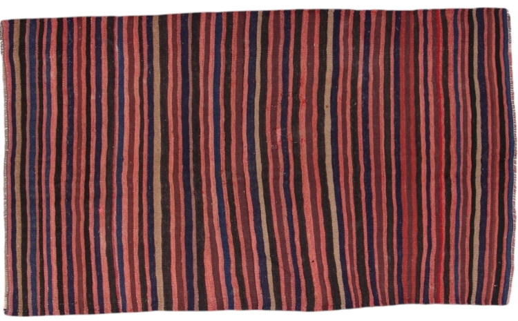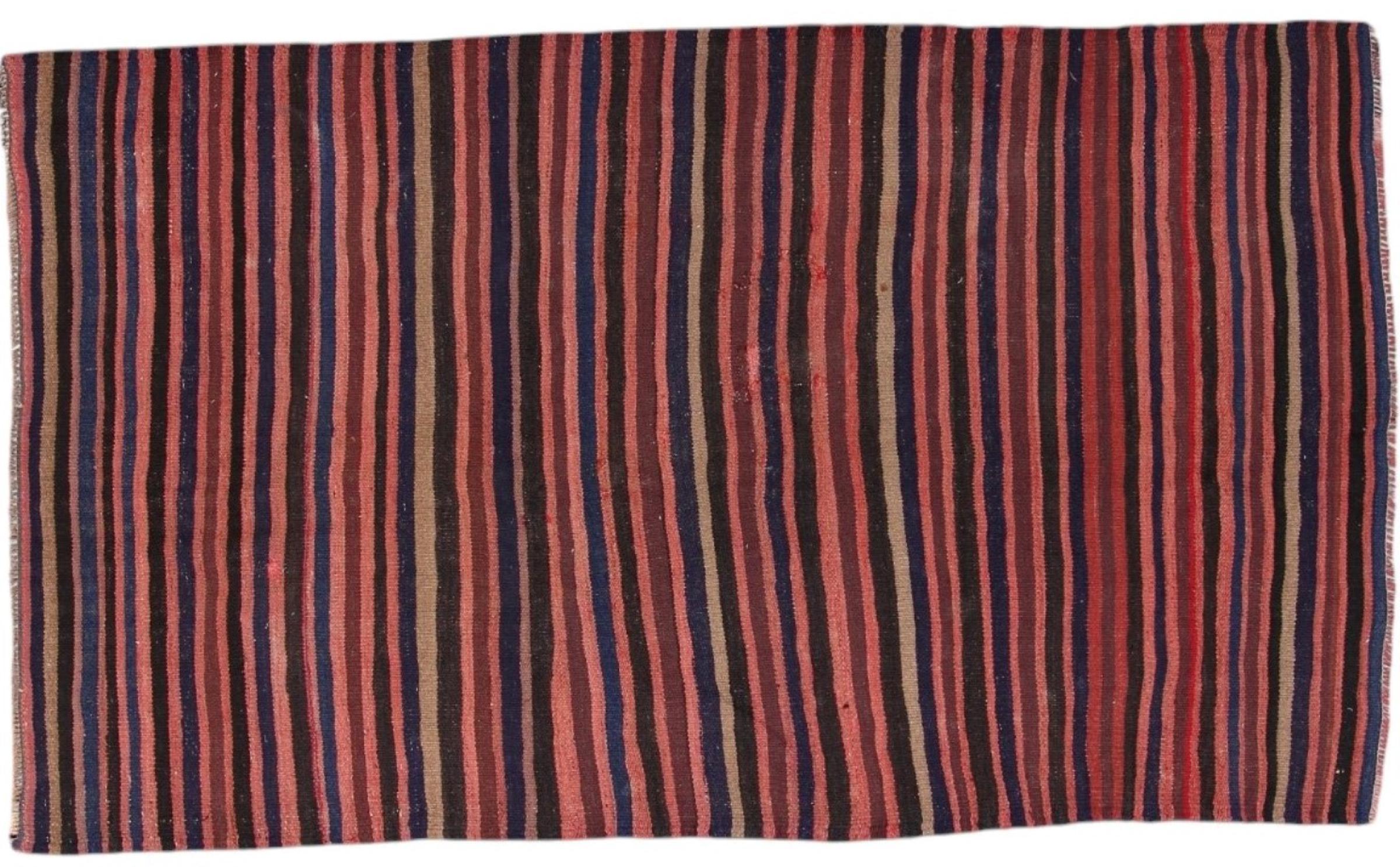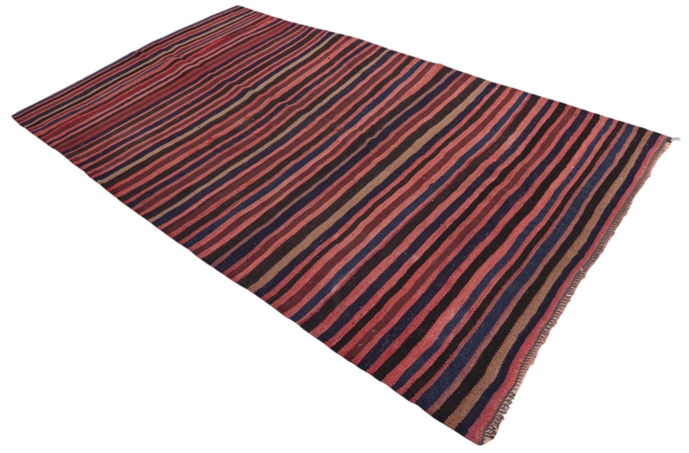 Dieser Teppich ist als Flachgewebe von Hand am Webstuhl gefertigt worden. Als Flachgewebe bezeichnet man Teppiche, die keinen Flor besitzen. Wie der Name verspricht, werden diese Teppiche gewebt und nicht geknotet. Dies hat einen flachen Teppich mit strukturierter Oberfläche zur Folge. Flachgewebe sind nicht so weich und meist dünner als geknüpfte Teppiche. Gleichzeitig sind sie deutlich weniger aufwändig in der Fertigung und lassen sich meist von beiden Seiten (Vorder- und Rückseite) auslegen. Ihre Muster sind in der Regel geometrisch, was durch das Gewebe bedingt ist.