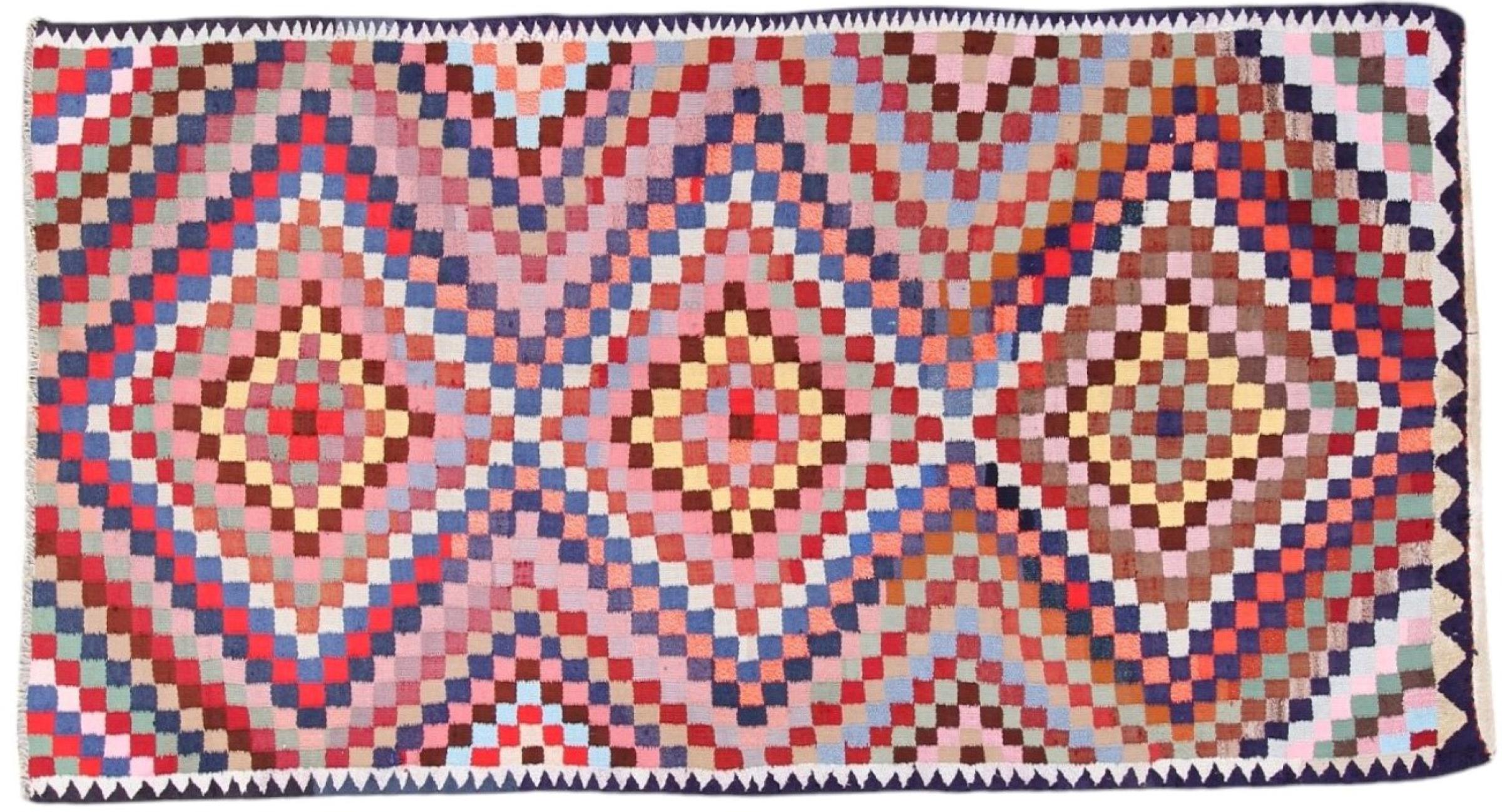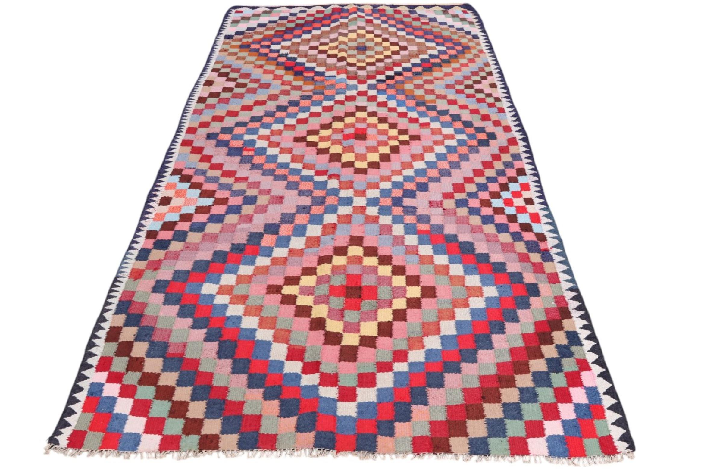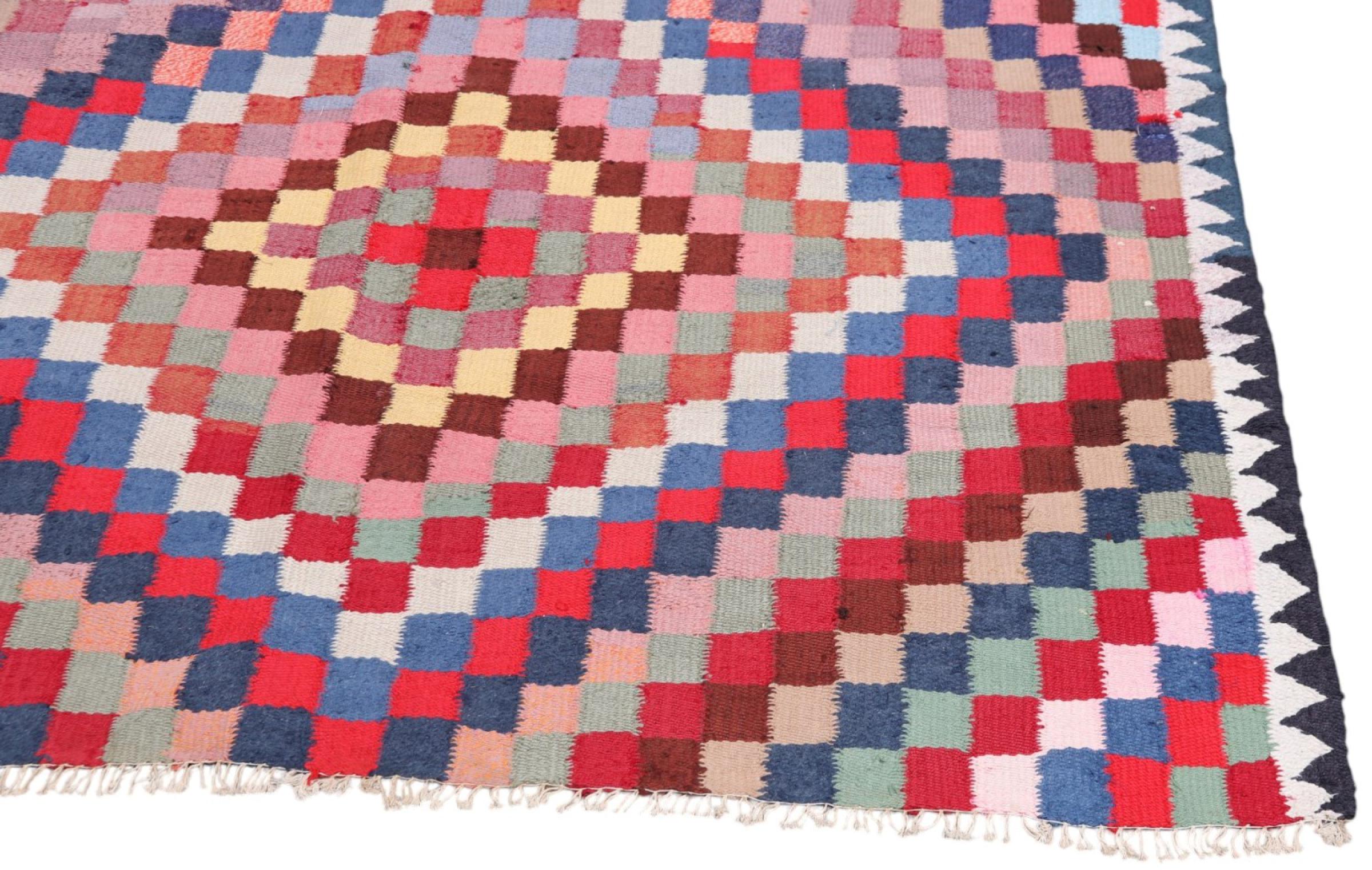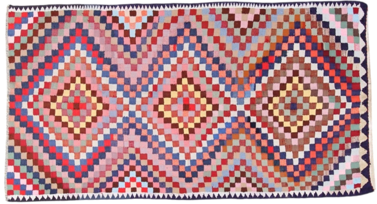 Dieser Teppich ist als Flachgewebe von Hand am Webstuhl gefertigt worden. Als Flachgewebe bezeichnet man Teppiche, die keinen Flor besitzen. Wie der Name verspricht, werden diese Teppiche gewebt und nicht geknotet. Dies hat einen flachen Teppich mit strukturierter Oberfläche zur Folge. Flachgewebe sind nicht so weich und meist dünner als geknüpfte Teppiche. Gleichzeitig sind sie deutlich weniger aufwändig in der Fertigung und lassen sich meist von beiden Seiten (Vorder- und Rückseite) auslegen. Ihre Muster sind in der Regel geometrisch, was durch das Gewebe bedingt ist.