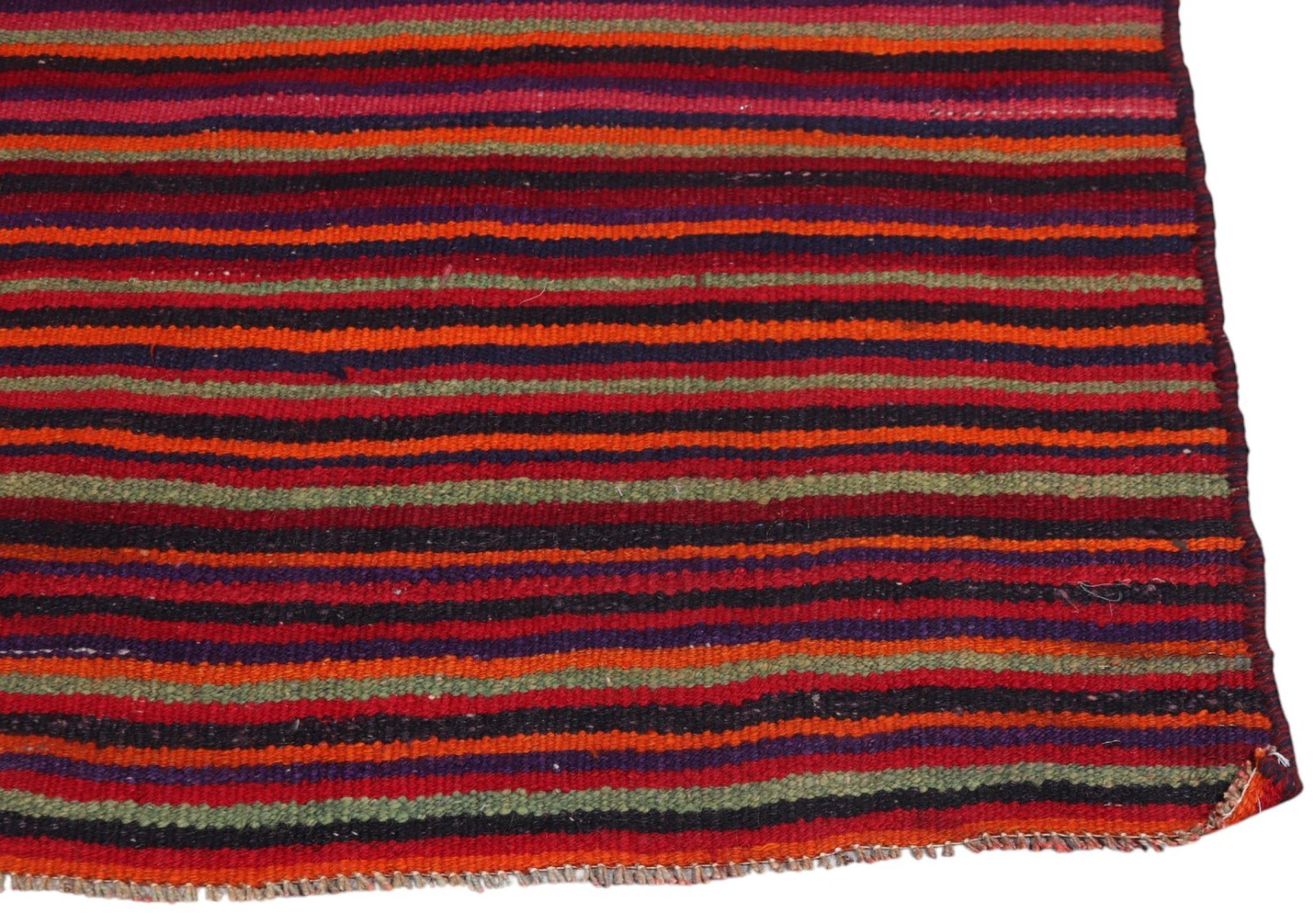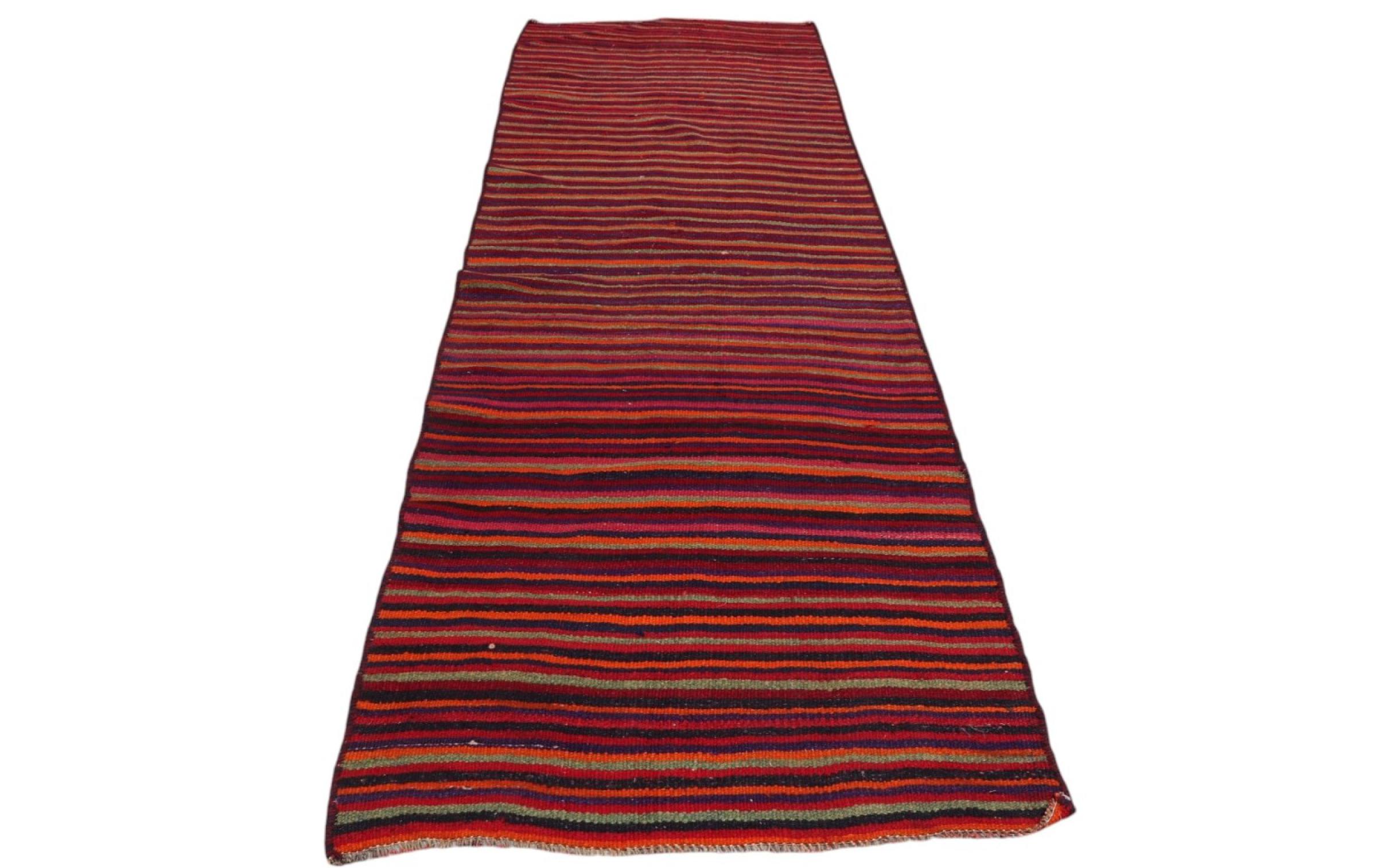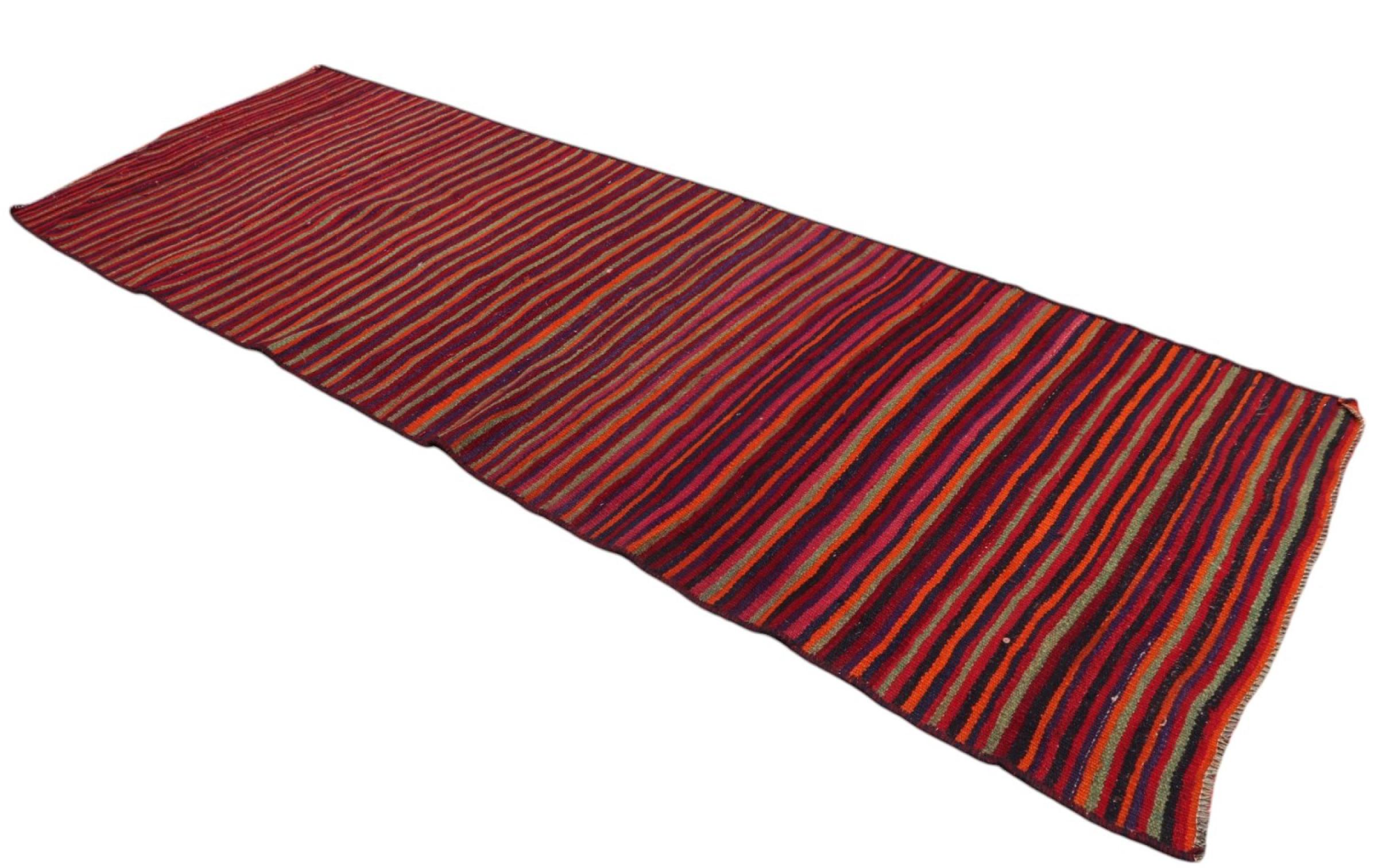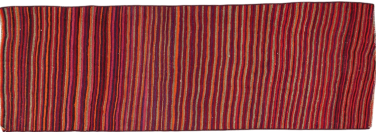Dieser Teppich ist als Flachgewebe von Hand am Webstuhl gefertigt worden. Als Flachgewebe bezeichnet man Teppiche, die keinen Flor besitzen. Wie der Name verspricht, werden diese Teppiche gewebt und nicht geknotet. Dies hat einen flachen Teppich mit strukturierter Oberfläche zur Folge. Flachgewebe sind nicht so weich und meist dünner als geknüpfte Teppiche. Gleichzeitig sind sie deutlich weniger aufwändig in der Fertigung und lassen sich meist von beiden Seiten (Vorder- und Rückseite) auslegen. Ihre Muster sind in der Regel geometrisch, was durch das Gewebe bedingt ist.