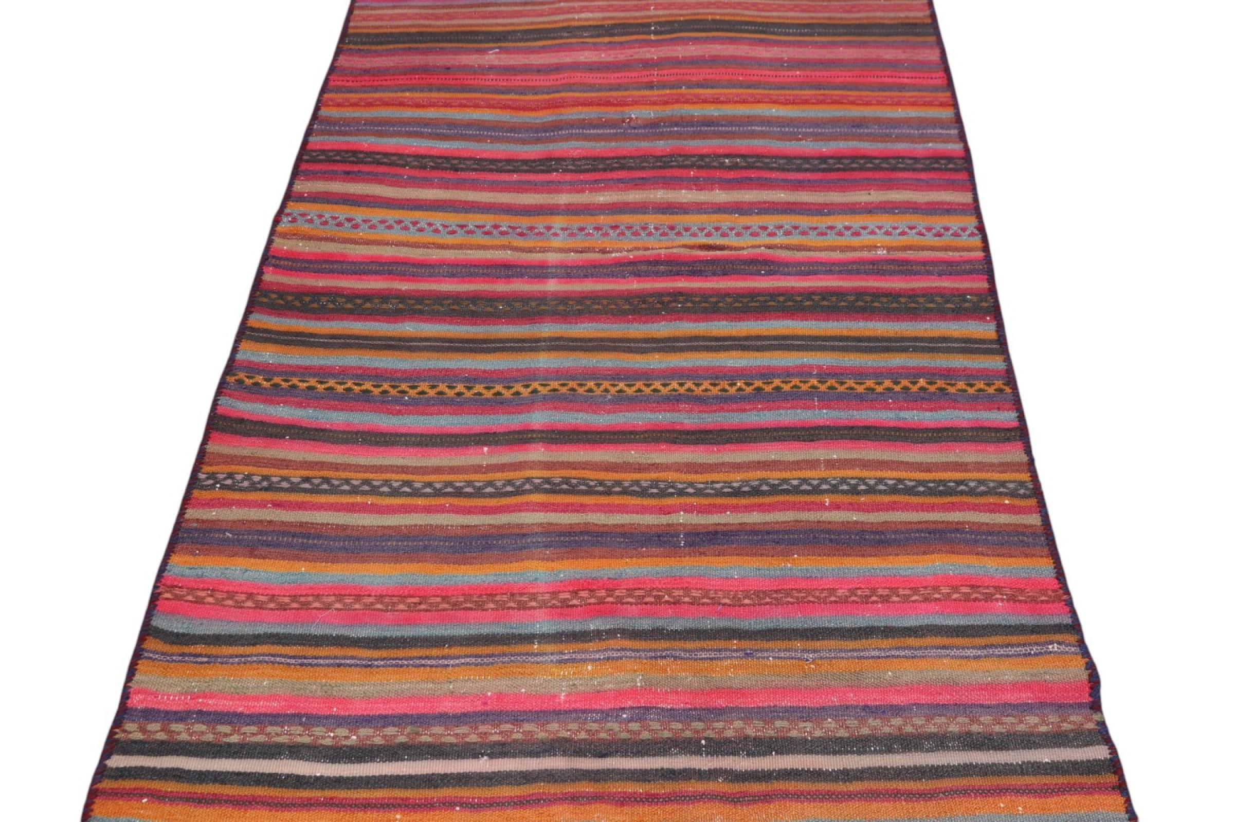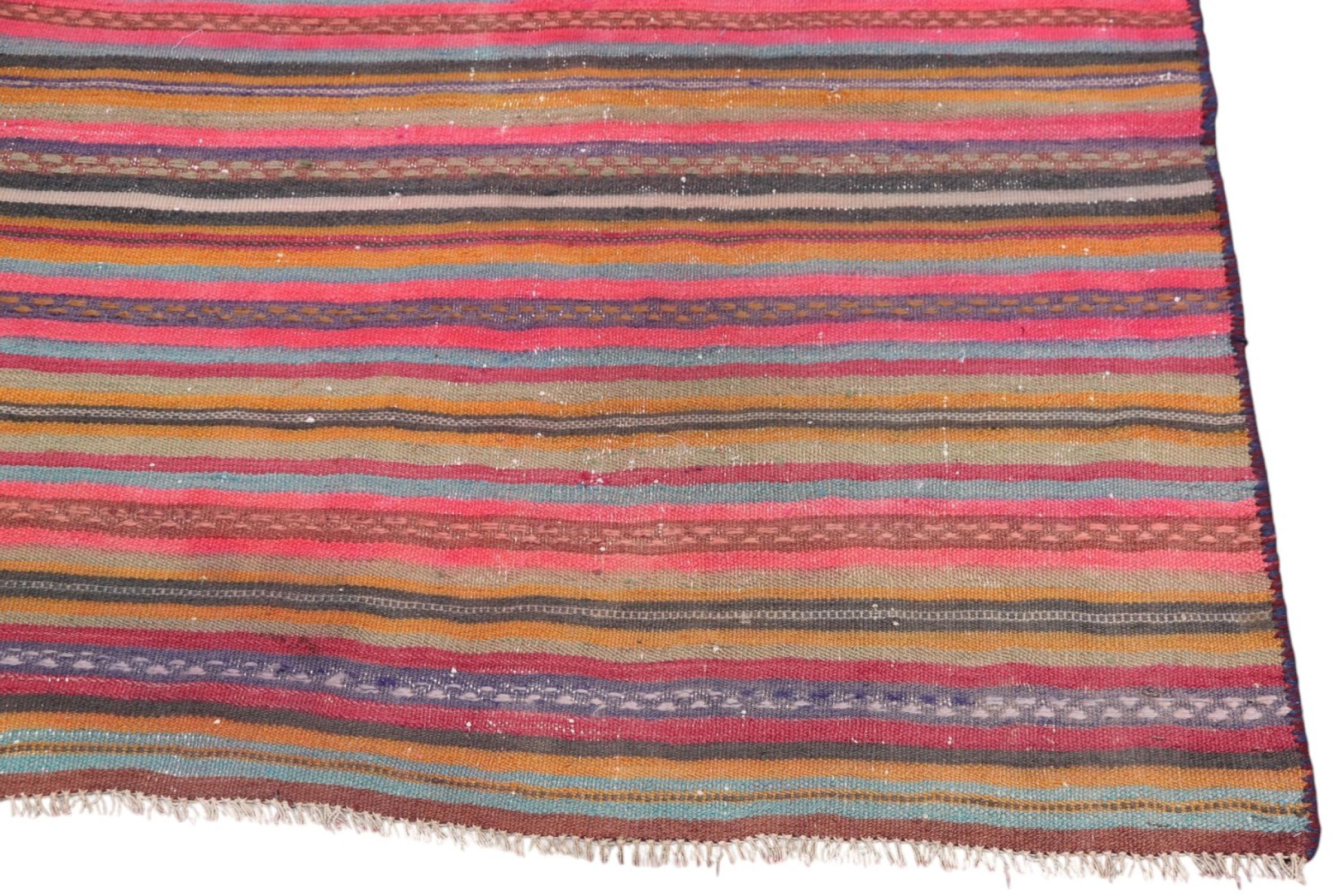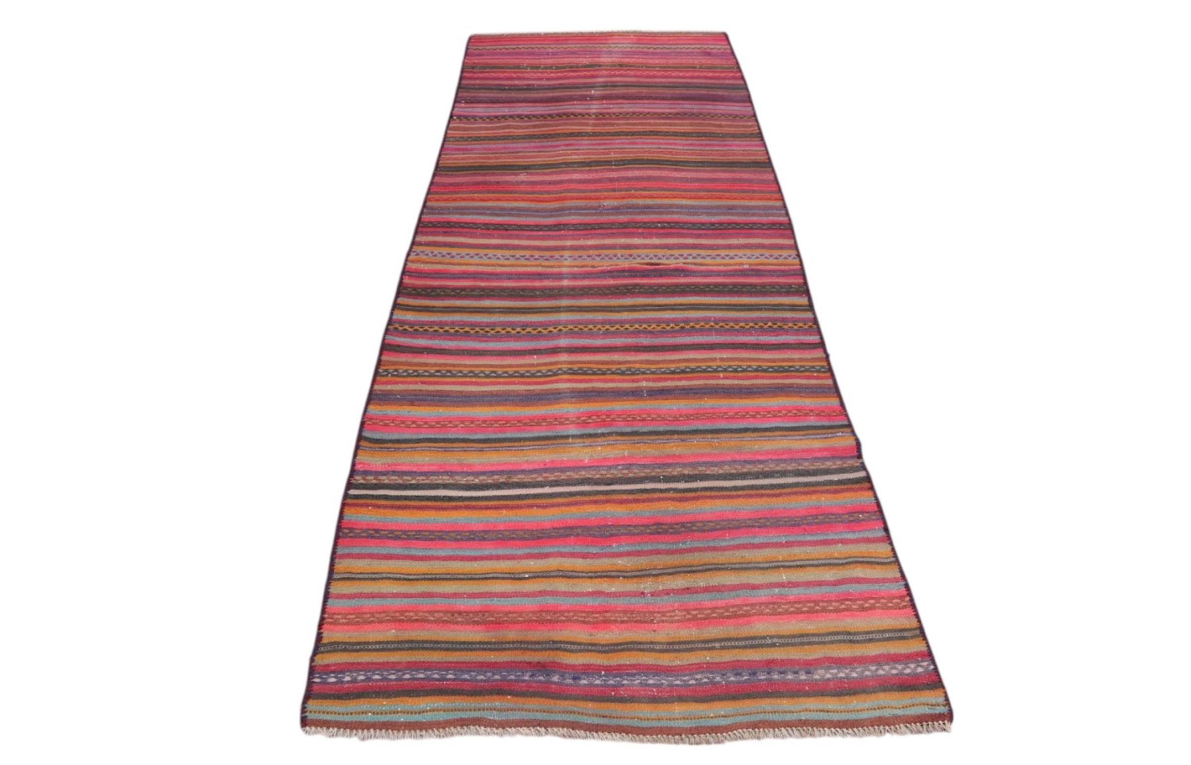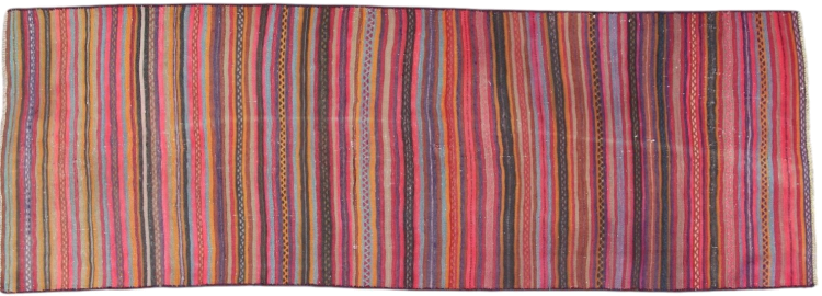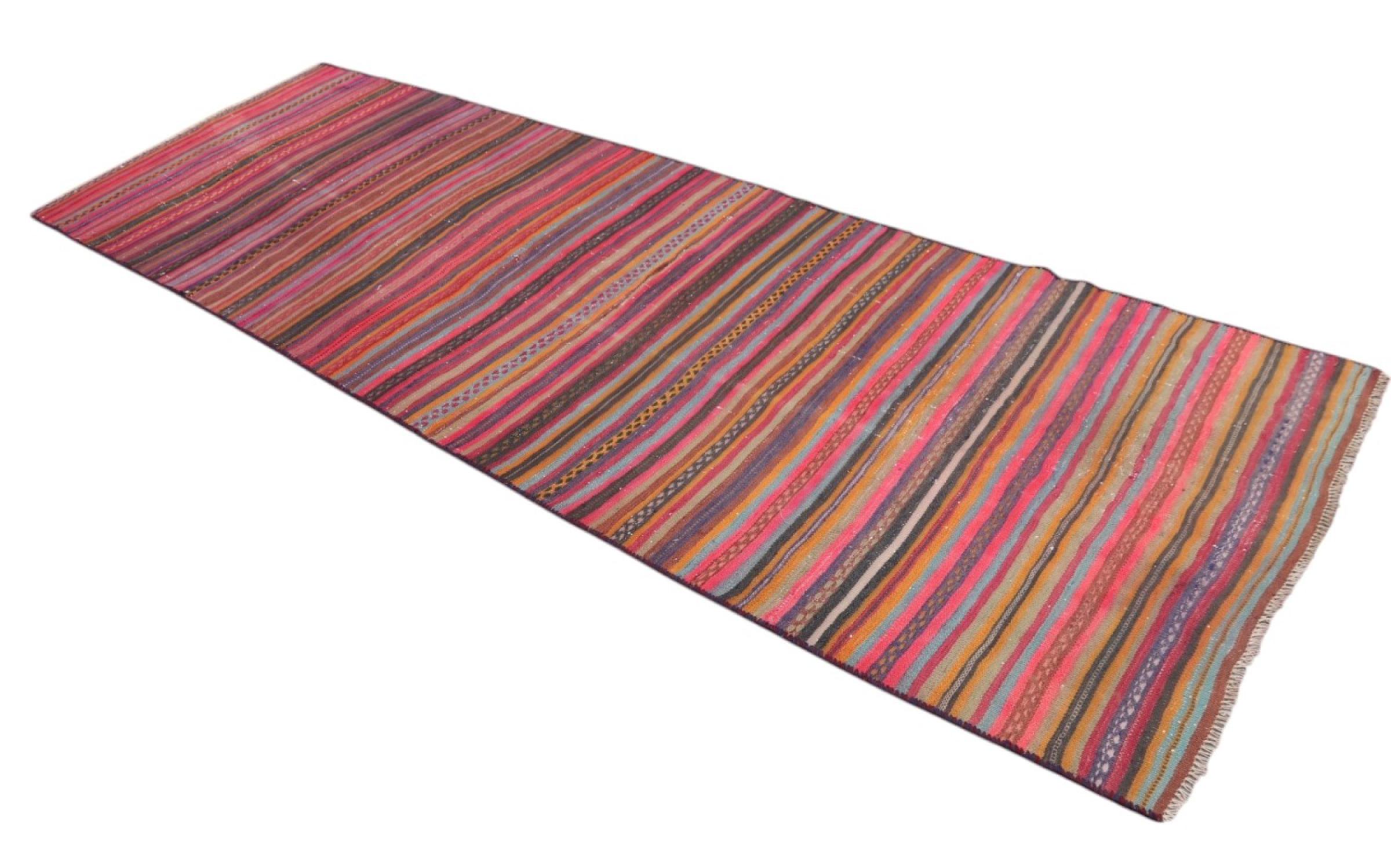 Dieser Teppich ist als Flachgewebe von Hand am Webstuhl gefertigt worden. Als Flachgewebe bezeichnet man Teppiche, die keinen Flor besitzen. Wie der Name verspricht, werden diese Teppiche gewebt und nicht geknotet. Dies hat einen flachen Teppich mit strukturierter Oberfläche zur Folge. Flachgewebe sind nicht so weich und meist dünner als geknüpfte Teppiche. Gleichzeitig sind sie deutlich weniger aufwändig in der Fertigung und lassen sich meist von beiden Seiten (Vorder- und Rückseite) auslegen. Ihre Muster sind in der Regel geometrisch, was durch das Gewebe bedingt ist.