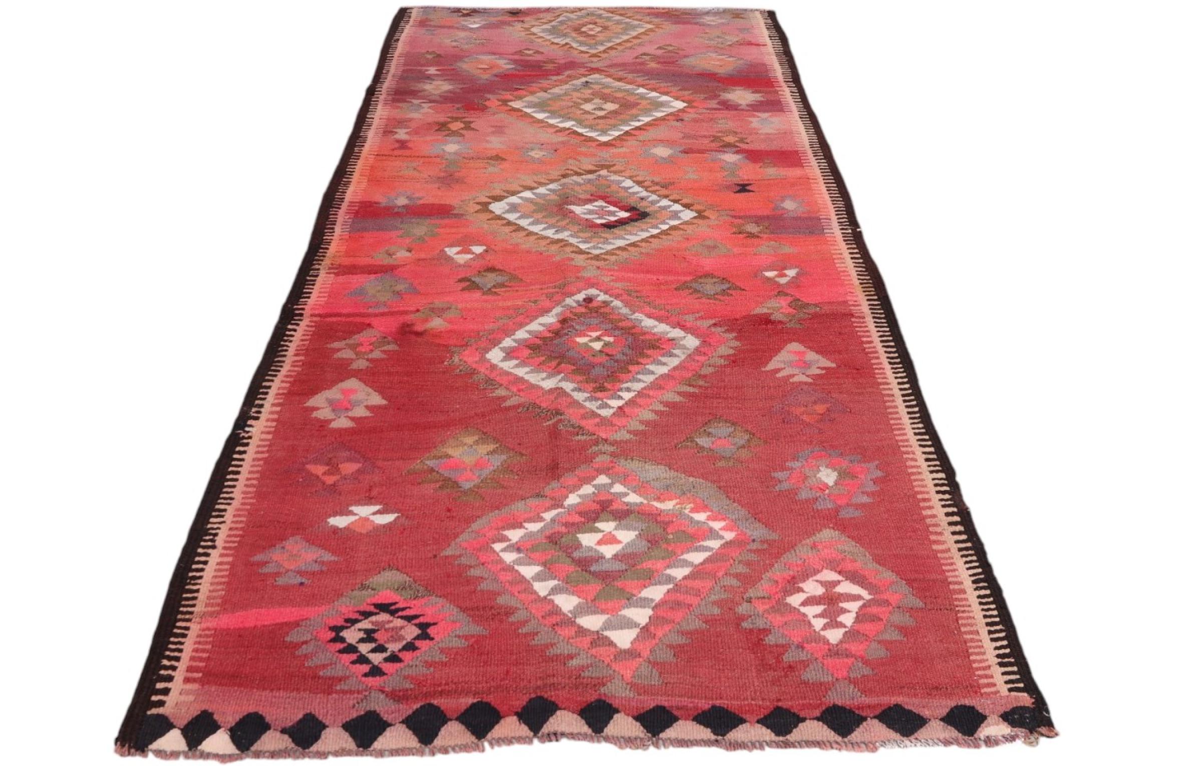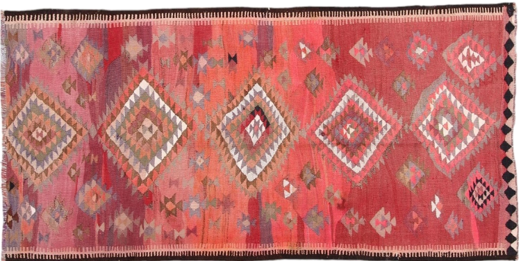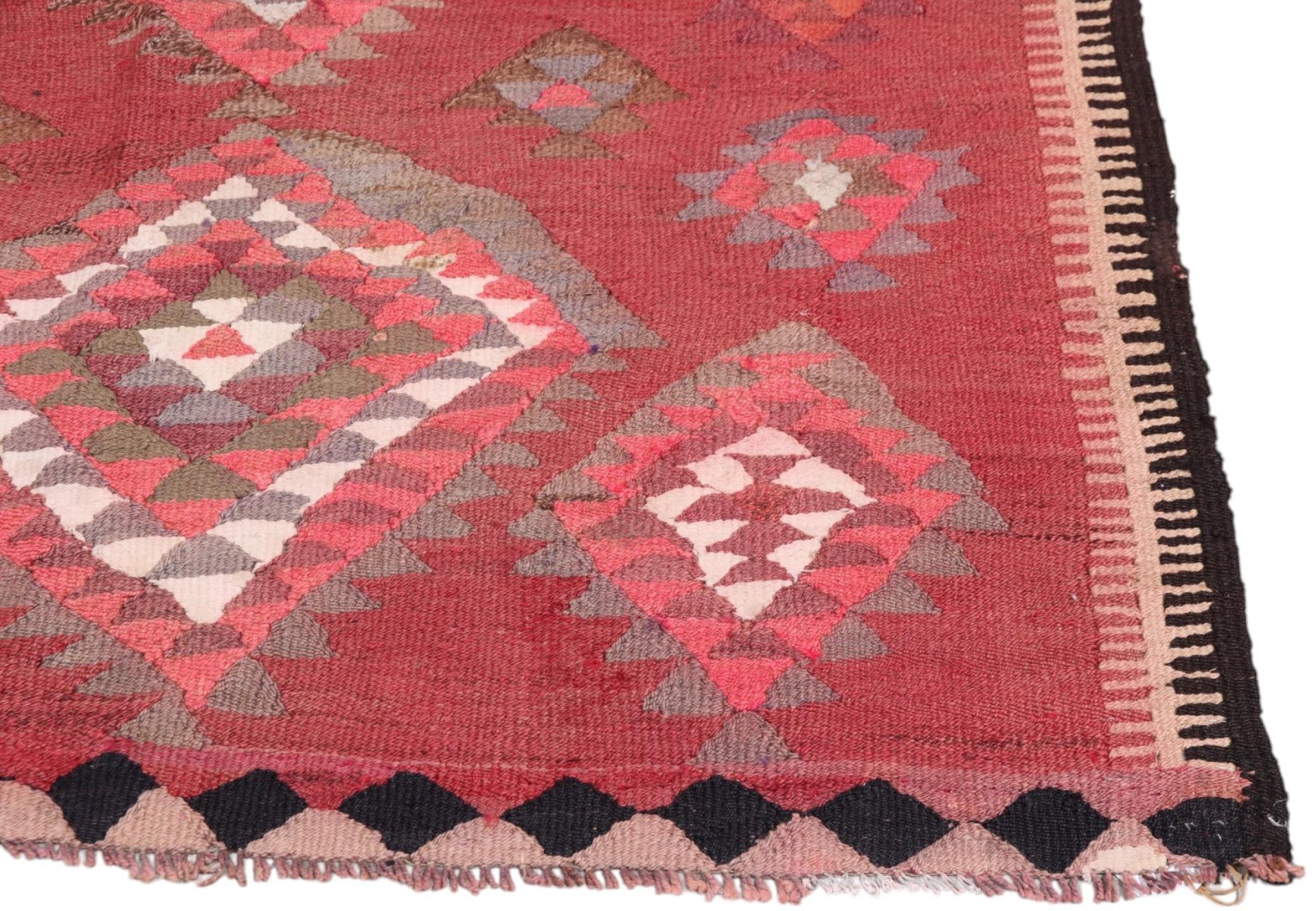 Dieser Teppich ist als Flachgewebe von Hand am Webstuhl gefertigt worden. Als Flachgewebe bezeichnet man Teppiche, die keinen Flor besitzen. Wie der Name verspricht, werden diese Teppiche gewebt und nicht geknotet. Dies hat einen flachen Teppich mit strukturierter Oberfläche zur Folge. Flachgewebe sind nicht so weich und meist dünner als geknüpfte Teppiche. Gleichzeitig sind sie deutlich weniger aufwändig in der Fertigung und lassen sich meist von beiden Seiten (Vorder- und Rückseite) auslegen. Ihre Muster sind in der Regel geometrisch, was durch das Gewebe bedingt ist.
