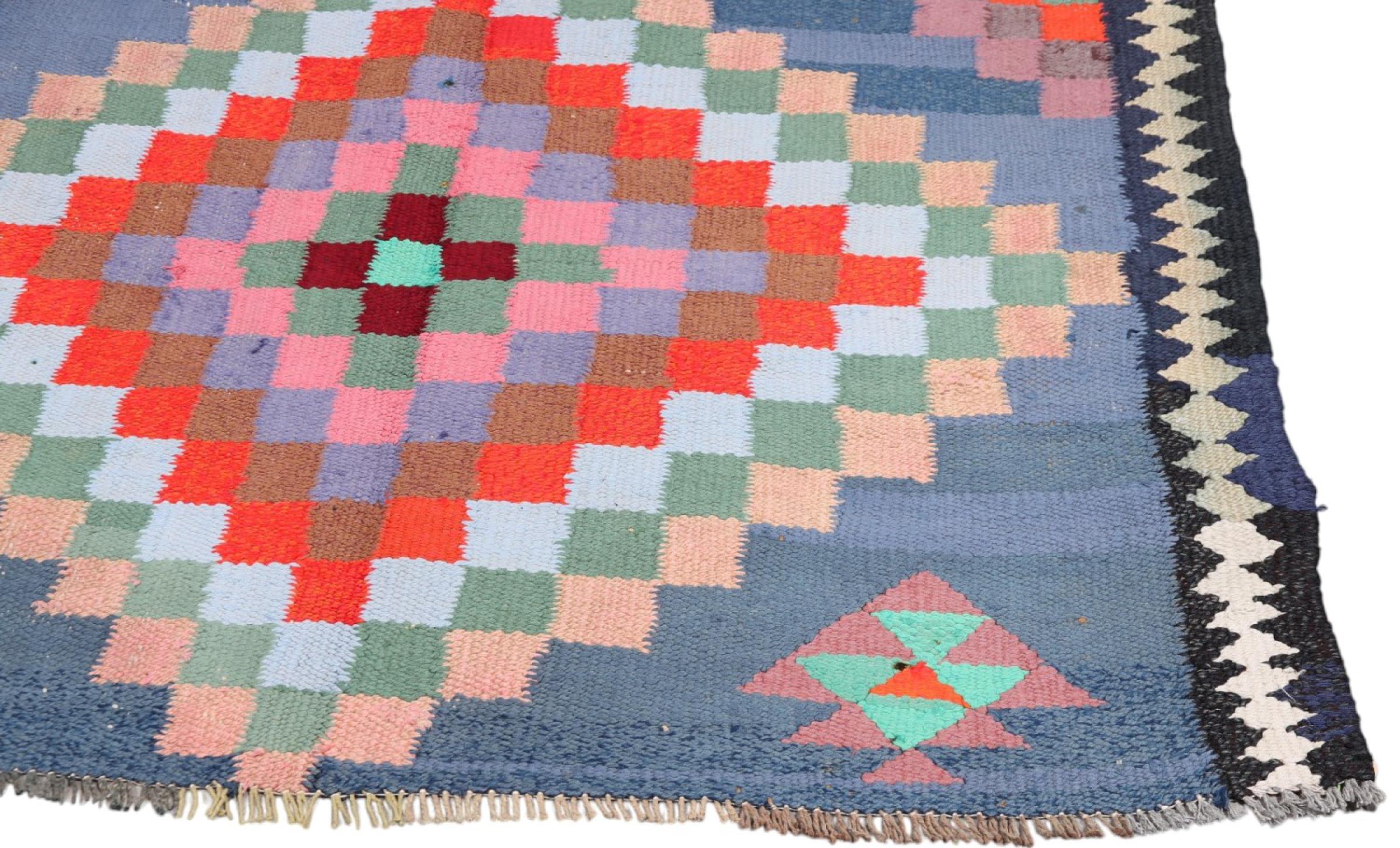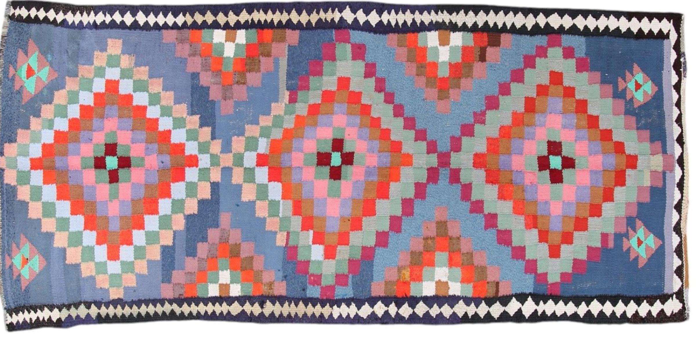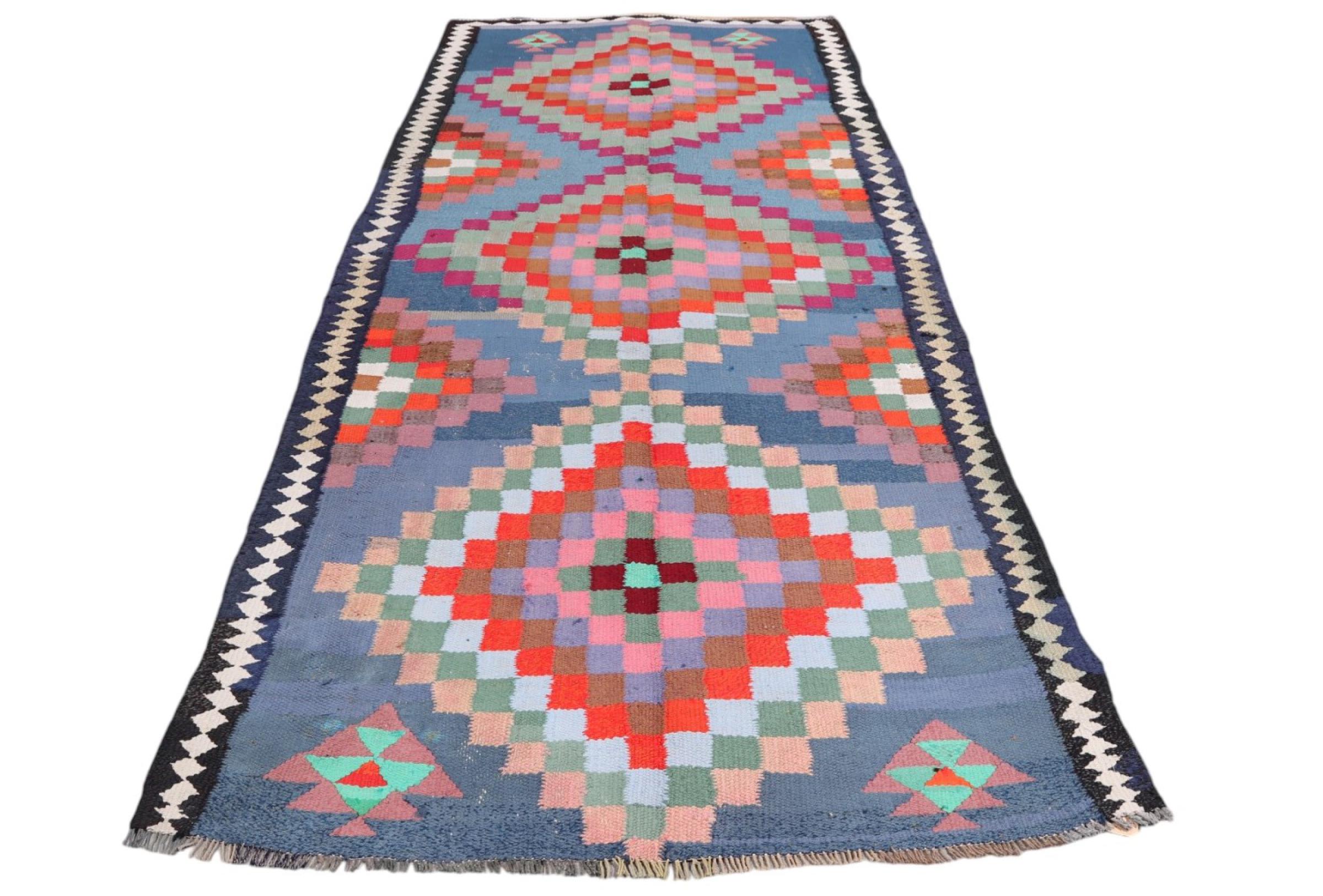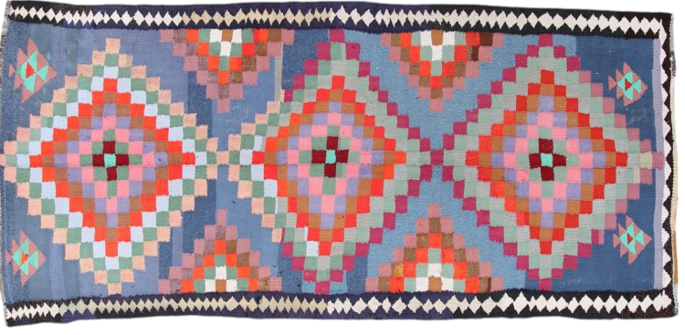 Dieser Teppich ist als Flachgewebe von Hand am Webstuhl gefertigt worden. Als Flachgewebe bezeichnet man Teppiche, die keinen Flor besitzen. Wie der Name verspricht, werden diese Teppiche gewebt und nicht geknotet. Dies hat einen flachen Teppich mit strukturierter Oberfläche zur Folge. Flachgewebe sind nicht so weich und meist dünner als geknüpfte Teppiche. Gleichzeitig sind sie deutlich weniger aufwändig in der Fertigung und lassen sich meist von beiden Seiten (Vorder- und Rückseite) auslegen. Ihre Muster sind in der Regel geometrisch, was durch das Gewebe bedingt ist.