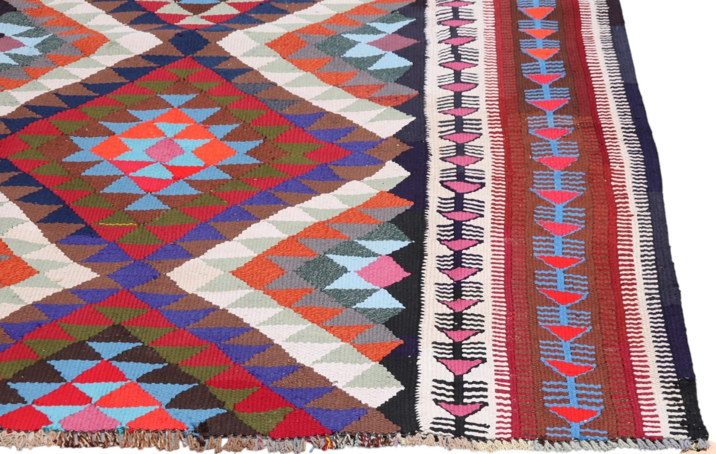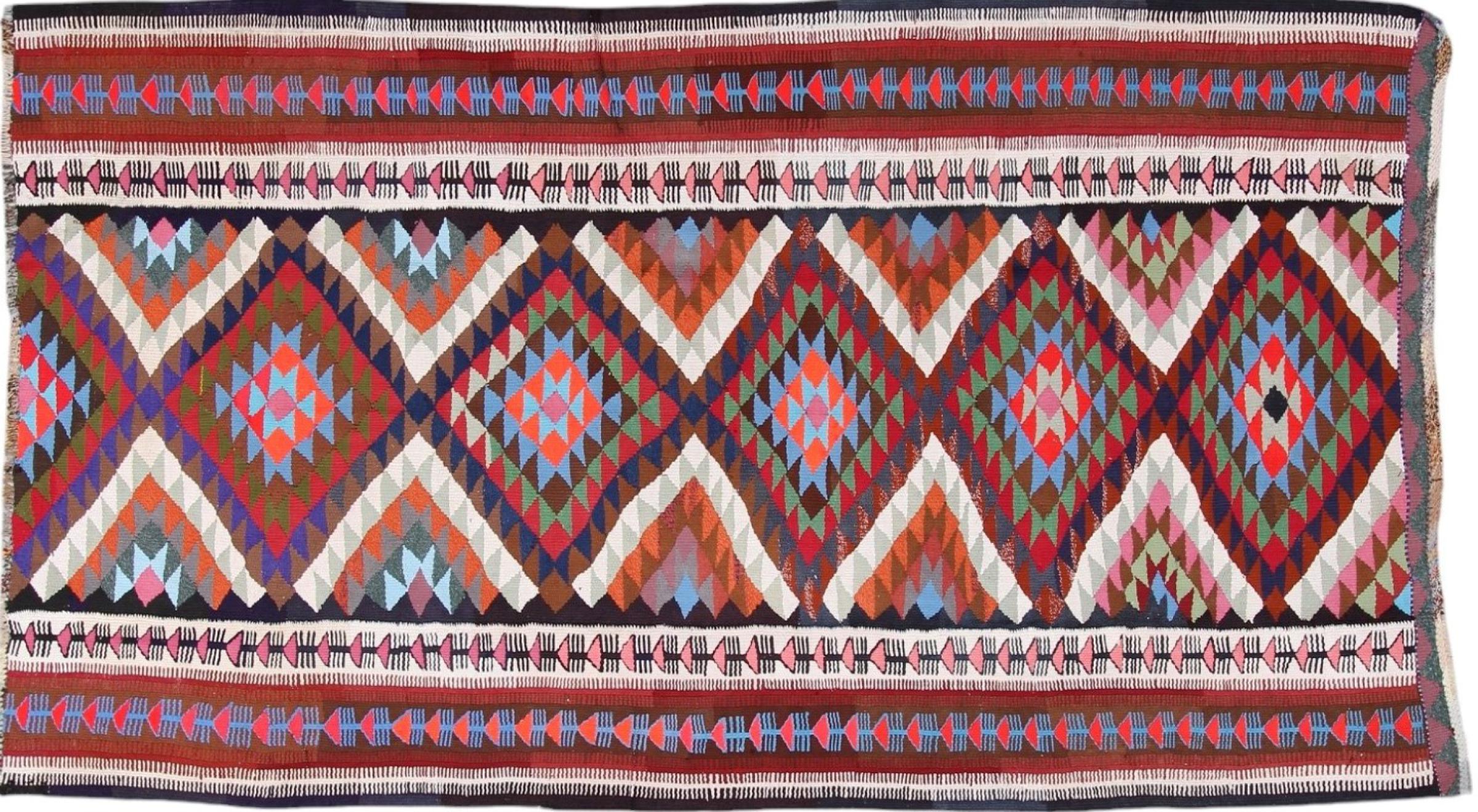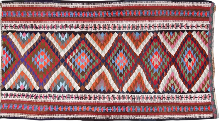 Dieser Teppich ist als Flachgewebe von Hand am Webstuhl gefertigt worden. Als Flachgewebe bezeichnet man Teppiche, die keinen Flor besitzen. Wie der Name verspricht, werden diese Teppiche gewebt und nicht geknotet. Dies hat einen flachen Teppich mit strukturierter Oberfläche zur Folge. Flachgewebe sind nicht so weich und meist dünner als geknüpfte Teppiche. Gleichzeitig sind sie deutlich weniger aufwändig in der Fertigung und lassen sich meist von beiden Seiten (Vorder- und Rückseite) auslegen. Ihre Muster sind in der Regel geometrisch, was durch das Gewebe bedingt ist.