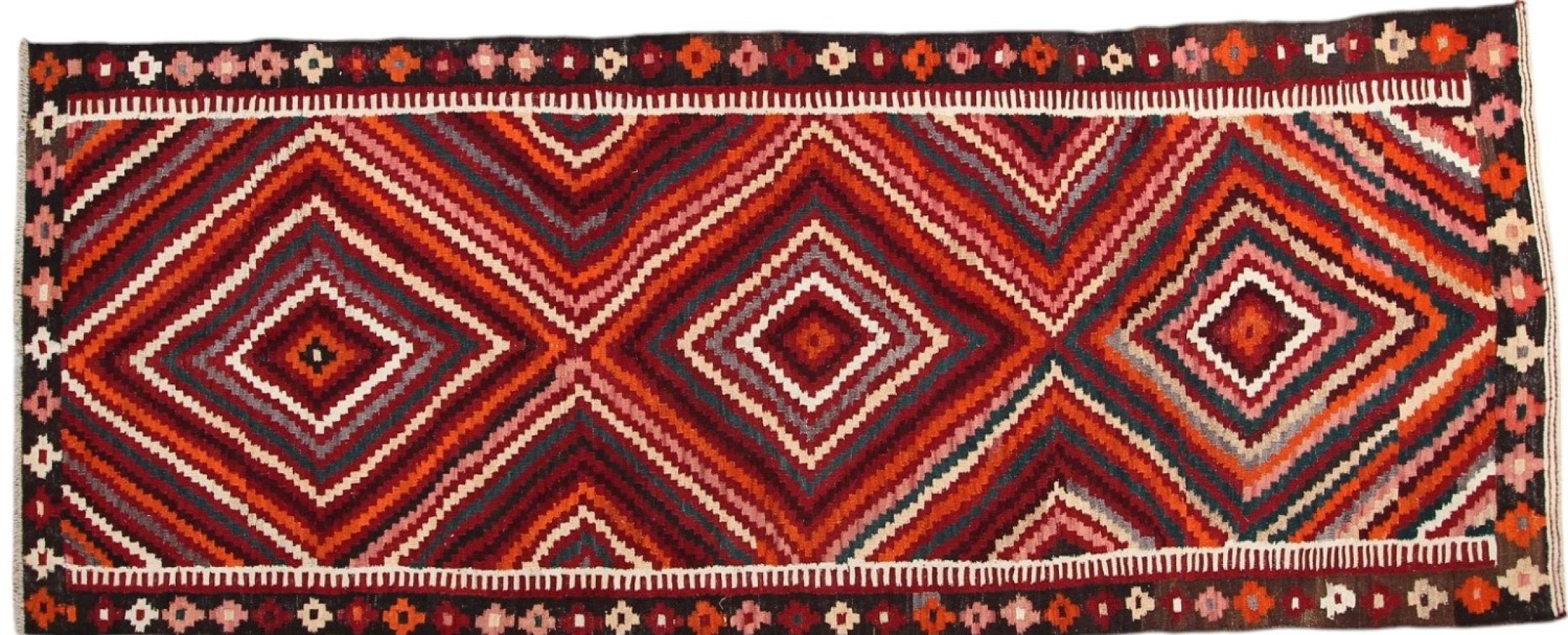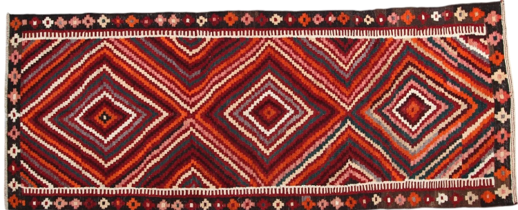 Dieser Teppich ist als Flachgewebe von Hand am Webstuhl gefertigt worden. Als Flachgewebe bezeichnet man Teppiche, die keinen Flor besitzen. Wie der Name verspricht, werden diese Teppiche gewebt und nicht geknotet. Dies hat einen flachen Teppich mit strukturierter Oberfläche zur Folge. Flachgewebe sind nicht so weich und meist dünner als geknüpfte Teppiche. Gleichzeitig sind sie deutlich weniger aufwändig in der Fertigung und lassen sich meist von beiden Seiten (Vorder- und Rückseite) auslegen. Ihre Muster sind in der Regel geometrisch, was durch das Gewebe bedingt ist.