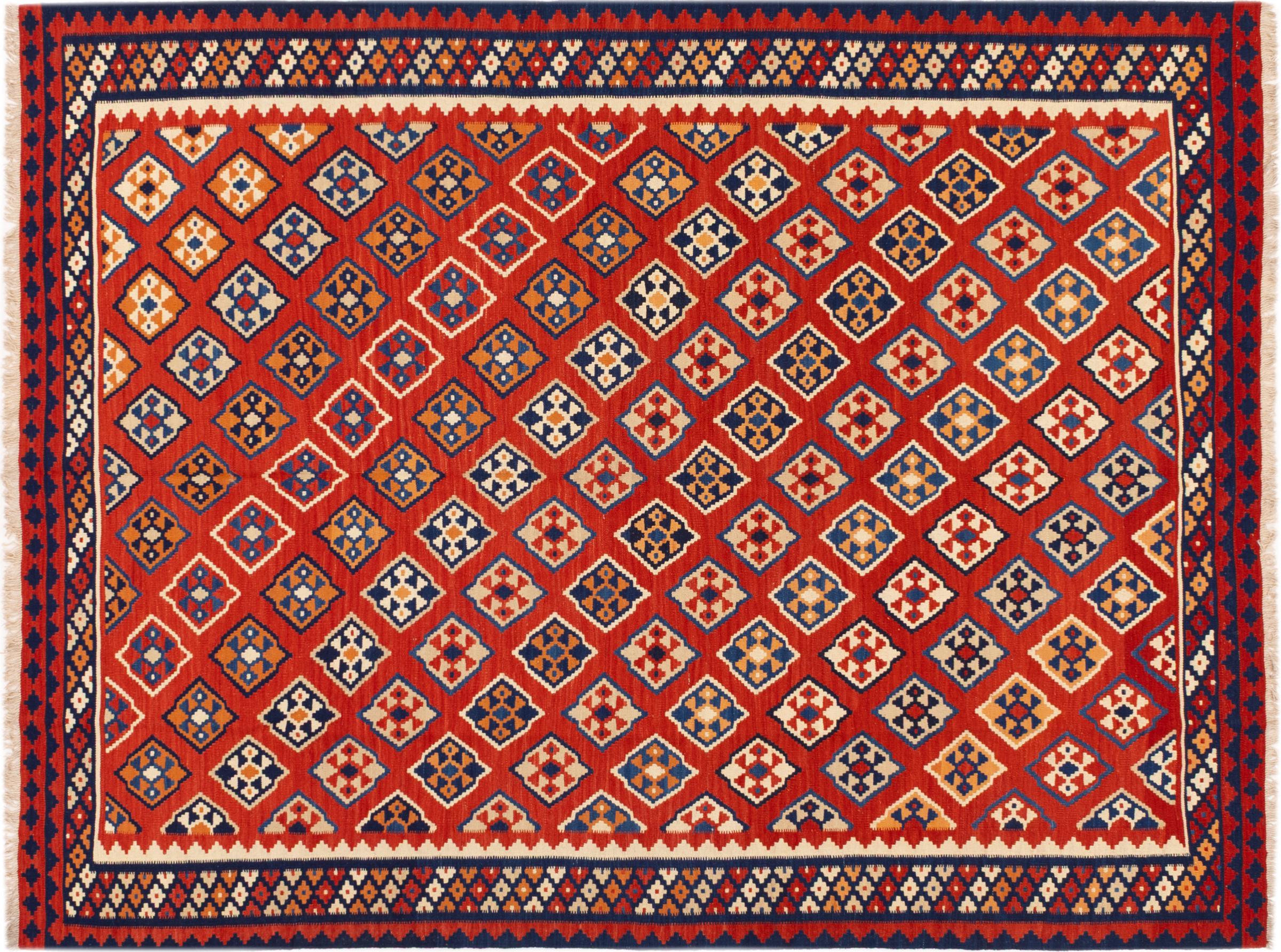 Dieser Teppich ist als Flachgewebe von Hand am Webstuhl gefertigt worden. Als Flachgewebe bezeichnet man Teppiche, die keinen Flor besitzen. Wie der Name verspricht, werden diese Teppiche gewebt und nicht geknotet. Dies hat einen flachen Teppich mit strukturierter Oberfläche zur Folge. Flachgewebe sind nicht so weich und meist dünner als geknüpfte Teppiche. Gleichzeitig sind sie deutlich weniger aufwändig in der Fertigung und lassen sich meist von beiden Seiten (Vorder- und Rückseite) auslegen. Ihre Muster sind in der Regel geometrisch, was durch das Gewebe bedingt ist.