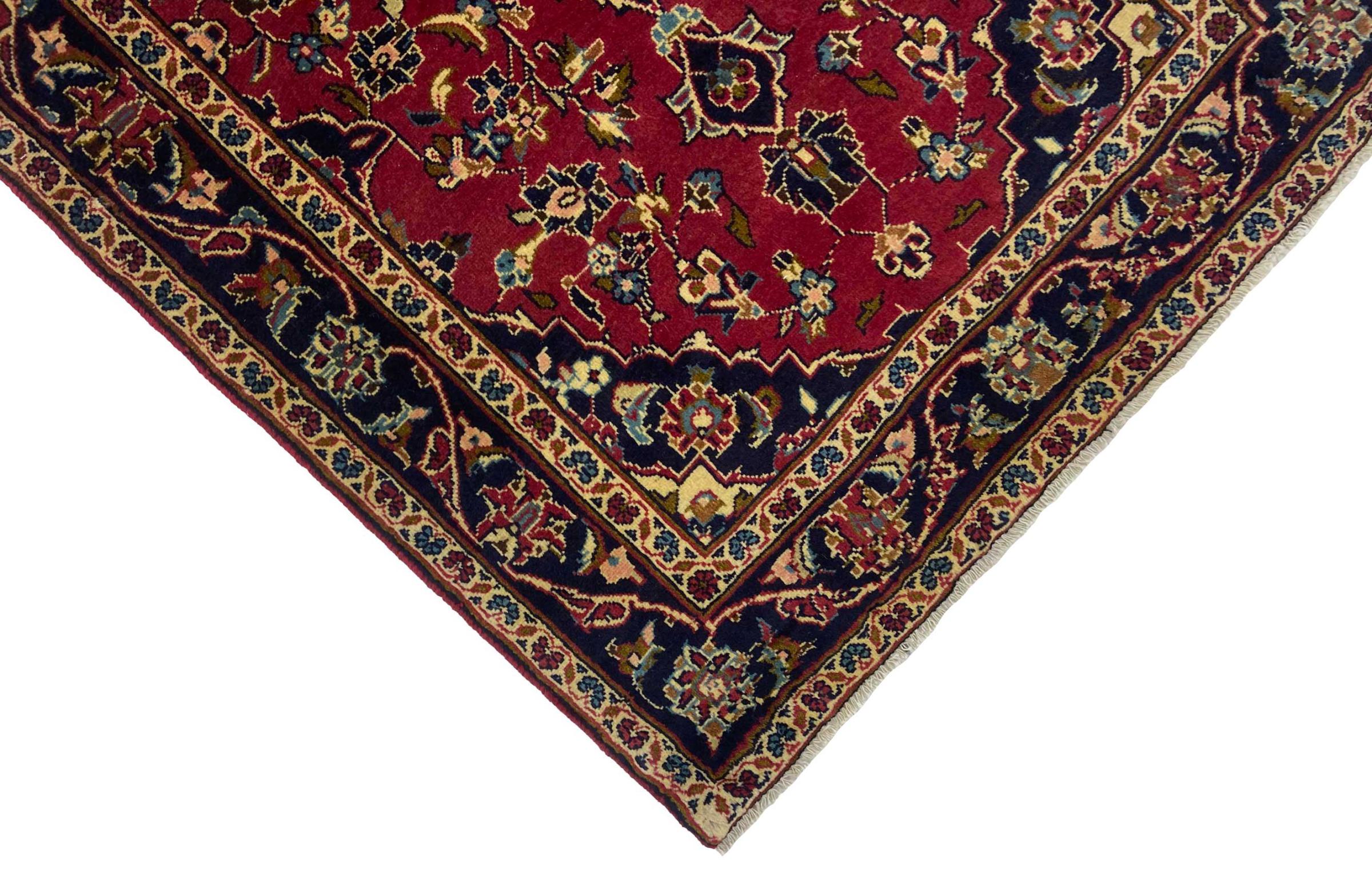Dieser Teppich aus Keshan (Kashan) ist in seinem sehr traditionellen und typisch persischen Design mit wunderschönen Ornamenten gehalten. Keshan-Teppiche erfreuen sich aufgrund ihres außergewöhnlich eleganten Designs großer Beliebtheit. Diese Teppiche stammen aus Keshan, einer Stadt an der alten Seidenstraße. Dieser Teppich wurde aus hochwertiger Schafwolle von Hand geknüpft und wird ein einzigartiges Highlight in Ihrem Zuhause sein.