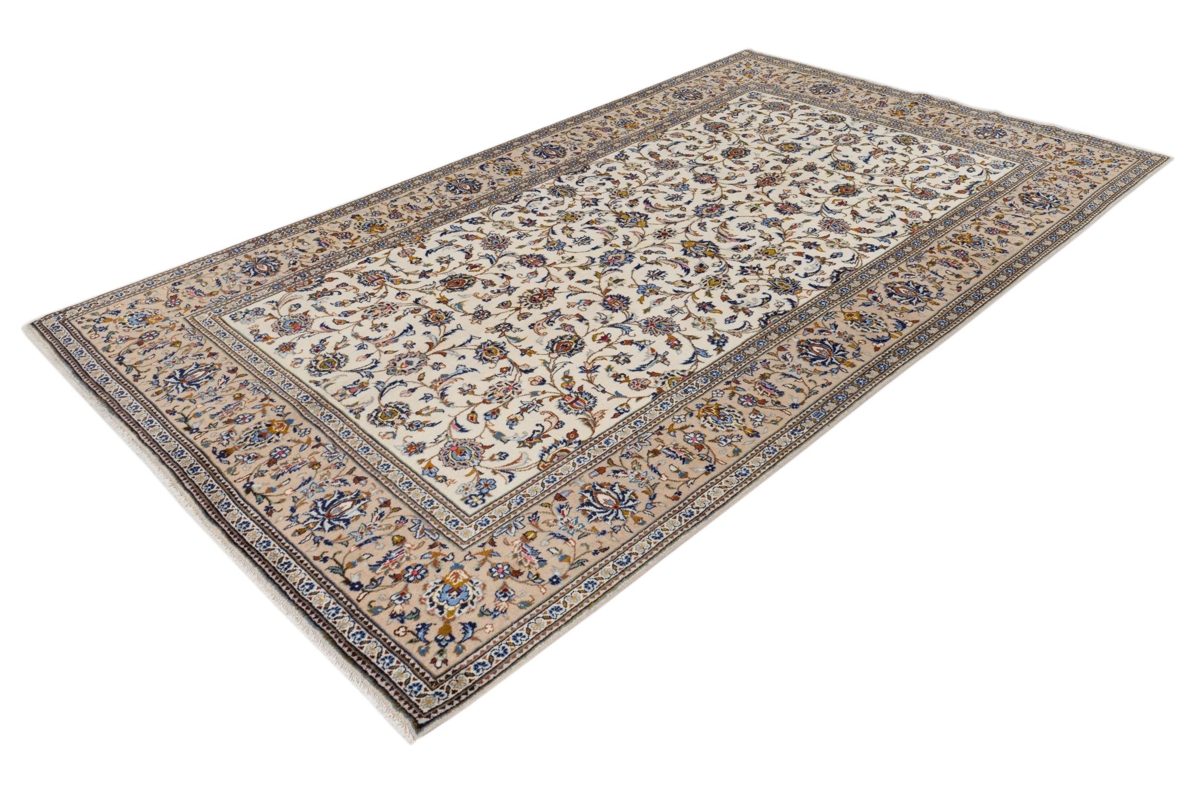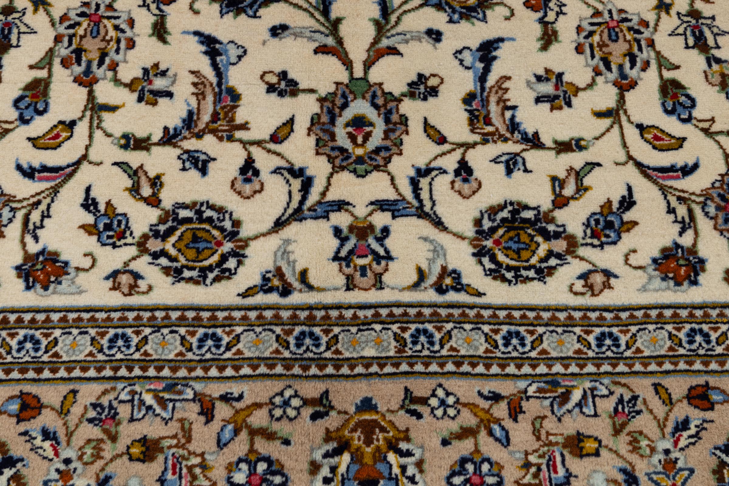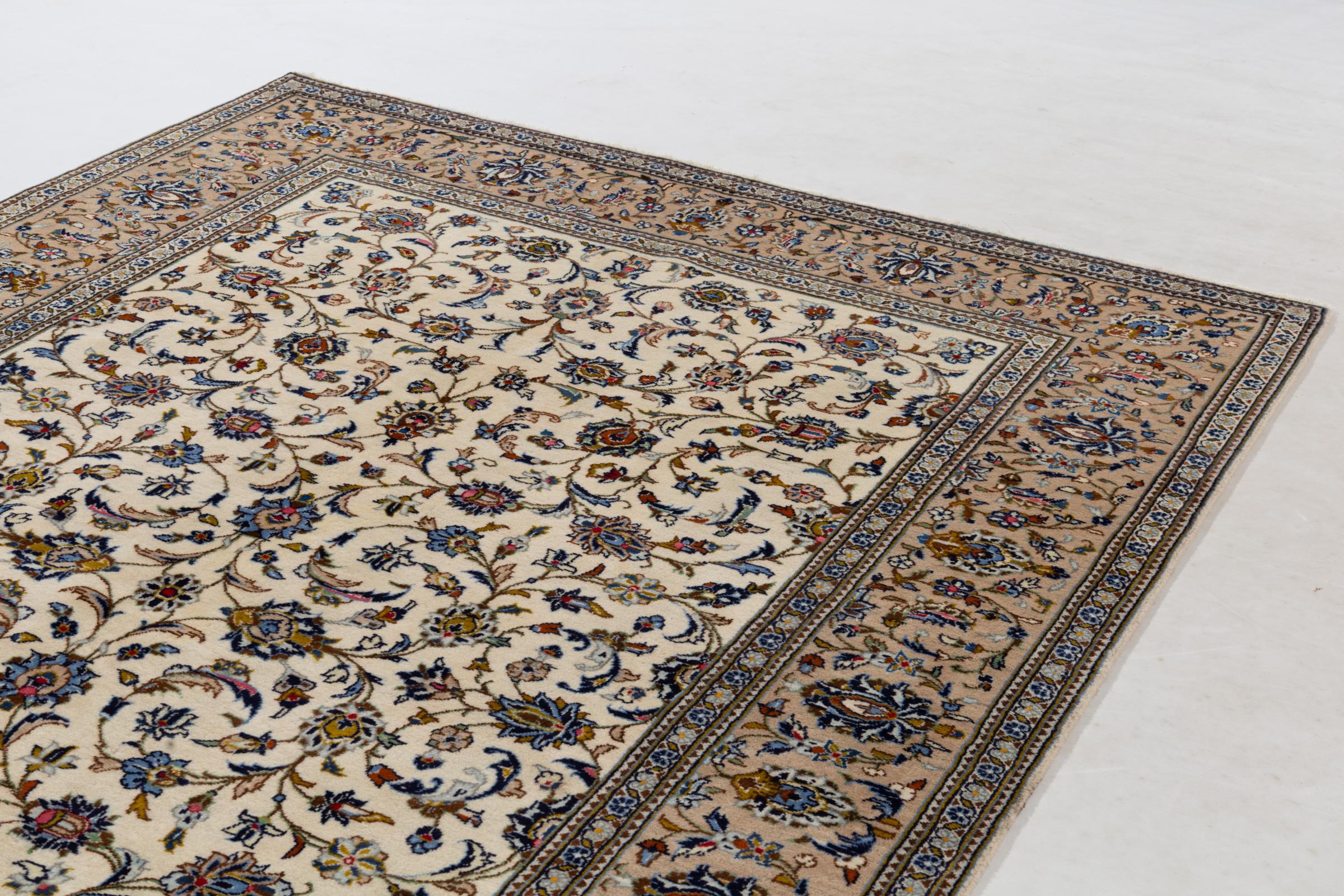 Dieser antike Keshan Teppich ist ein wunderschönes Einzelstück. Er wurde vor Jahrzehnten in der Stadt Kashan im Iran von Hand geknüpft. Seine Ornamente sind in beständigen und starken Farben mit viel Erfahrung geknüpft worden. Dank der hohen Knotendichte erscheinen die Muster fein und lebendig. Der Teppich wurde von unseren Experten vollständig überprüft, gereinigt und gepflegt. Dieser antike Perserteppich aus einer der beliebtesten Provenienzen ist ein äußerst wertvolles Stück traditionellen Kunsthandwerks der Geschichte Persiens.