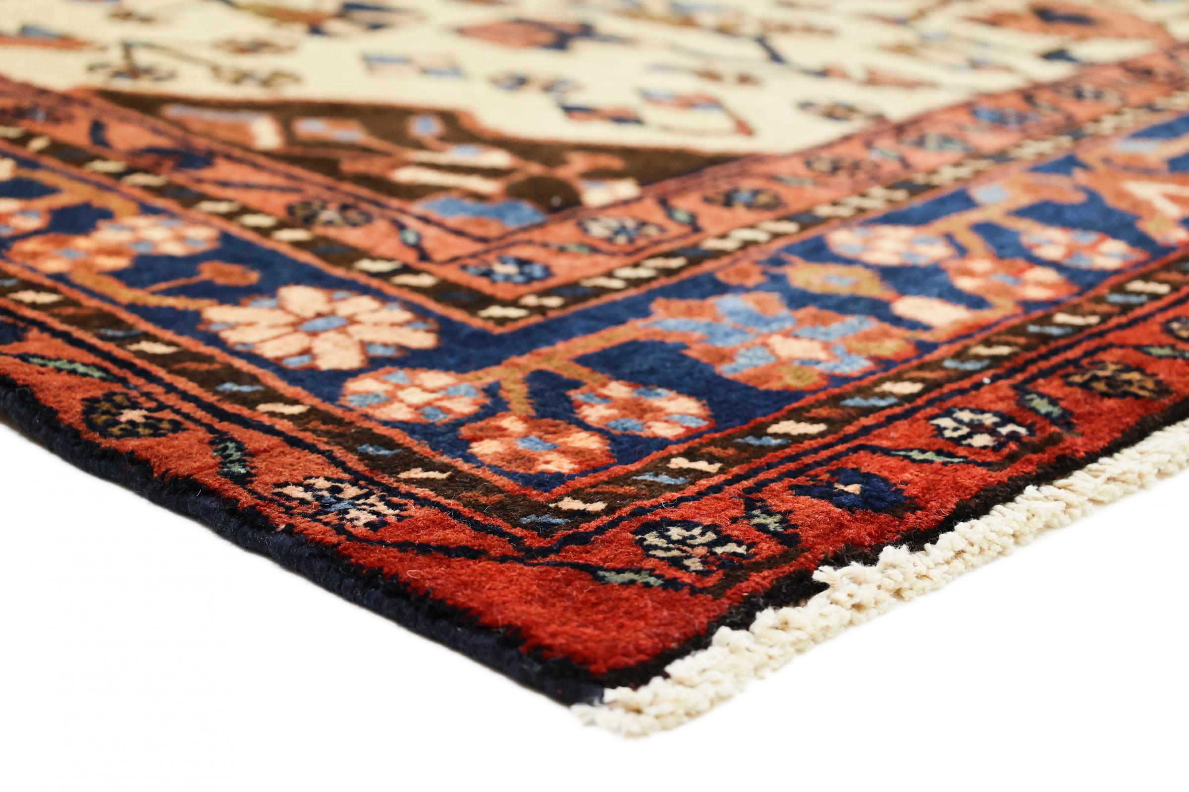Dieser Perser Nahavand Teppich wurde im westlichen Iran handgeknüpft. Er ist robust und eignet sich damit auch in Bereichen häufiger Nutzung. Entscheidend sind hier die hochwertige Wolle, die glänzenden Farben und die nachhaltige Knotendichte. Ein bisschen Blau darf in keinem Nahavand fehlen.