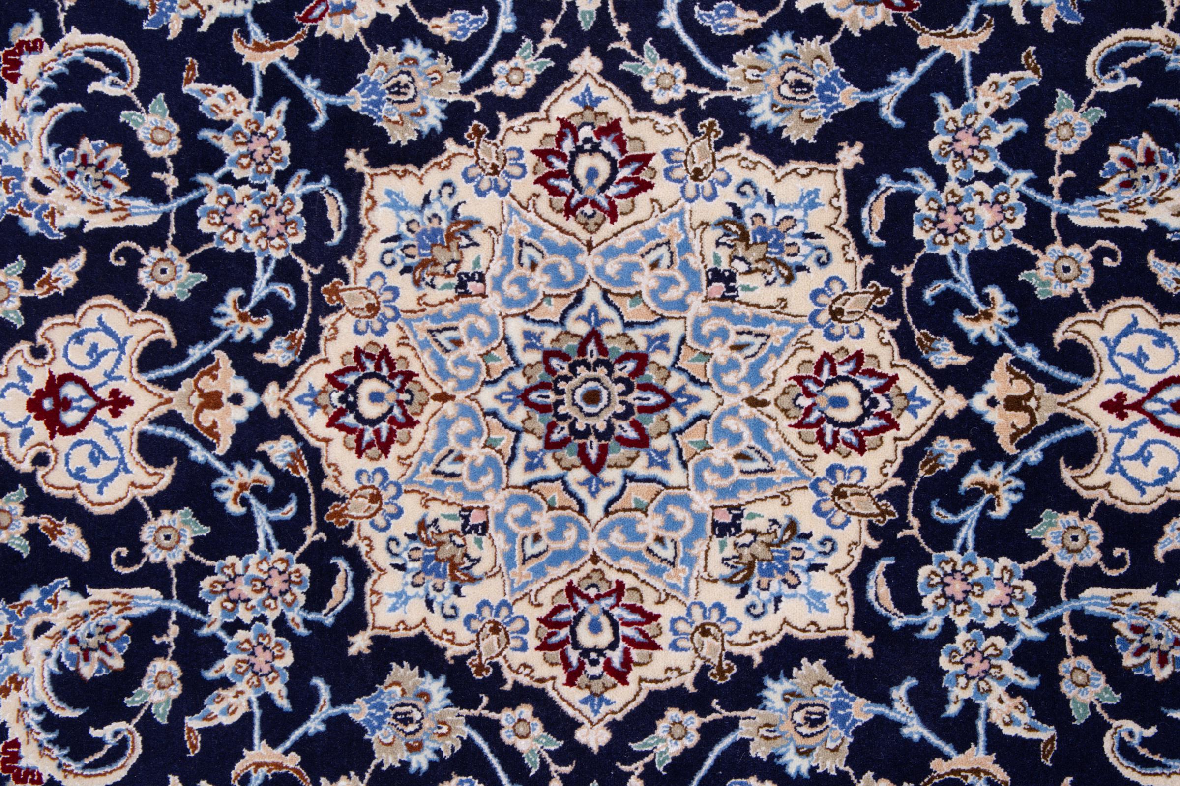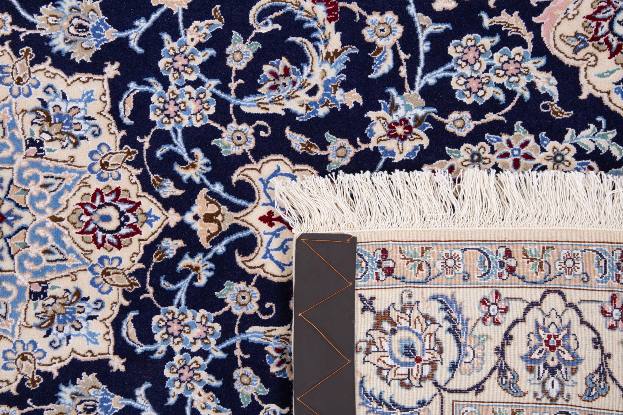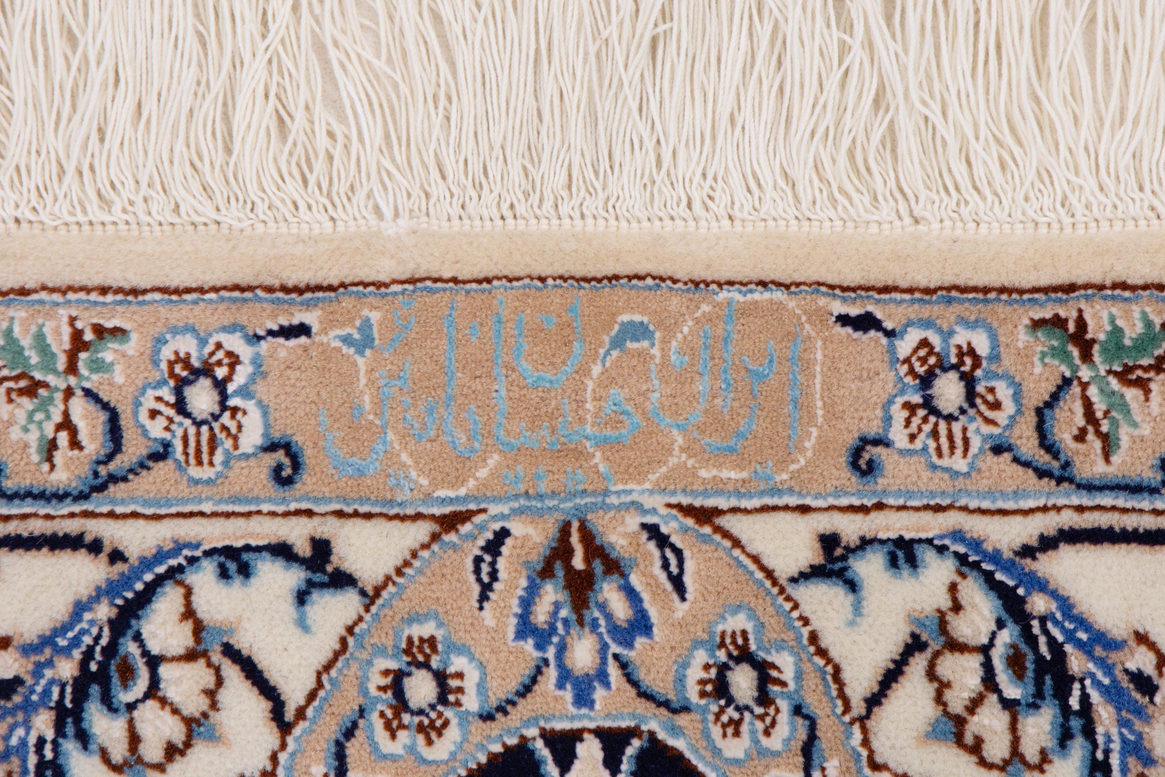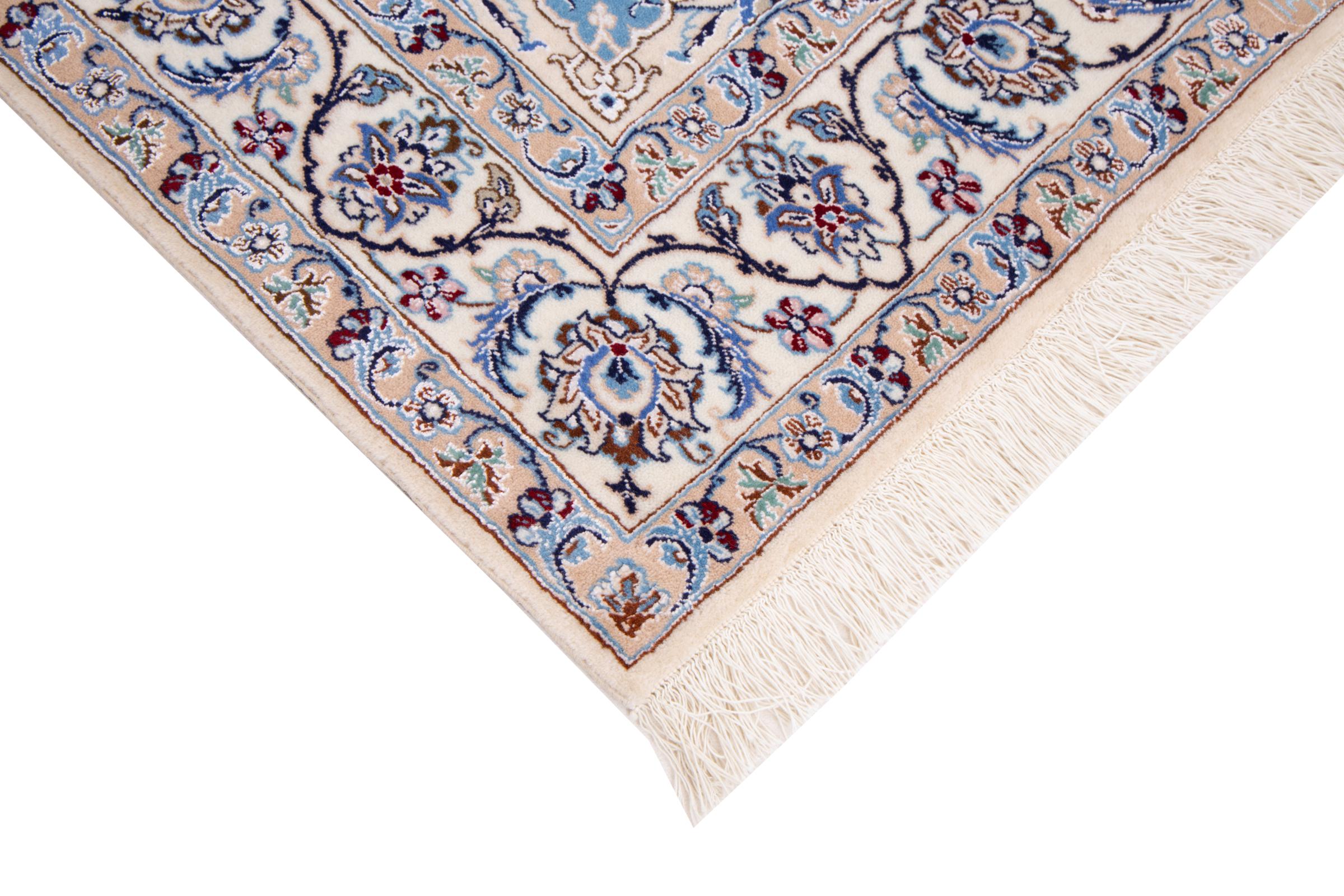Dieser Nain Teppich verbindet Qualität, Tradition und ein unverkennbares Design. Er wurde in der gleichnamigen Wüstenstadt Nain aus hochwertiger Korkwolle und Naturseide handgeknüpft. Liebhabern wertvoller Teppiche aus dem Iran wird dieser Perserteppich gefallen. Mit