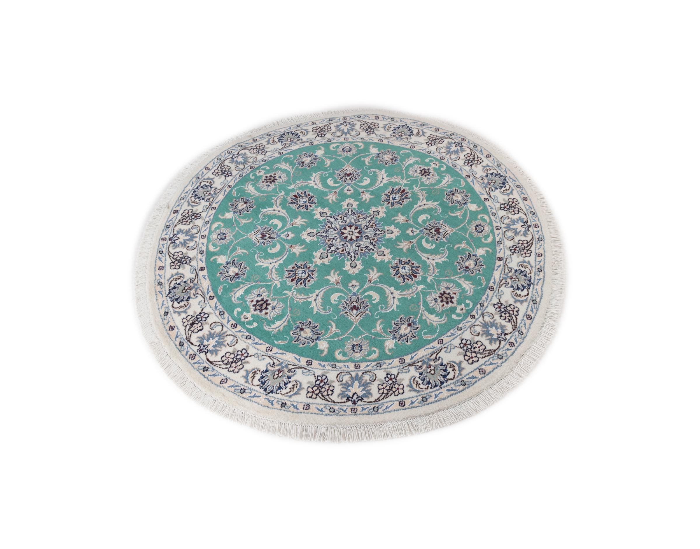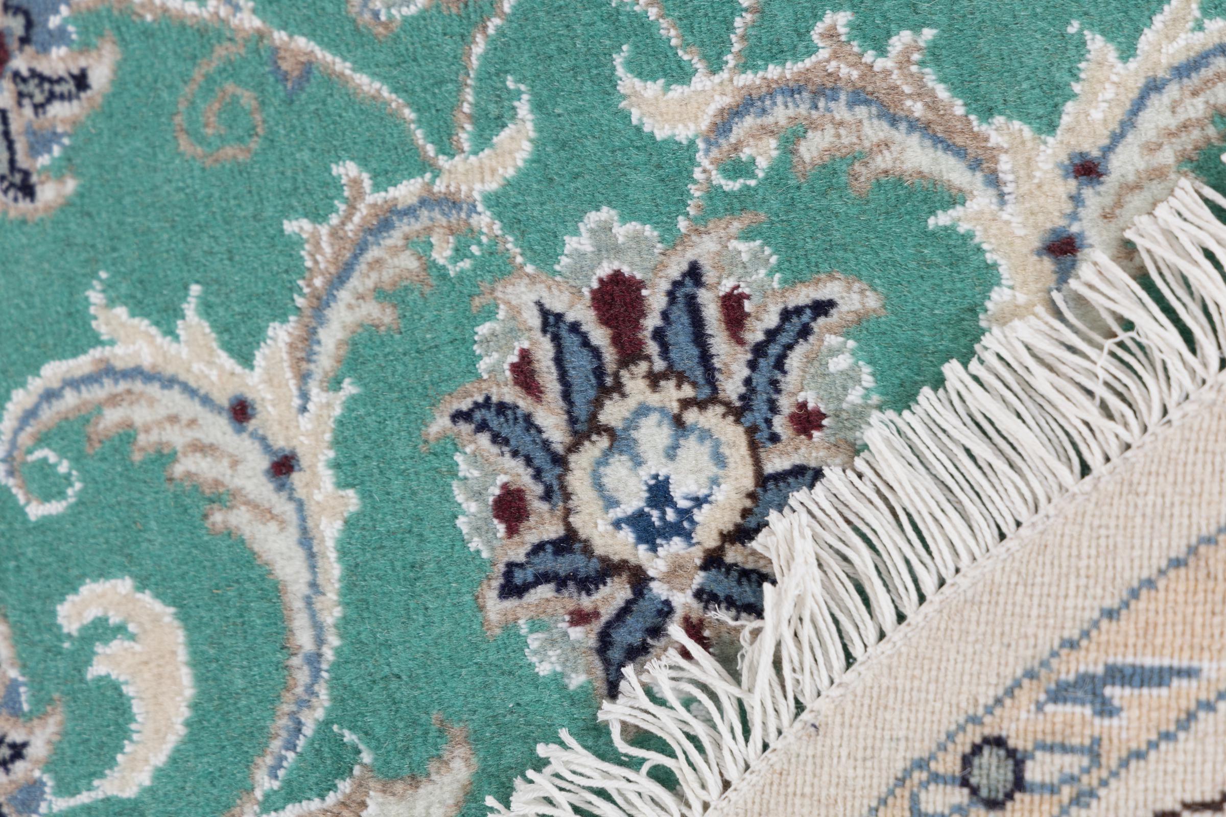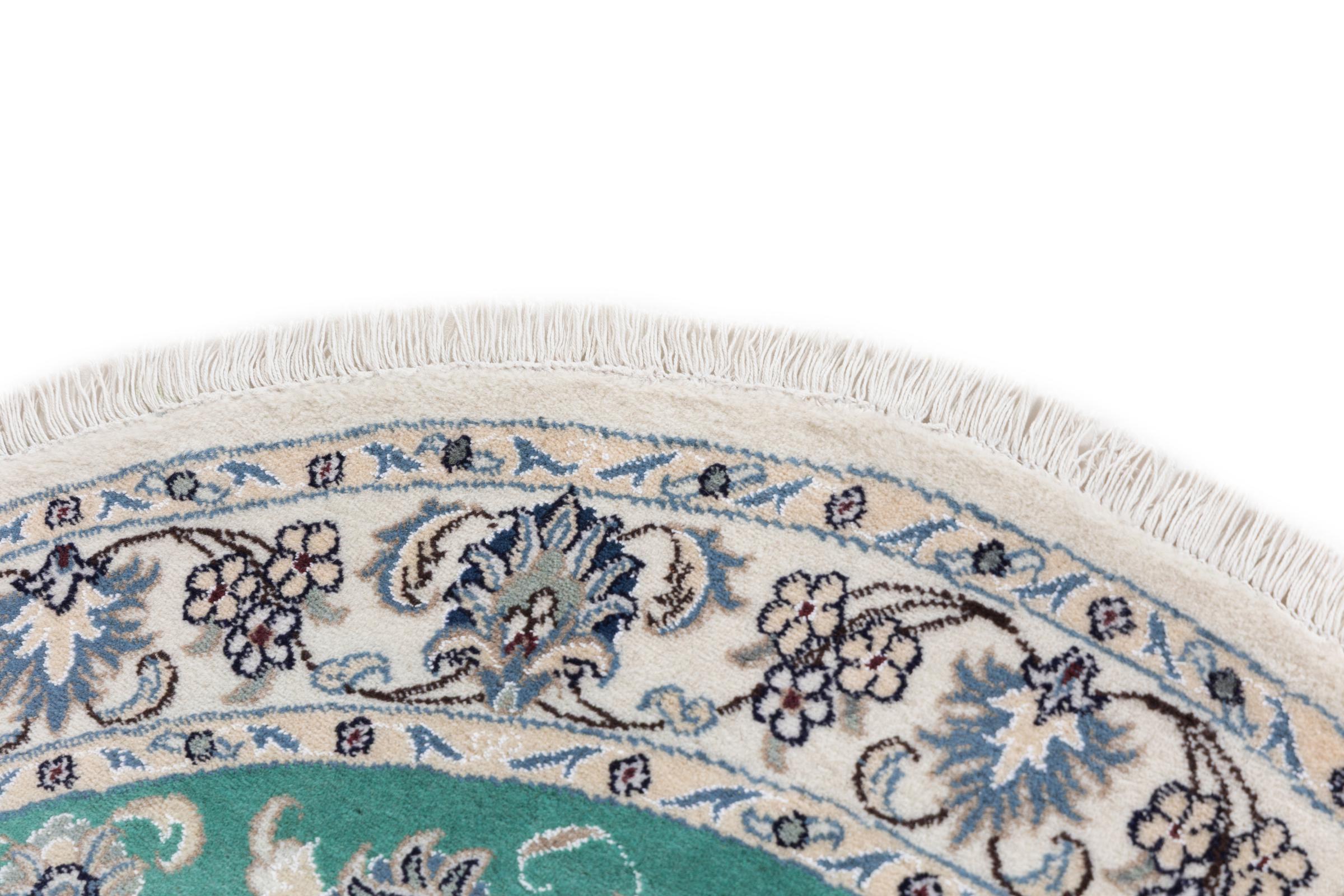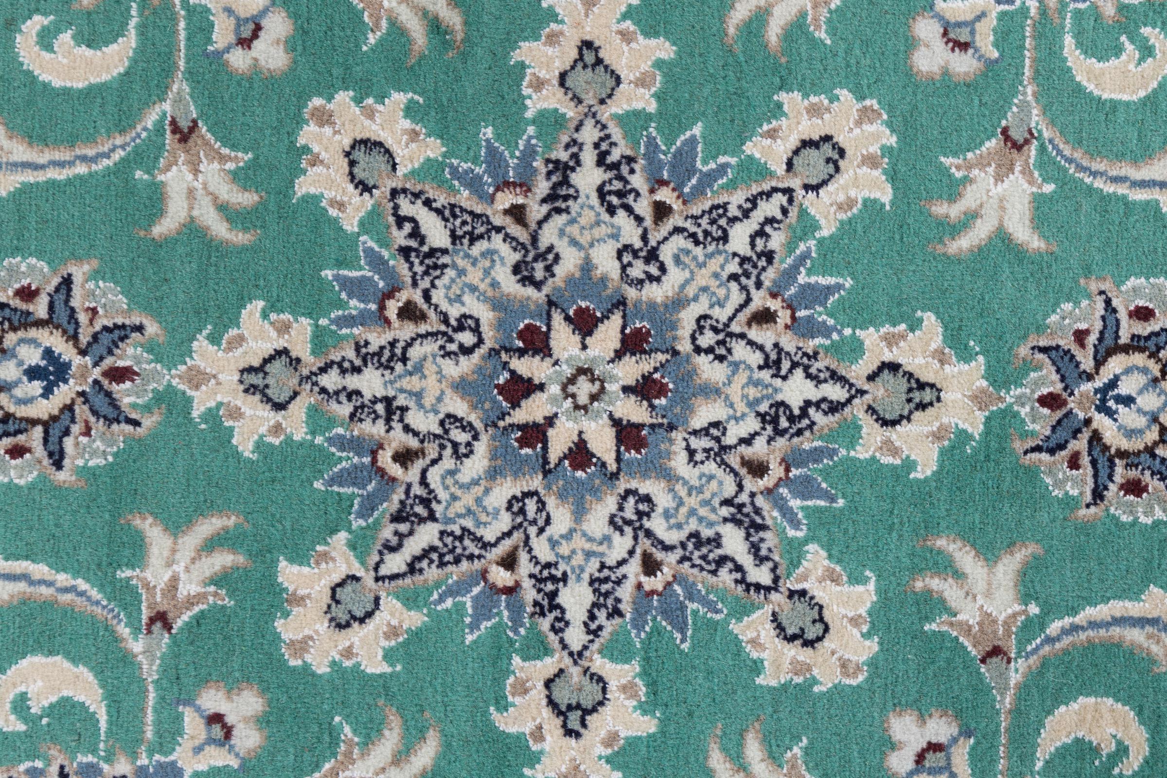 Dieser Nain-Teppich ist mit 12La klassifiziert. Elegant und edel wirkt er in seine typische Nain Farbgebung. Dieser Perserteppich wurde in der Stadt Nain, die am westlichen Rand der Wüste Dascht-e-Kavir liegt, aus hochwertige Wolle und Naturseide von Hand geknüpft. Mit 12La ist er nicht so fein und detailreich mit Ornamenten versehen, wie ein Nain 9La oder 6La.