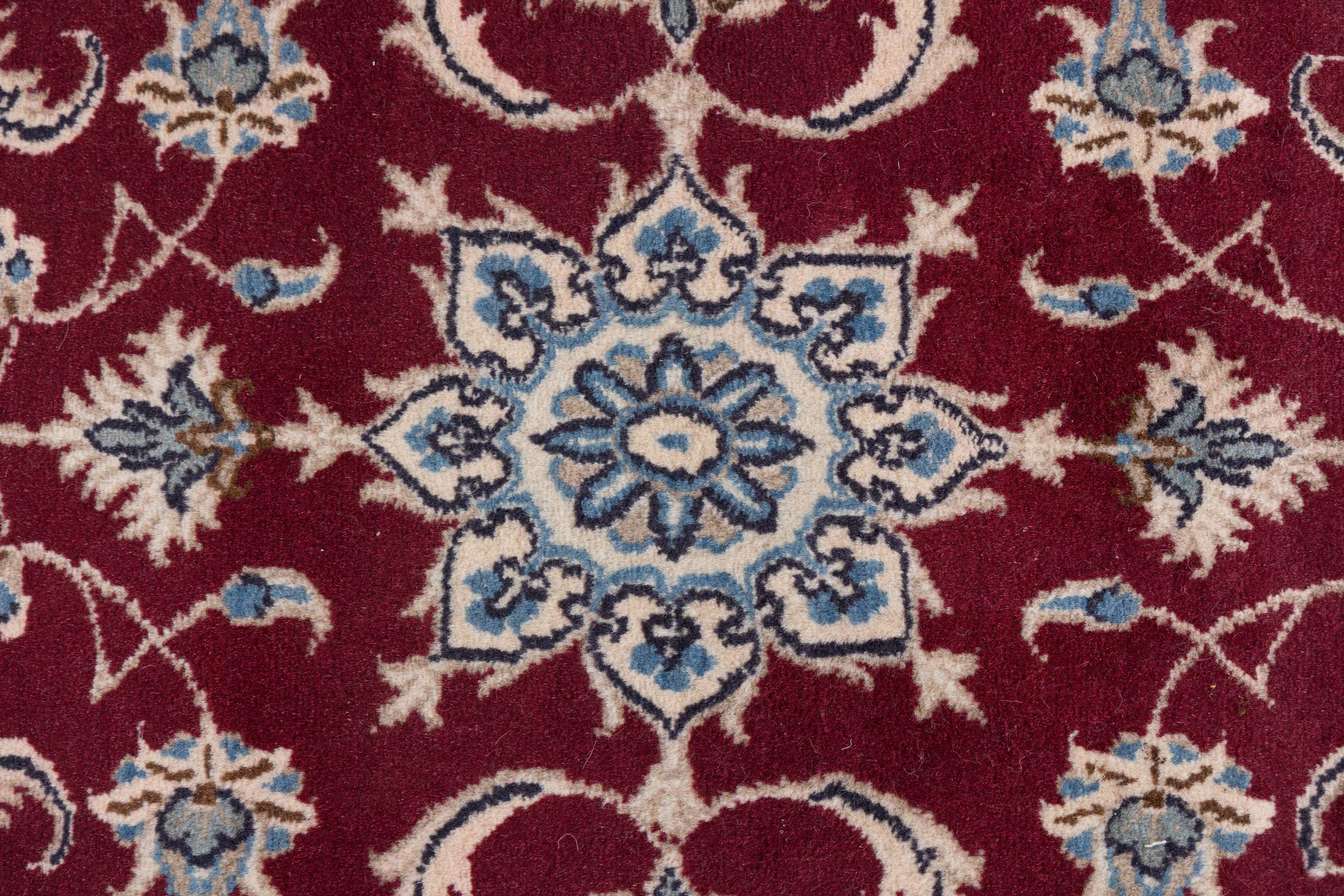 Dieser Nain-Teppich ist mit 12La klassifiziert. Elegant und edel wirkt er in seine typische Nain Farbgebung. Dieser Perserteppich wurde in der Stadt Nain, die am westlichen Rand der Wüste Dascht-e-Kavir liegt, aus hochwertige Wolle und Naturseide von Hand geknüpft. Mit 12La ist er nicht so fein und detailreich mit Ornamenten versehen, wie ein Nain 9La oder 6La.