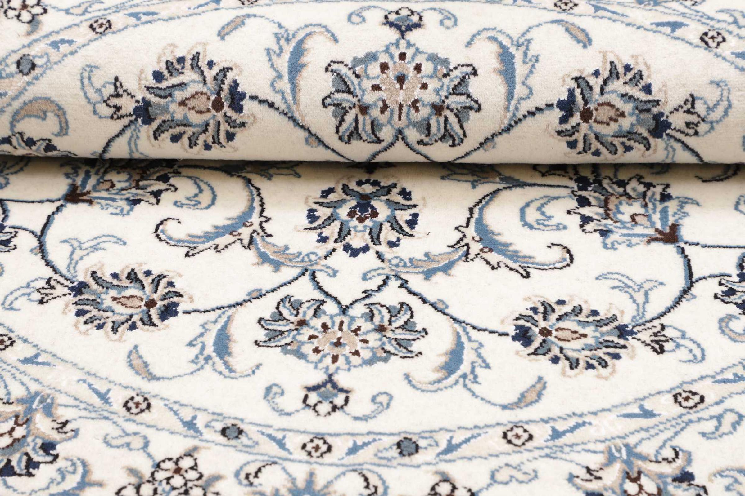 Dieser Nain-Teppich ist mit 12La klassifiziert. Elegant und edel wirkt er in seine typische Nain Farbgebung. Dieser Perserteppich wurde in der Stadt Nain, die am westlichen Rand der Wüste Dascht-e-Kavir liegt, aus hochwertige Wolle und Naturseide von Hand geknüpft. Mit 12La ist er nicht so fein und detailreich mit Ornamenten versehen, wie ein Nain 9La oder 6La.