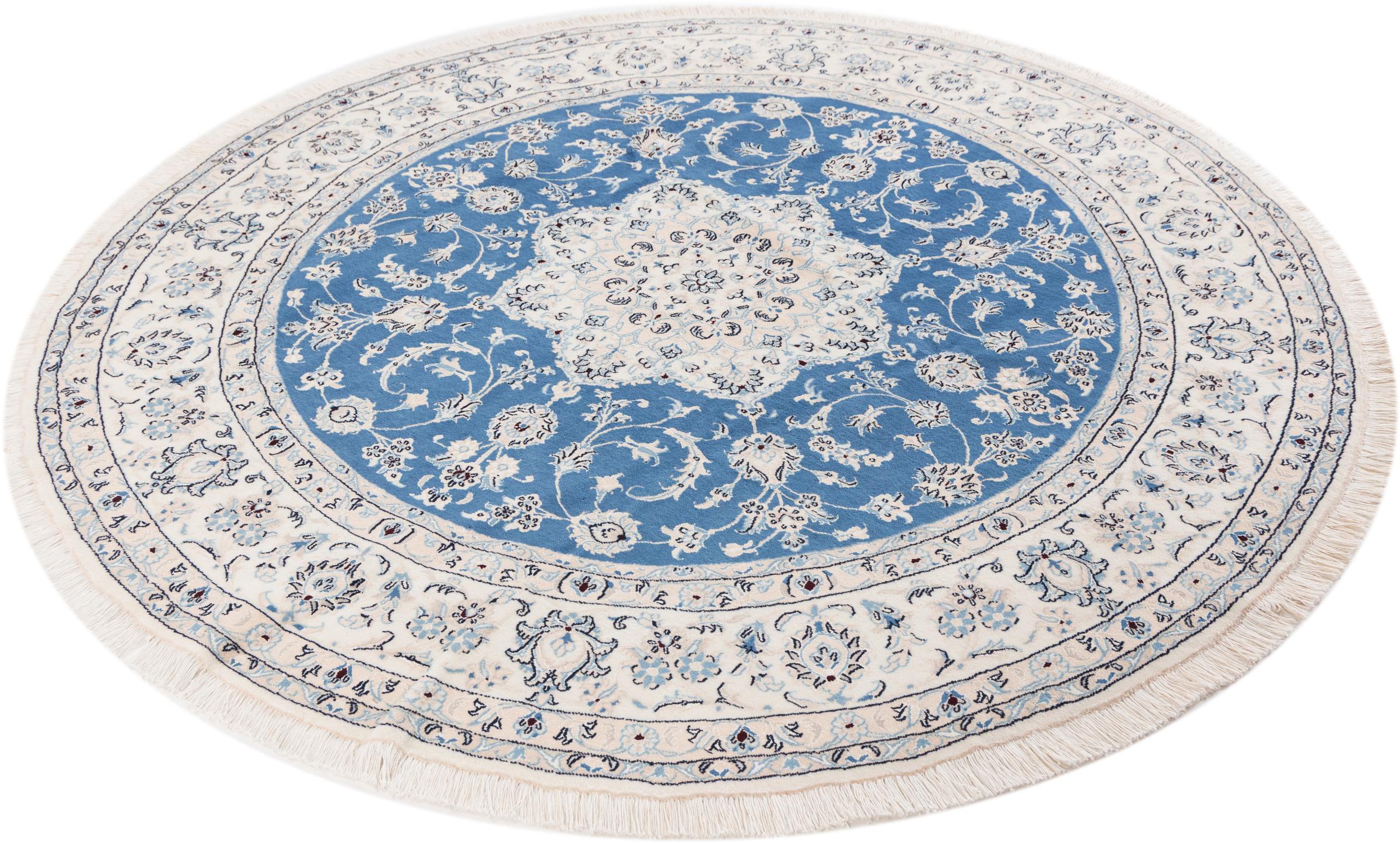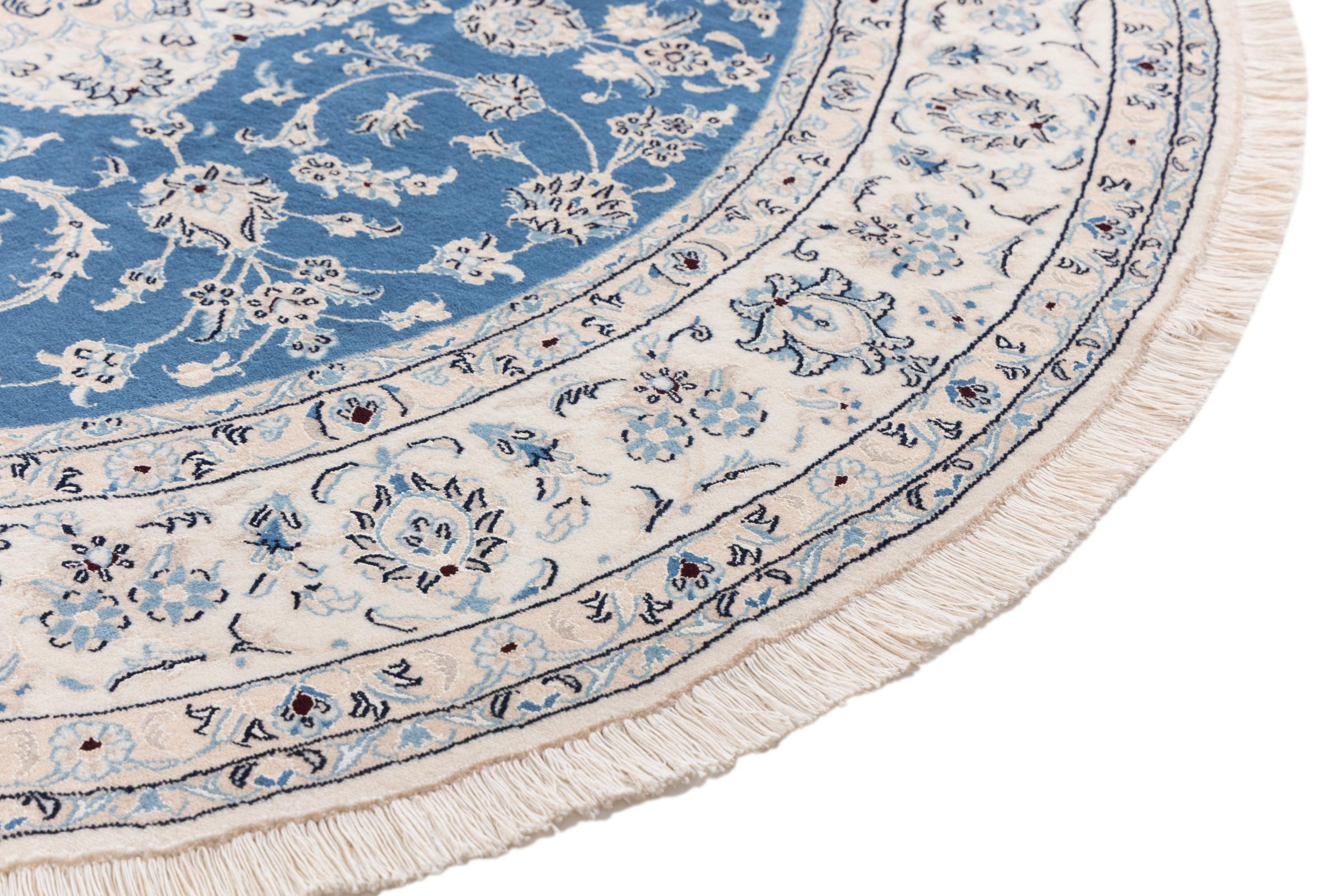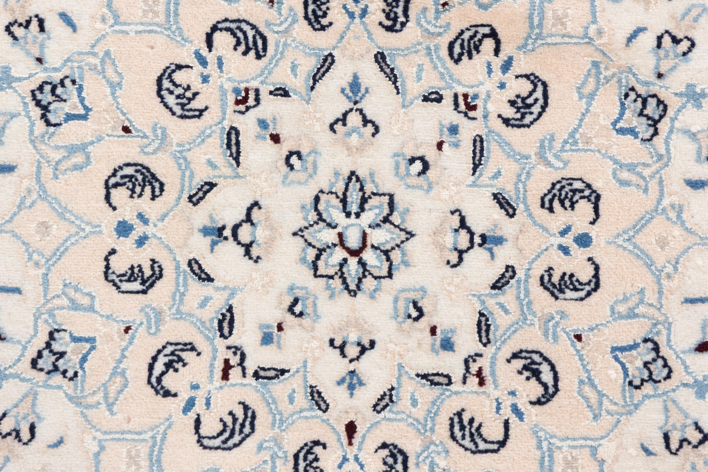 Dieser Nain Teppich ist mit 9La klassifiziert. Die ausgezeichnete Qualität, das schöne orientalische Design mit seinen kurvilinearen Mustern begeistert jeden Käufer. Dieser Perserteppich wurde in der Stadt Nain, die am westlichen Rand der Wüste Dascht-e-Kavir liegt, aus hochwertiger Wolle und Naturseide handgeknüpft. 9La Nain sind deutlich feiner als ein 12La und zeigen bereits schöne Details.