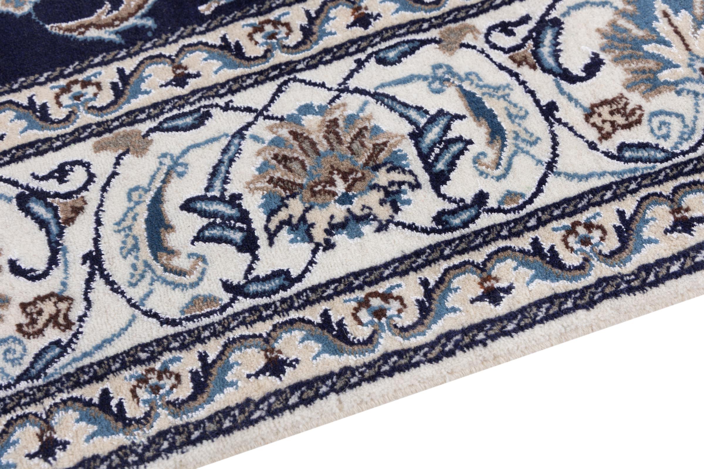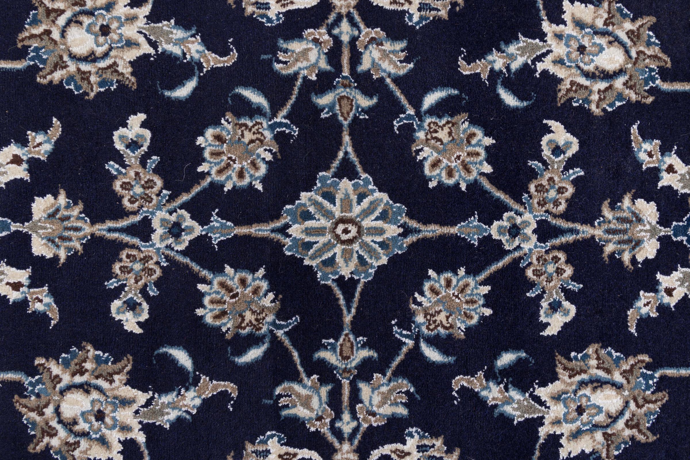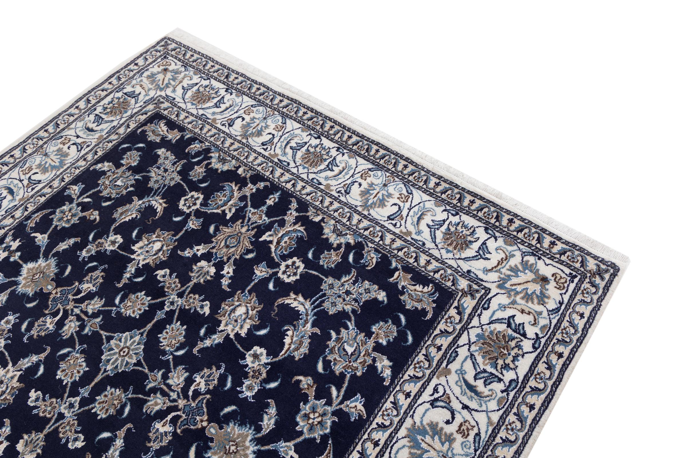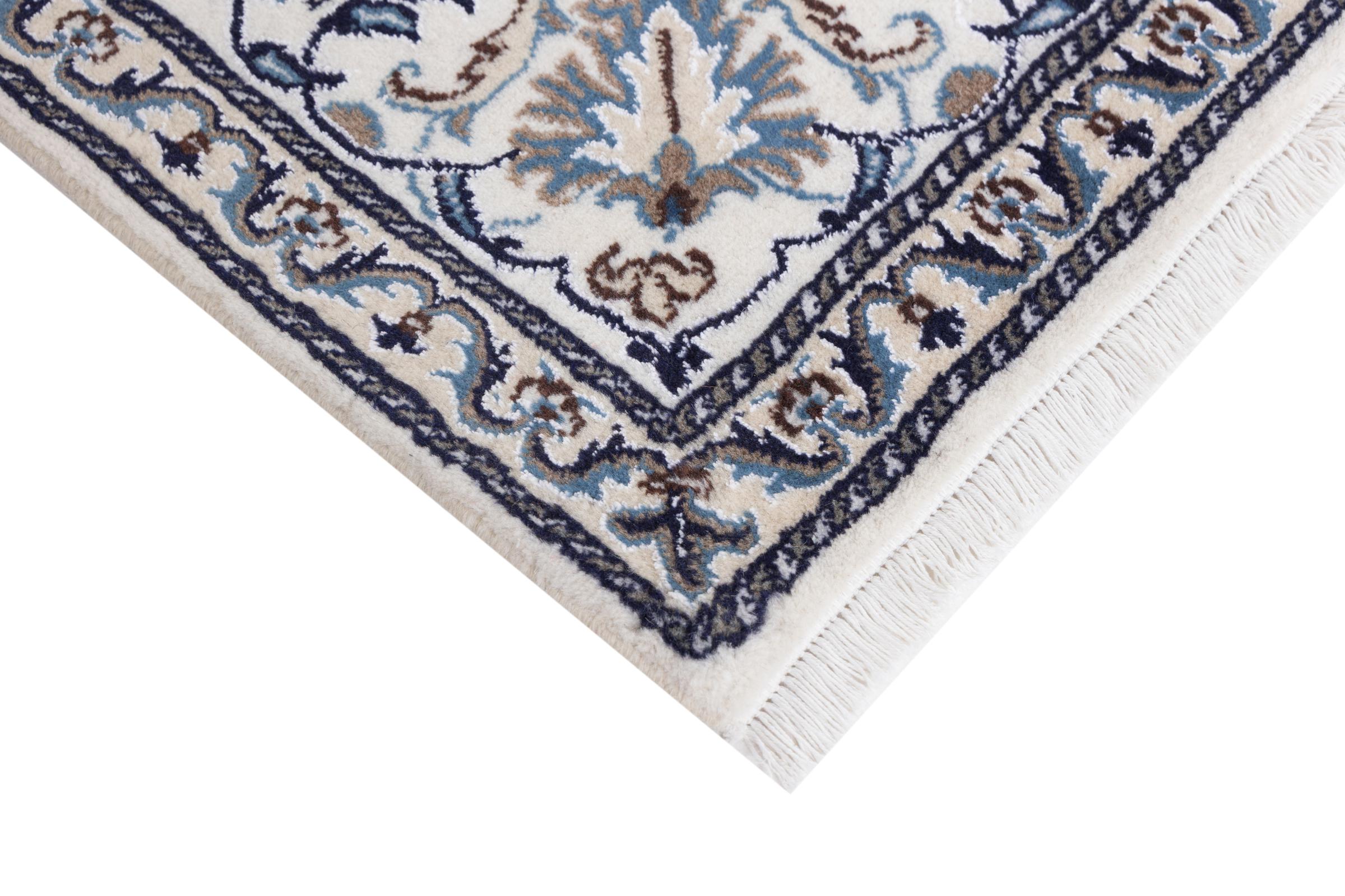 Dieser Nain-Teppich ist mit 12La klassifiziert. Elegant und edel wirkt er in seine typische Nain Farbgebung. Dieser Perserteppich wurde in der Stadt Nain, die am westlichen Rand der Wüste Dascht-e-Kavir liegt, aus hochwertige Wolle und Naturseide von Hand geknüpft. Mit 12La ist er nicht so fein und detailreich mit Ornamenten versehen, wie ein Nain 9La oder 6La.