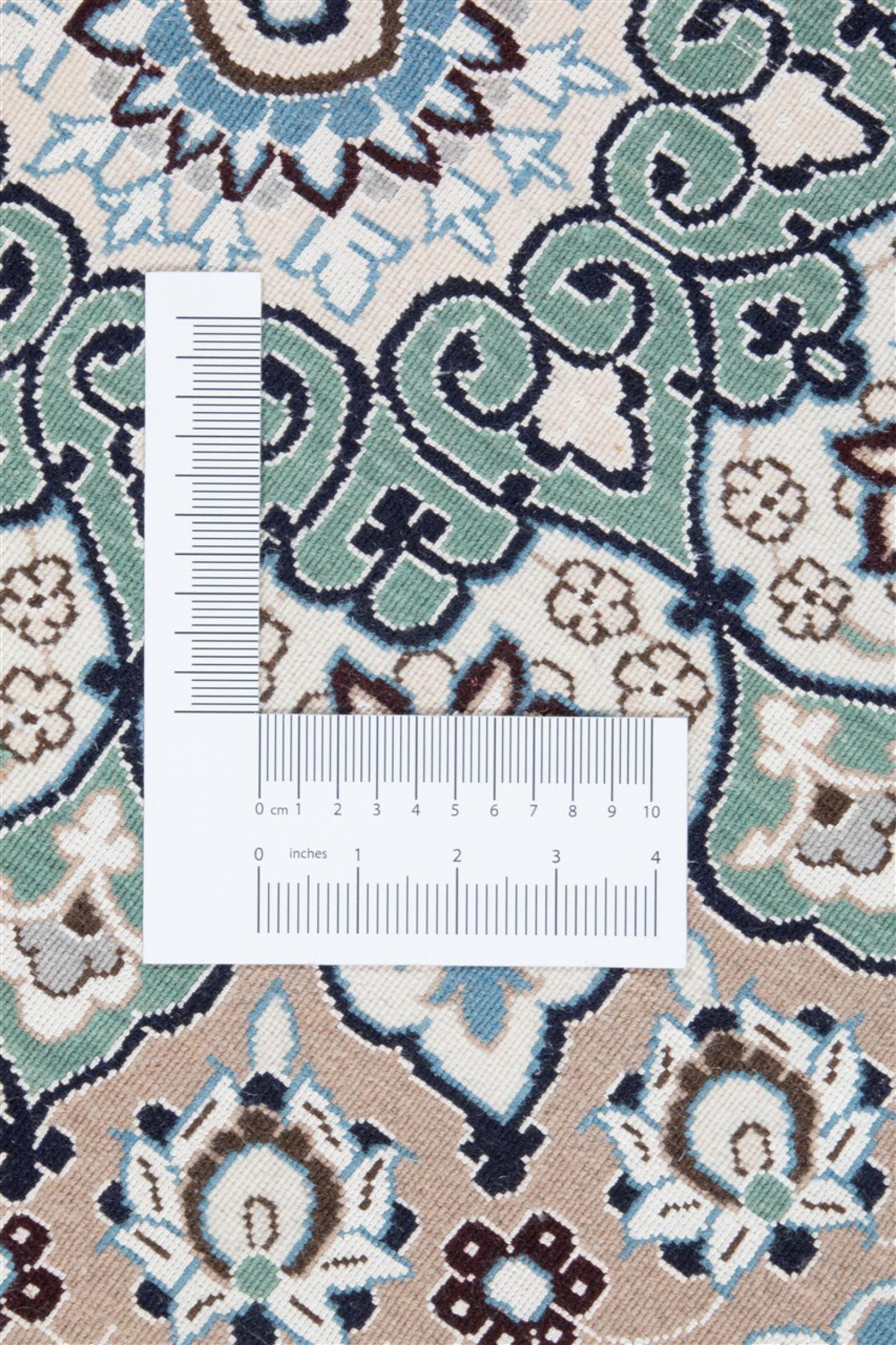 Dieser Nain Teppich ist mit 9La klassifiziert. Die ausgezeichnete Qualität, das schöne orientalische Design mit seinen kurvilinearen Mustern begeistert jeden Käufer. Dieser Perserteppich wurde in der Stadt Nain, die am westlichen Rand der Wüste Dascht-e-Kavir liegt, aus hochwertiger Wolle und Naturseide handgeknüpft. 9La Nain sind deutlich feiner als ein 12La und zeigen bereits schöne Details.