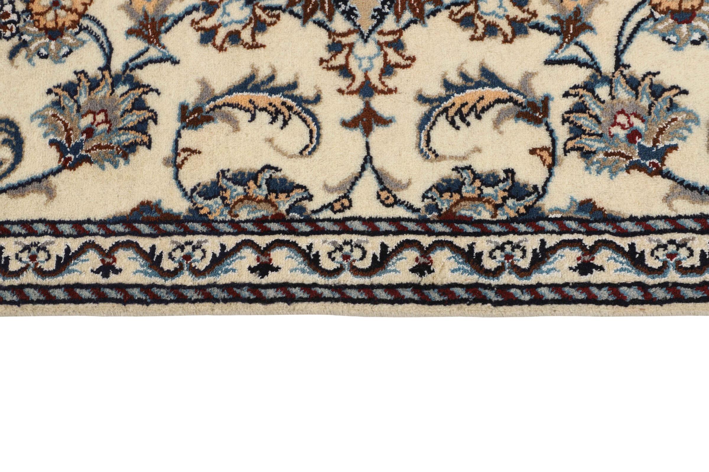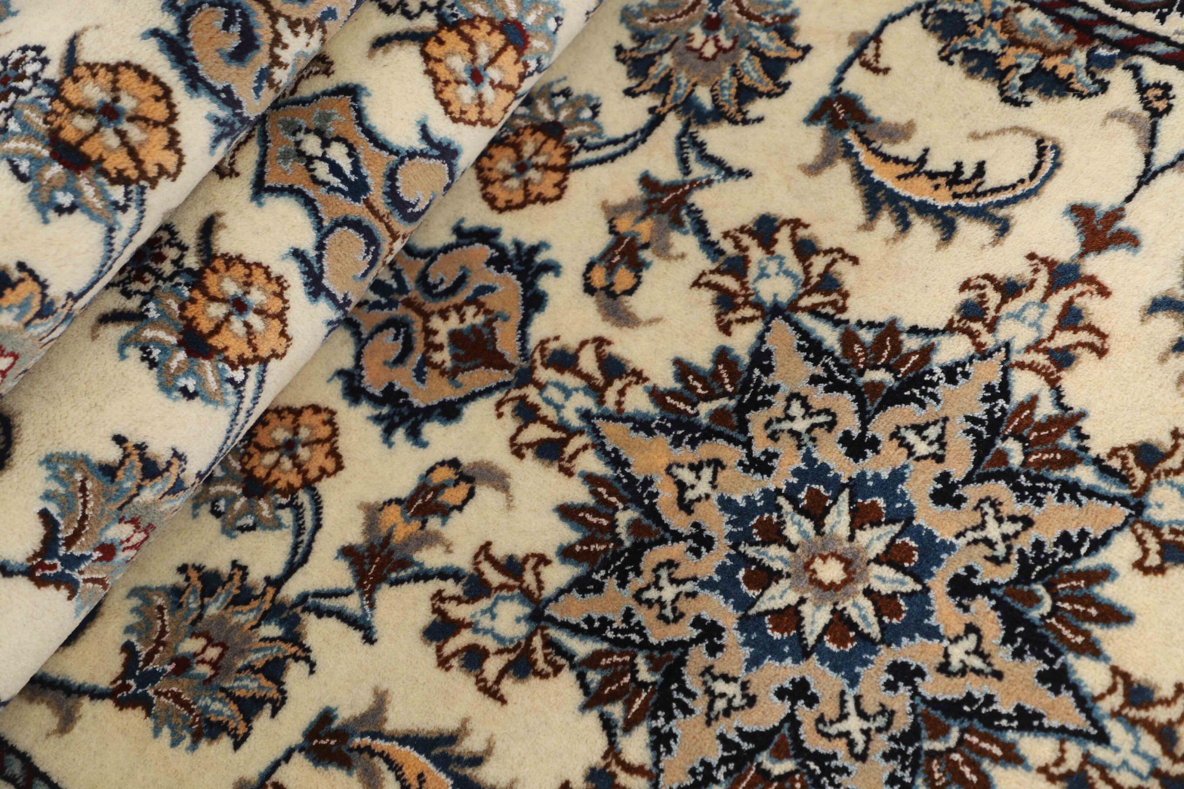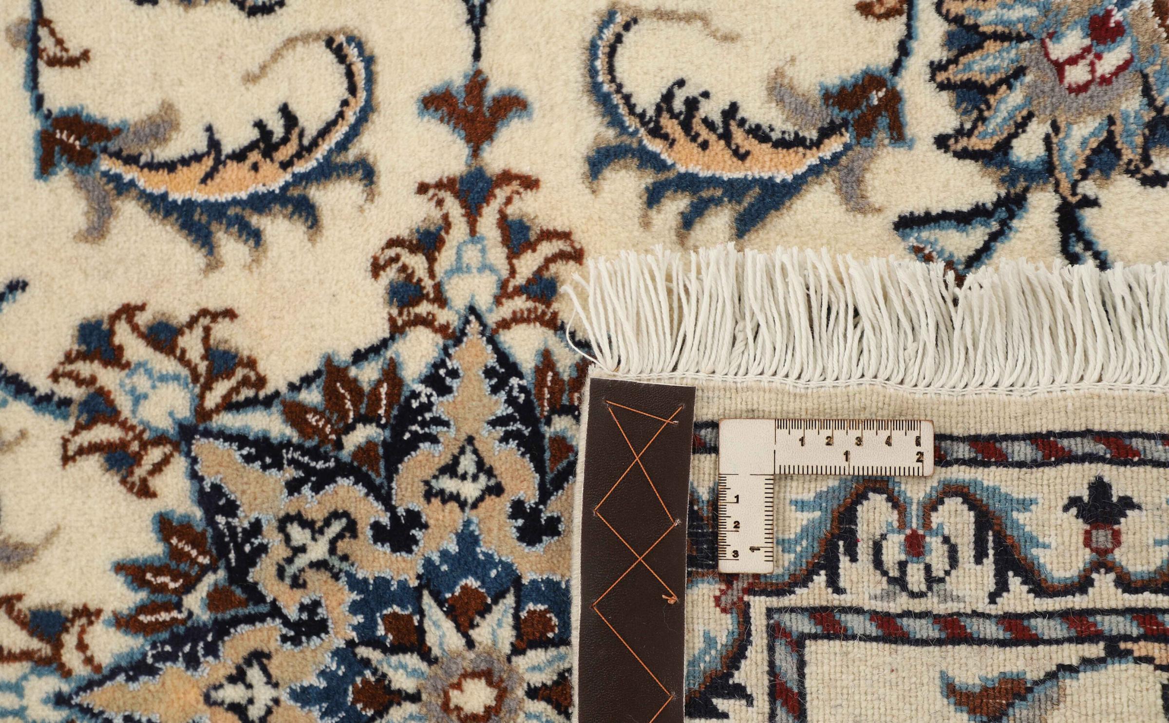Dieser Nain-Teppich ist mit 12La klassifiziert. Elegant und edel wirkt er in seine typische Nain Farbgebung. Dieser Perserteppich wurde in der Stadt Nain, die am westlichen Rand der Wüste Dascht-e-Kavir liegt, aus hochwertige Wolle und Naturseide von Hand geknüpft. Mit 12La ist er nicht so fein und detailreich mit Ornamenten versehen, wie ein Nain 9La oder 6La.