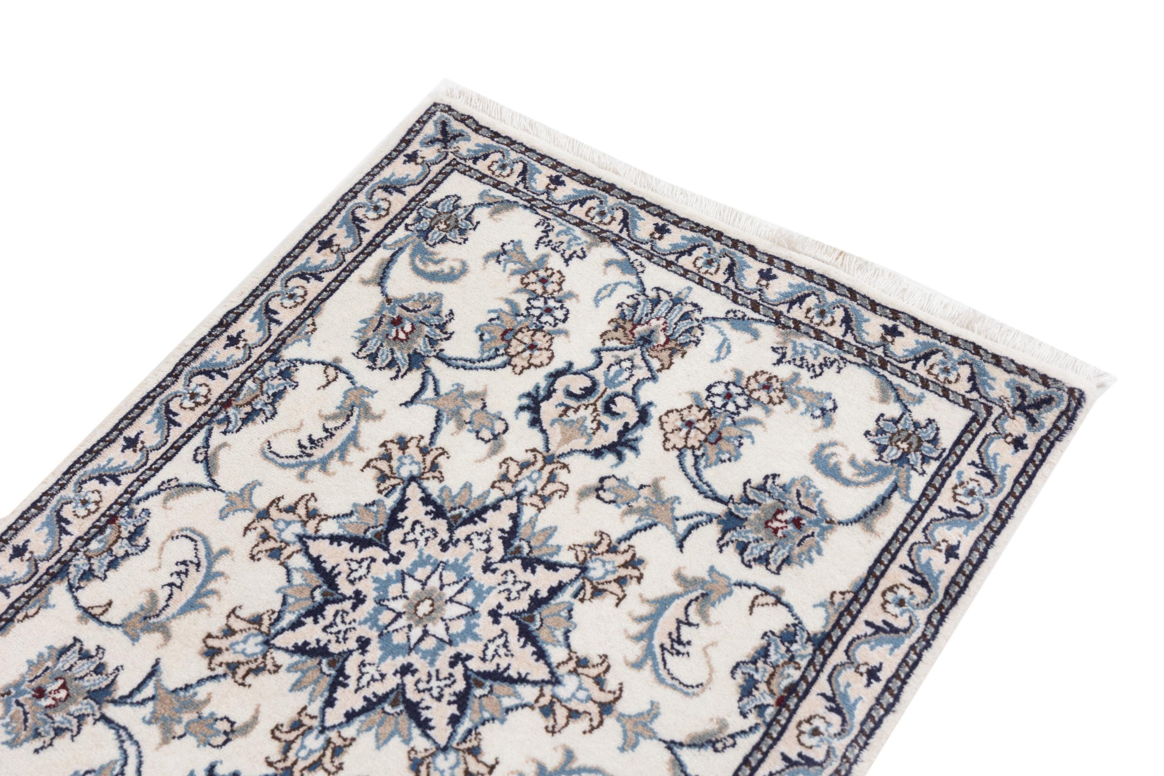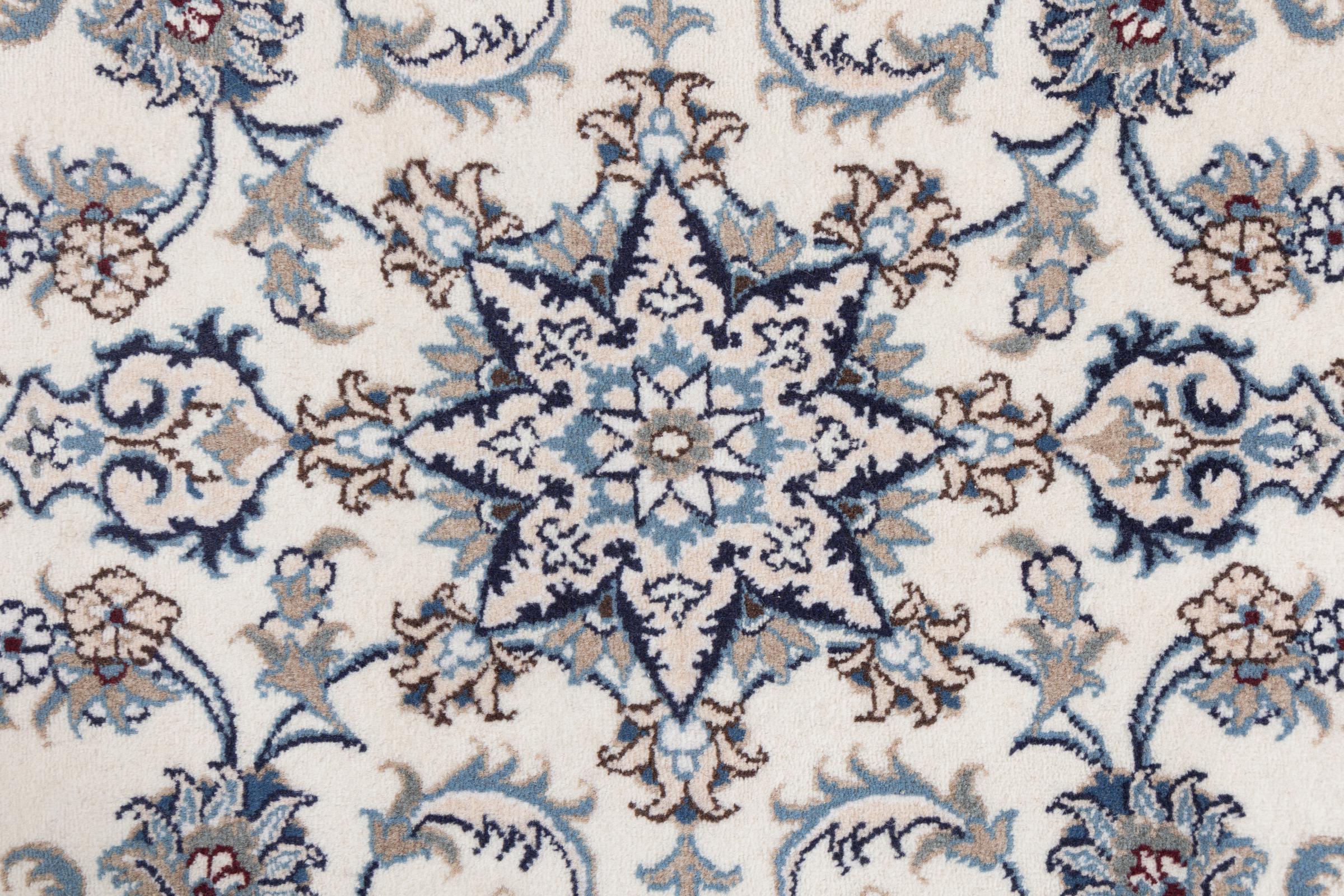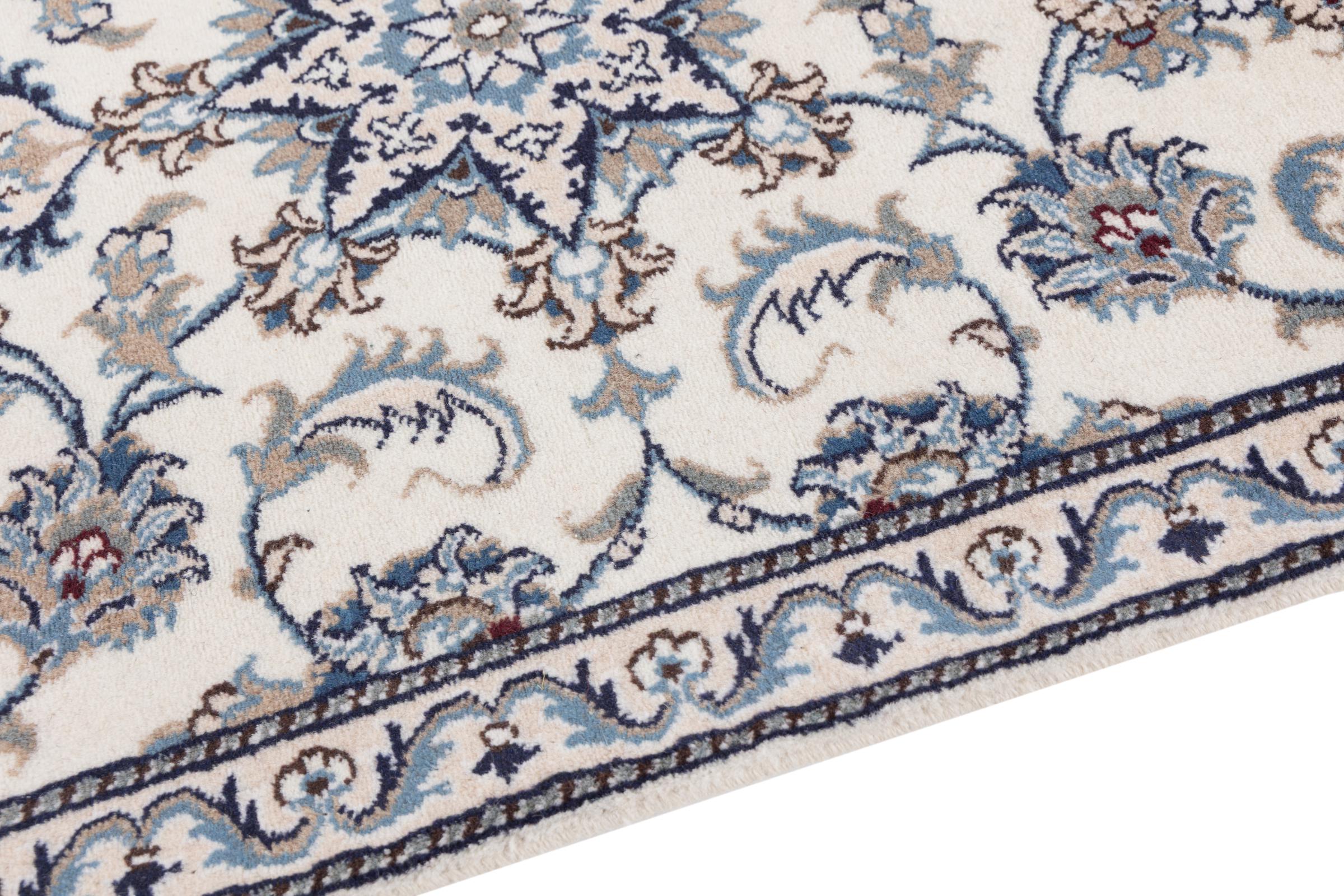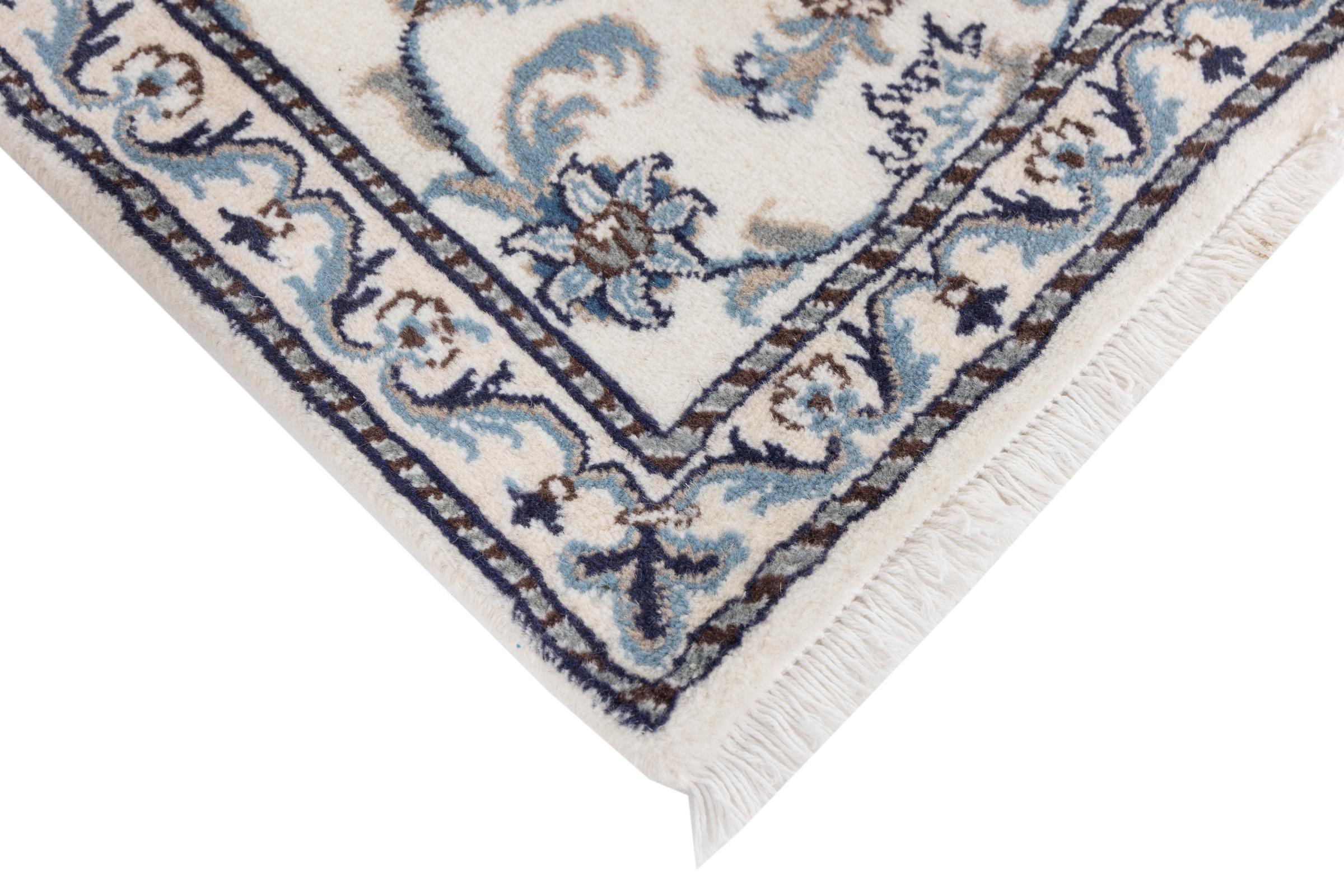 Dieser Nain-Teppich ist mit 12La klassifiziert. Elegant und edel wirkt er in seine typische Nain Farbgebung. Dieser Perserteppich wurde in der Stadt Nain, die am westlichen Rand der Wüste Dascht-e-Kavir liegt, aus hochwertige Wolle und Naturseide von Hand geknüpft. Mit 12La ist er nicht so fein und detailreich mit Ornamenten versehen, wie ein Nain 9La oder 6La.