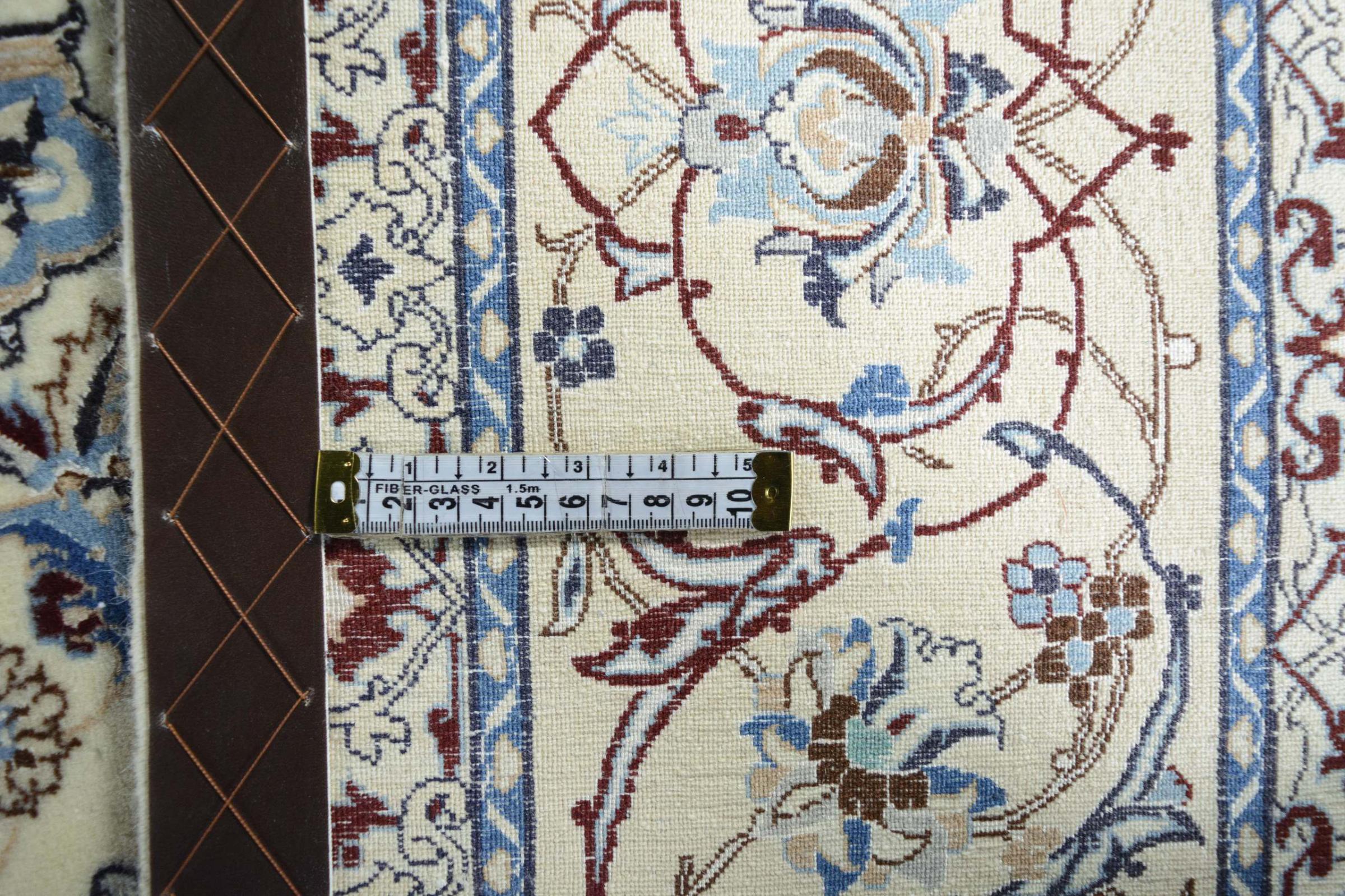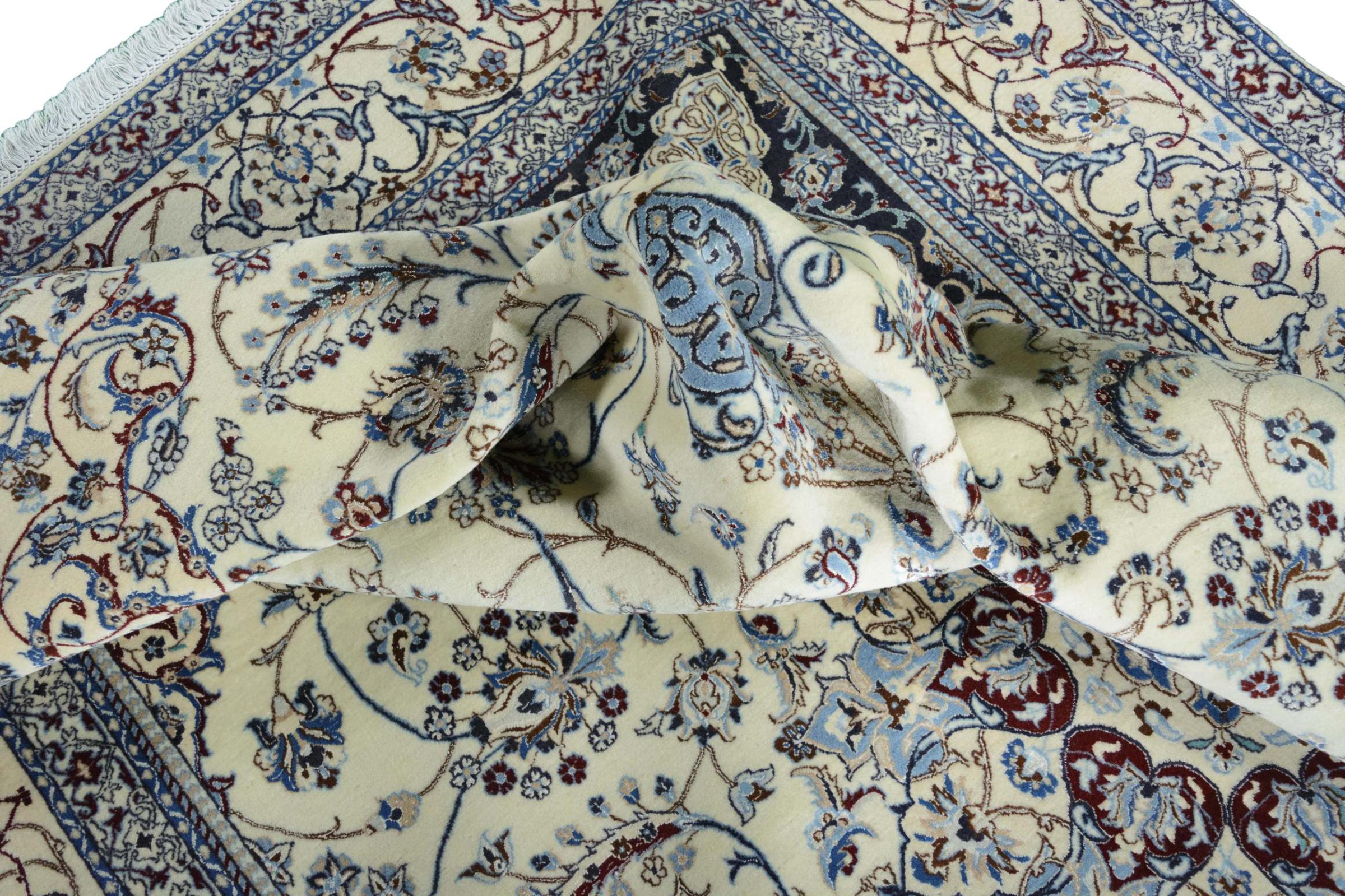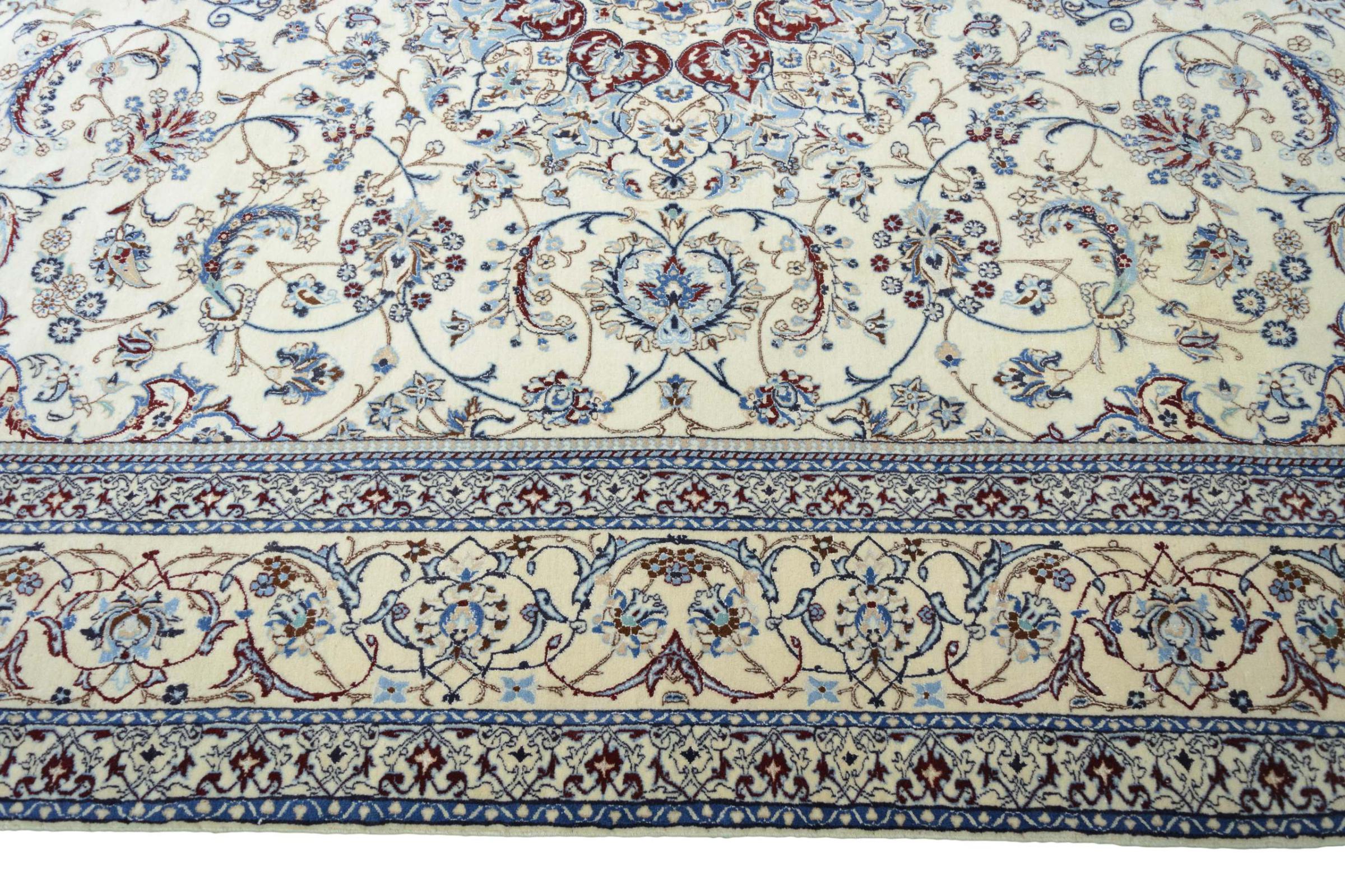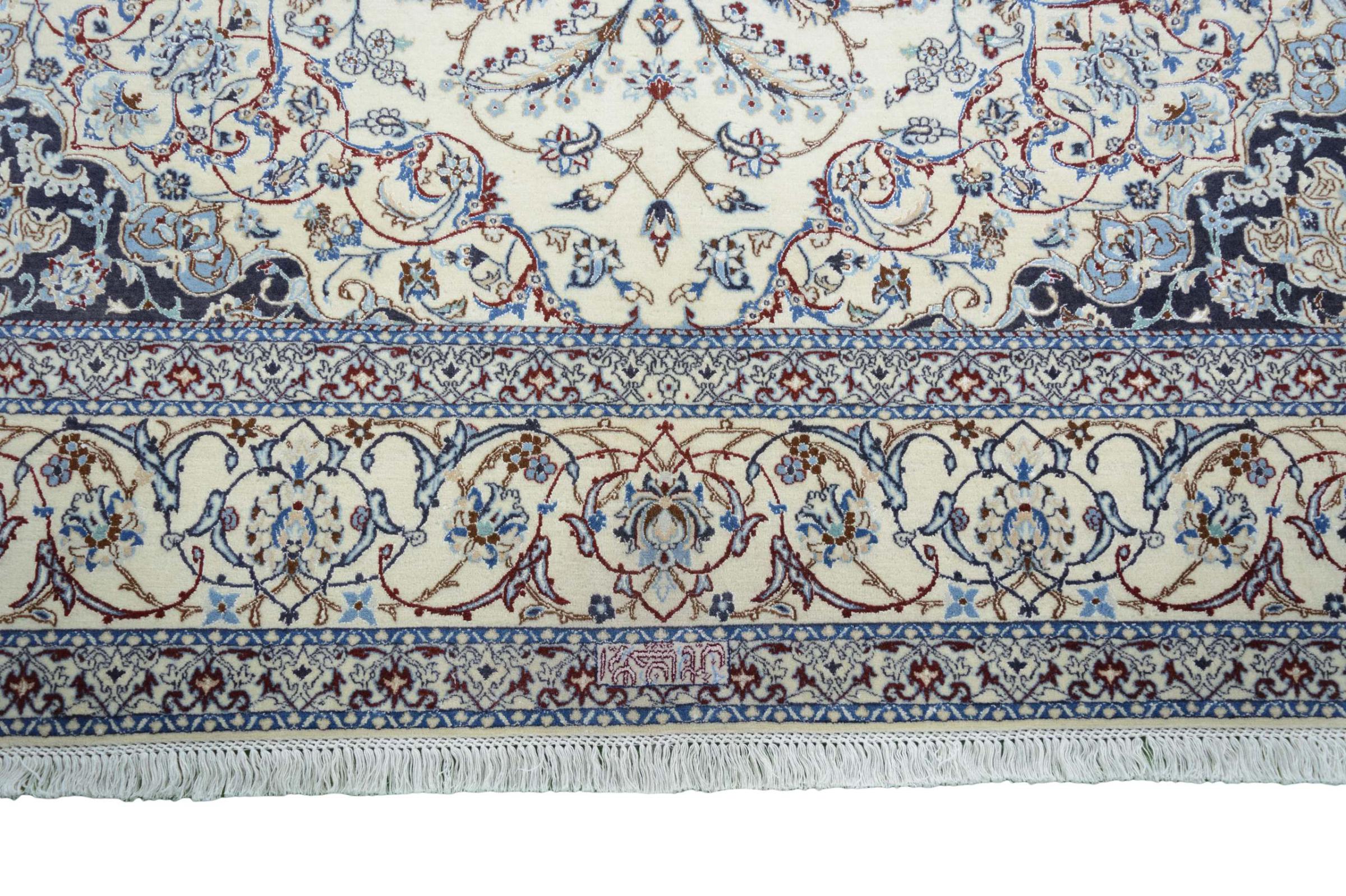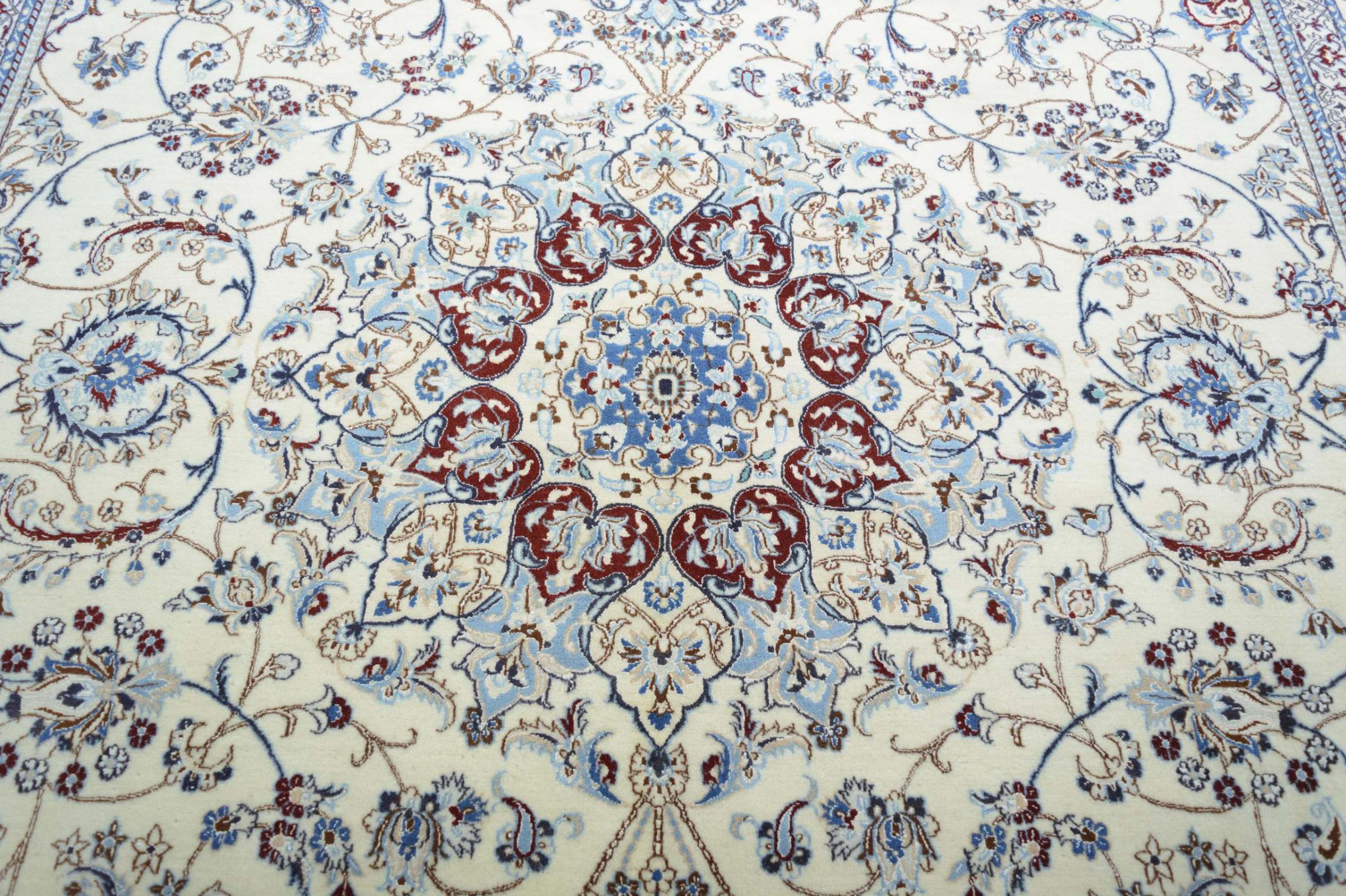 Dieser Nain Teppich verbindet Qualität, Tradition und ein unverkennbares Design. Er wurde in der gleichnamigen Wüstenstadt Nain aus hochwertiger Korkwolle und Naturseide handgeknüpft. Liebhabern wertvoller Teppiche aus dem Iran wird dieser Perserteppich gefallen. Mit Nain Teppichen der 6La und 4La Klassifikation besitzt man ein echtes Kunstwerk mit einem unglaublichen Detailgrad, in dem man sich regelrecht verlieren kann. Nain 4La Teppiche sind heute kaum noch zu finden, da sie extrem aufwändig in der Fertigung sind.