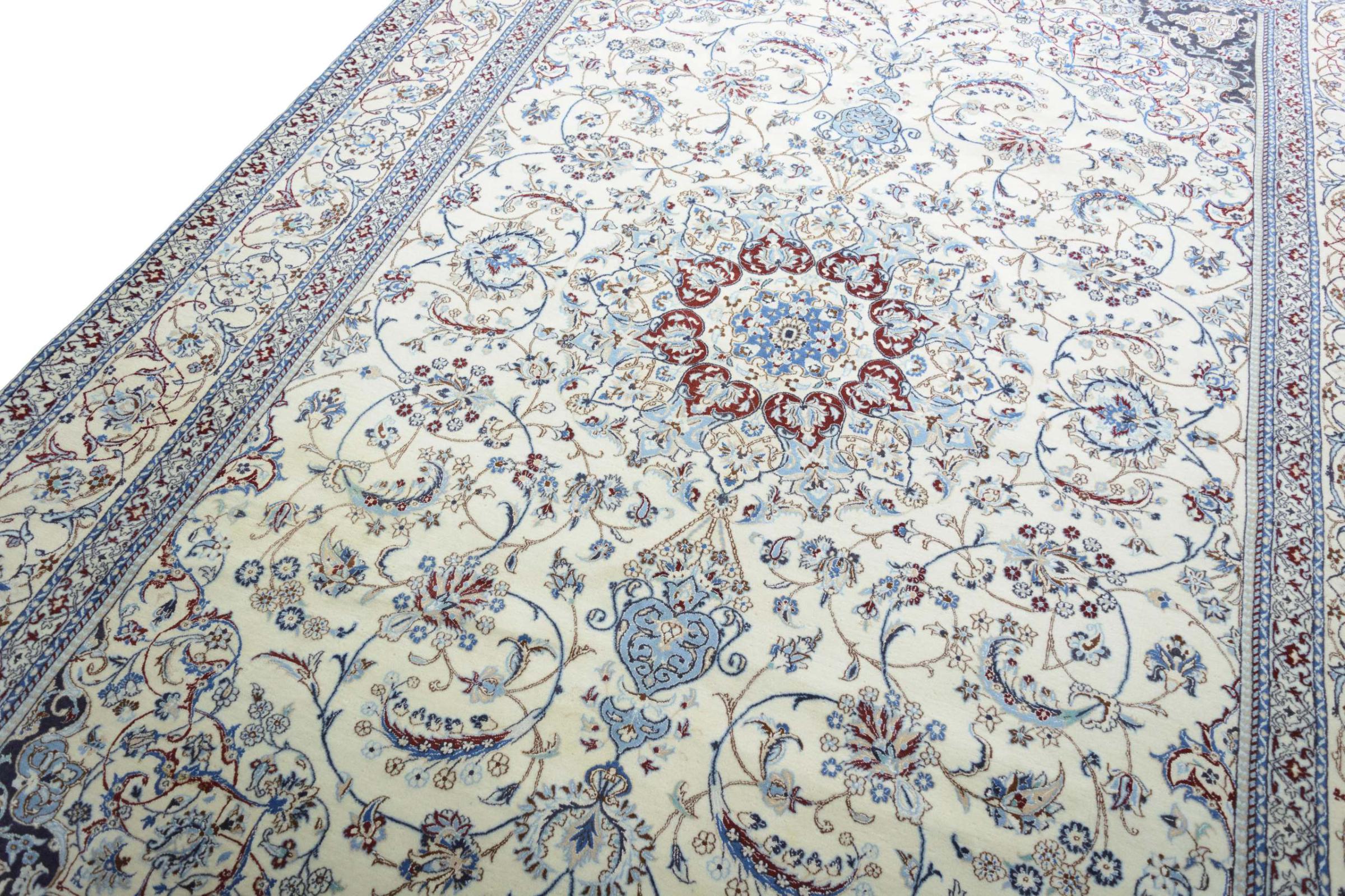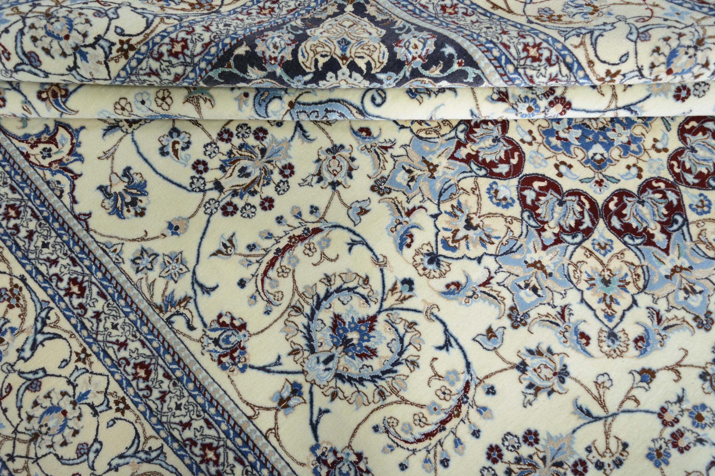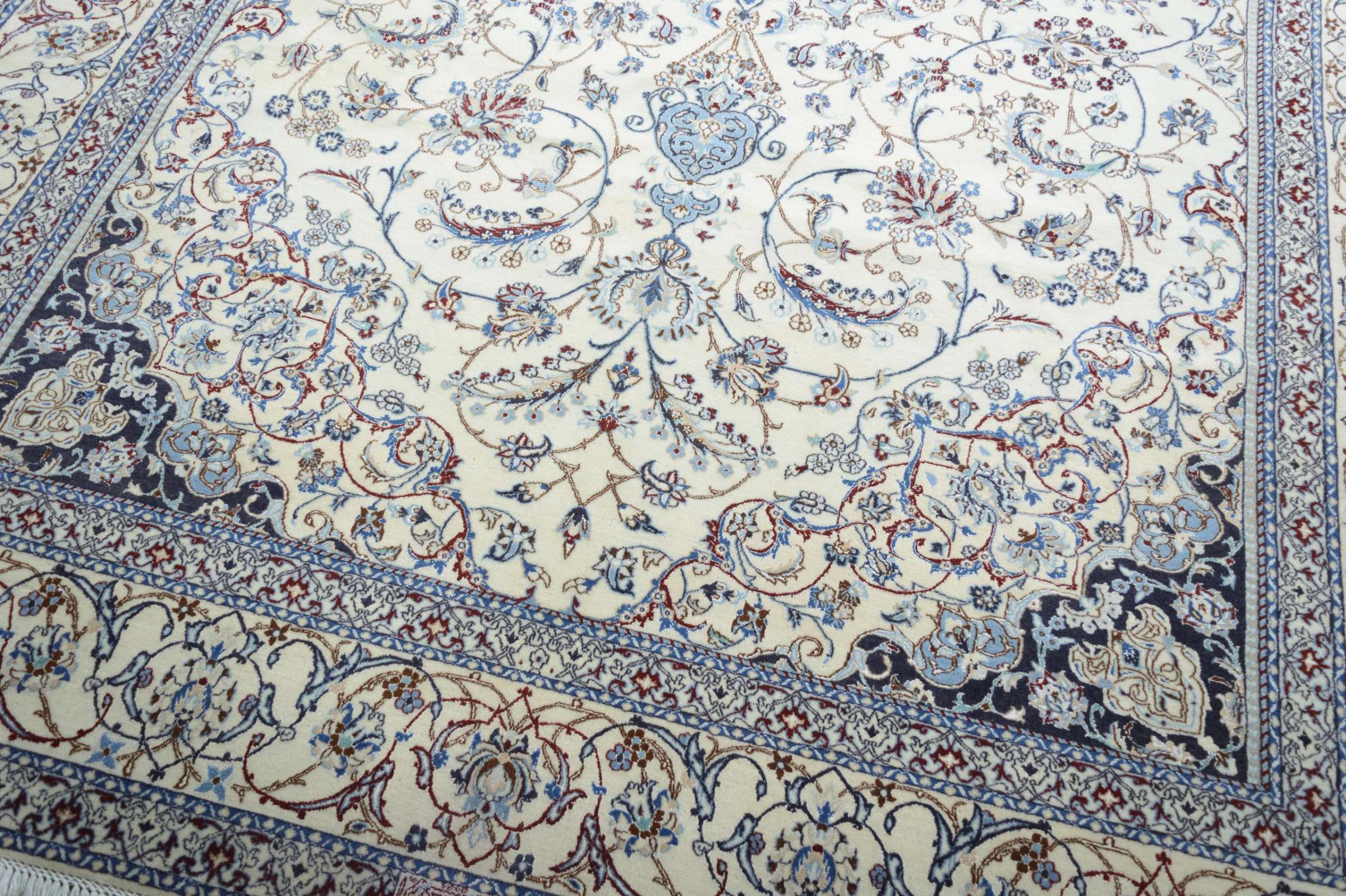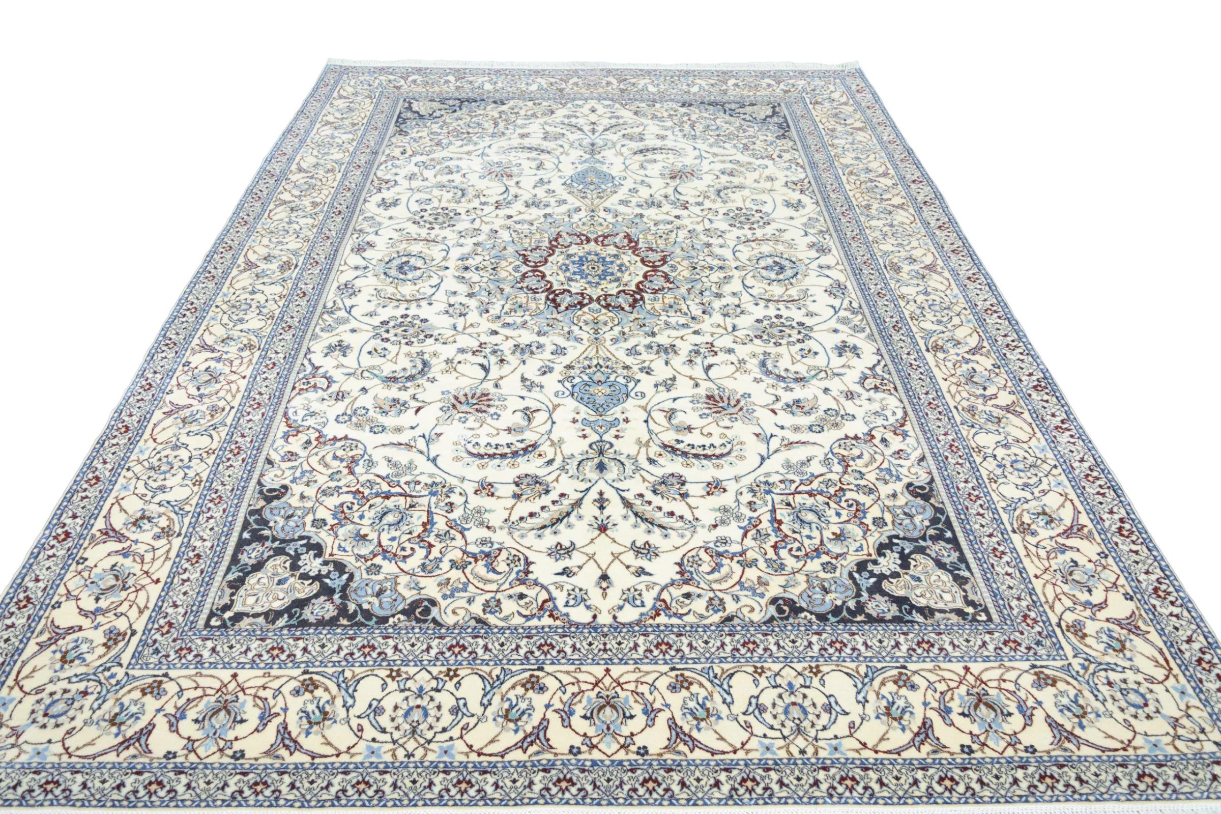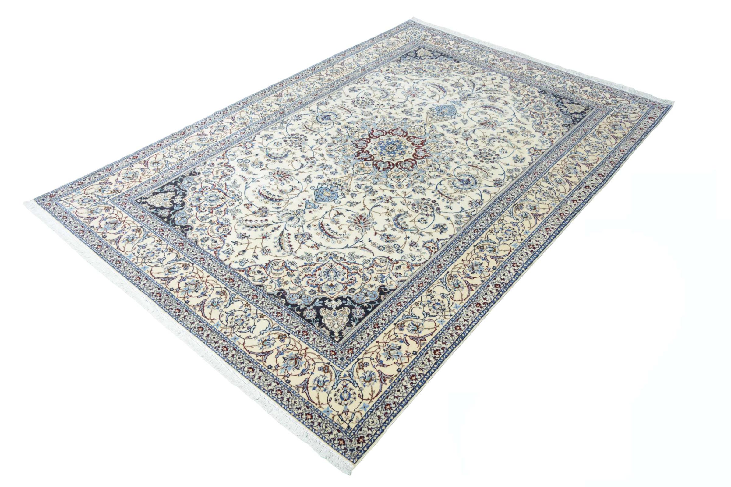 Dieser Nain Teppich verbindet Qualität, Tradition und ein unverkennbares Design. Er wurde in der gleichnamigen Wüstenstadt Nain aus hochwertiger Korkwolle und Naturseide handgeknüpft. Liebhabern wertvoller Teppiche aus dem Iran wird dieser Perserteppich gefallen. Mit Nain Teppichen der 6La und 4La Klassifikation besitzt man ein echtes Kunstwerk mit einem unglaublichen Detailgrad, in dem man sich regelrecht verlieren kann. Nain 4La Teppiche sind heute kaum noch zu finden, da sie extrem aufwändig in der Fertigung sind.