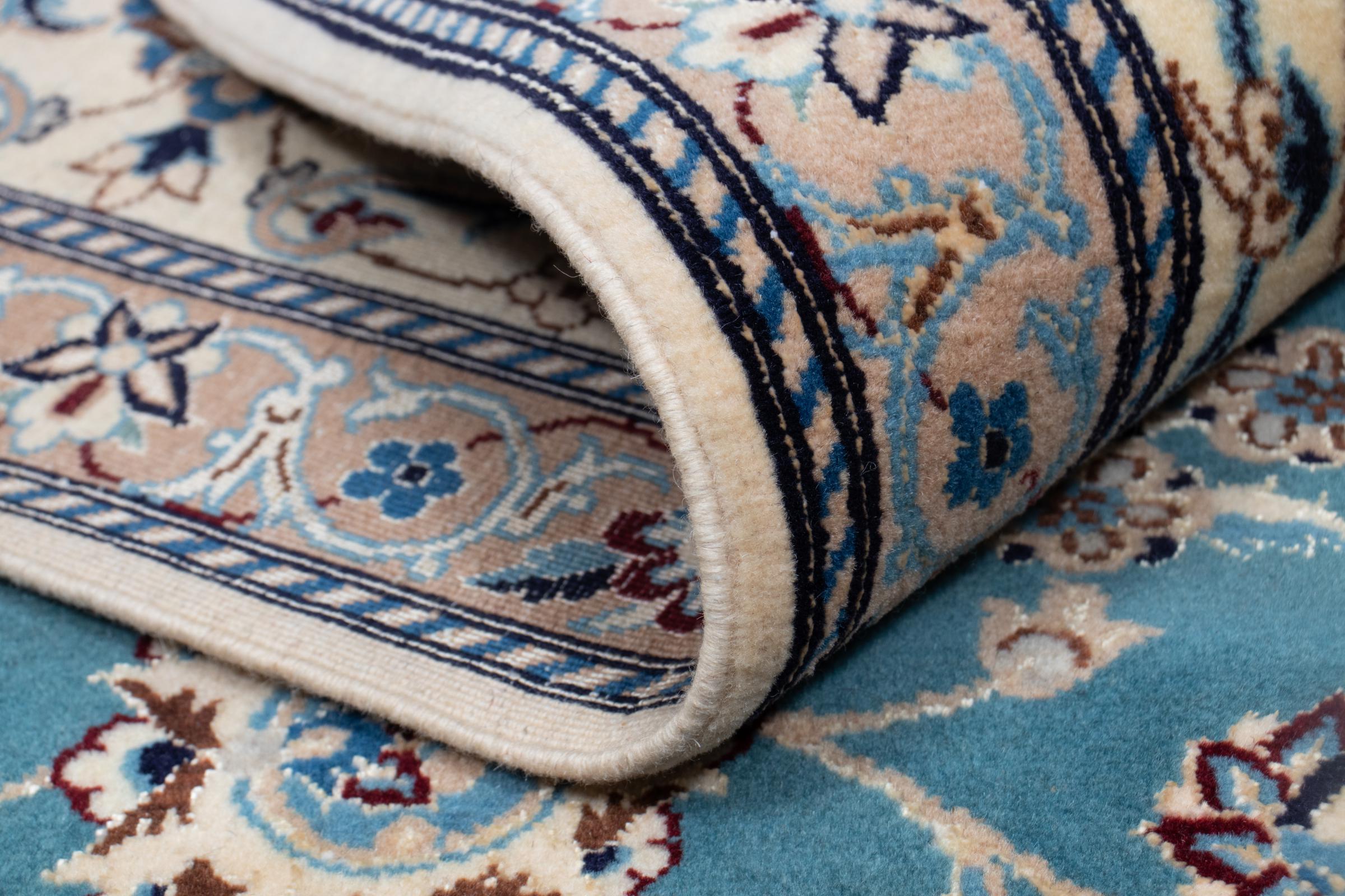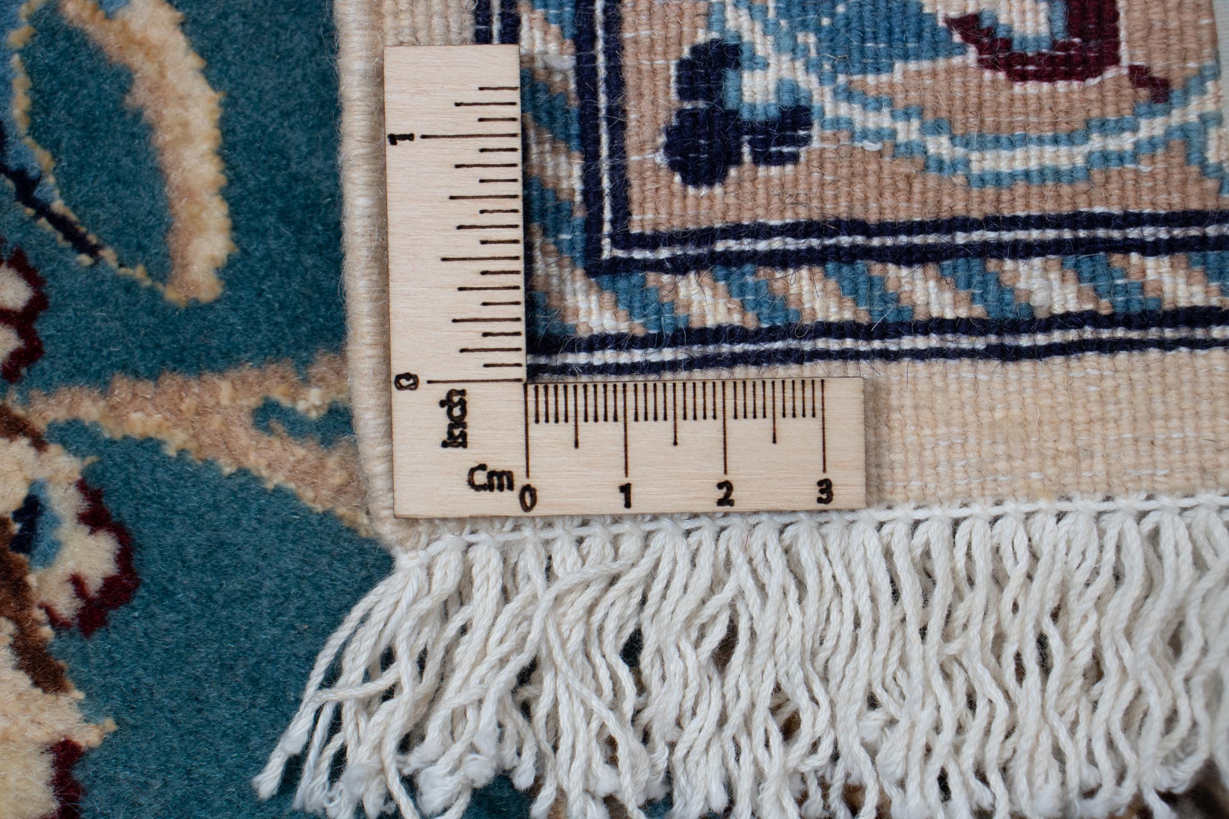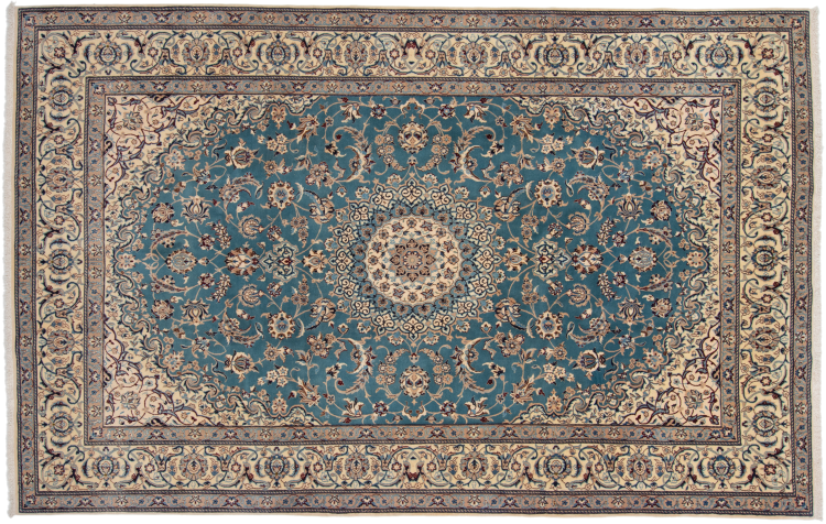 Dieser Teppich besteht aus von Hand gesponnener Schafwolle in höchster Qualitätsstufe. Vor allem im Iran (ehem. Persien), Afghanistan und Pakistan wird Wolle noch von Hand gesponnen, bevor die eigentliche Knüpfung des Teppichs beginnt. Wolle hat sich als natürliches und extrem strapazierfähiges Material über Jahrhunderte hinweg bewährt. Sie besitzt unter Anderem schmutzabweisende und wärmedämmende Eigenschaften. Zugleich ist Wolle unvergleichlich weich und bringt einen natürlichen Glanz mit sich.