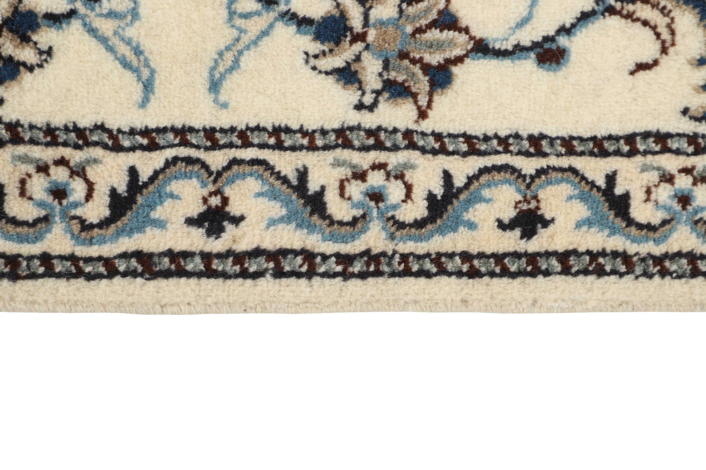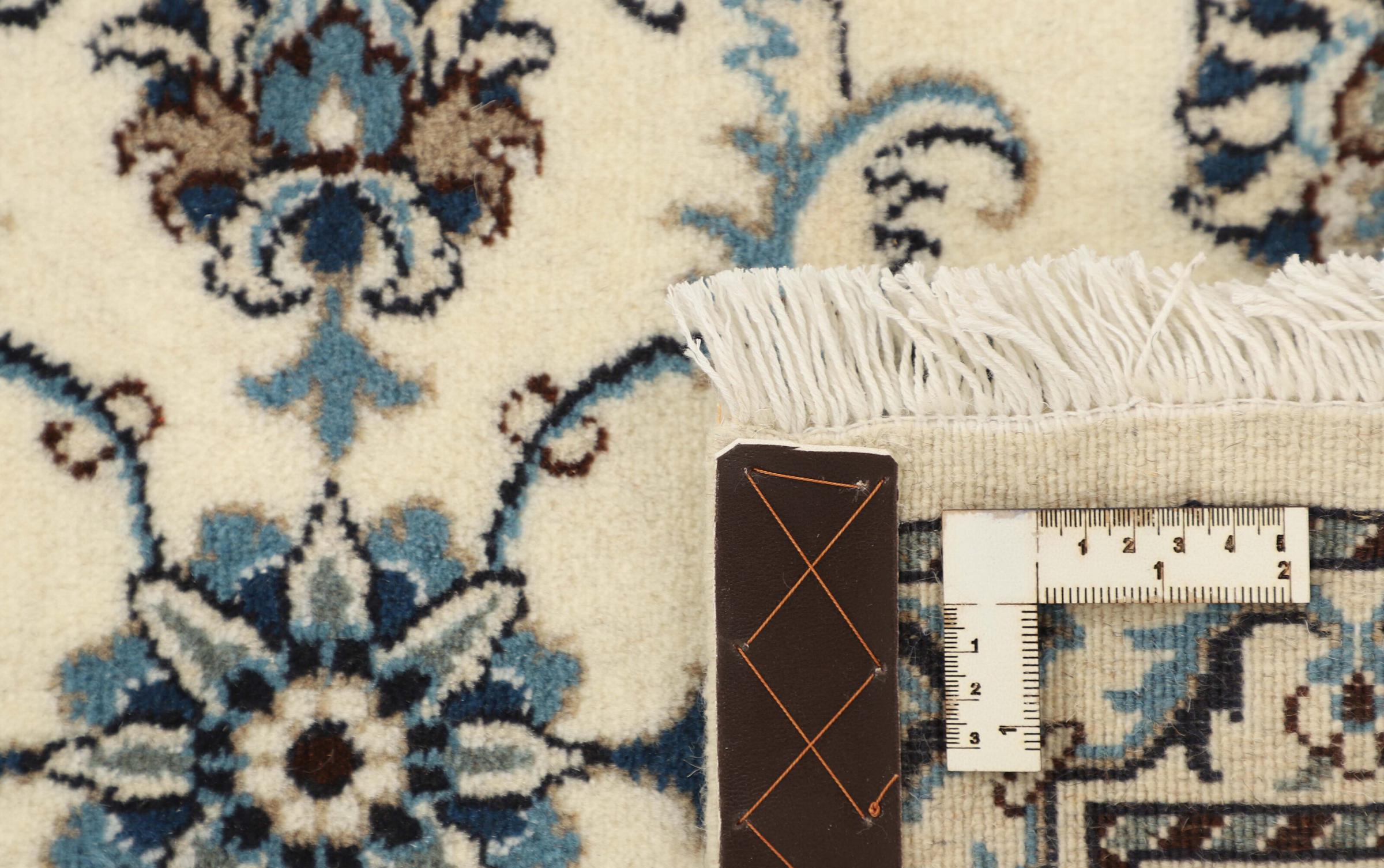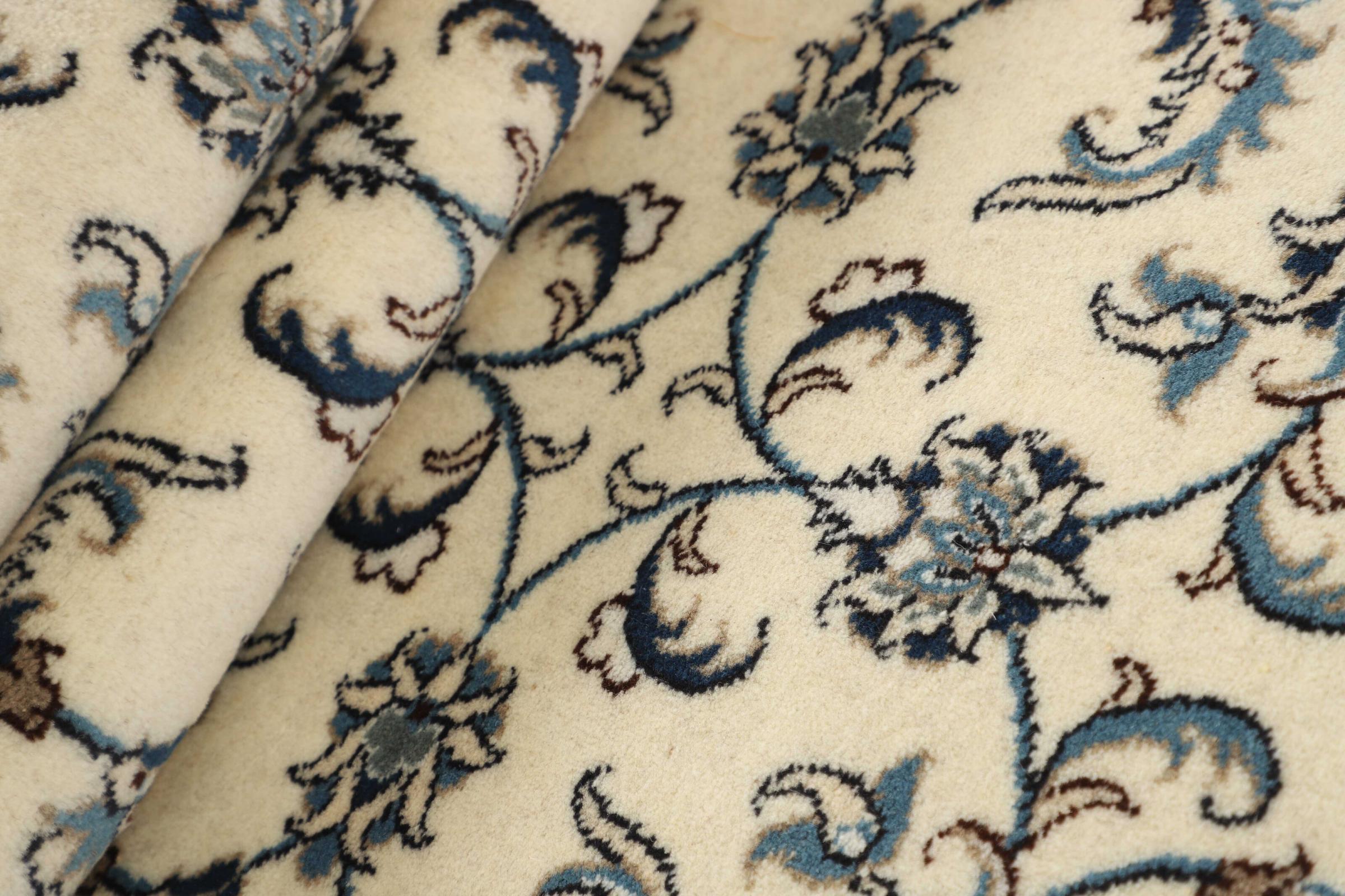 Dieser Nain-Teppich ist mit 12La klassifiziert. Elegant und edel wirkt er in seine typische Nain Farbgebung. Dieser Perserteppich wurde in der Stadt Nain, die am westlichen Rand der Wüste Dascht-e-Kavir liegt, aus hochwertige Wolle und Naturseide von Hand geknüpft. Mit 12La ist er nicht so fein und detailreich mit Ornamenten versehen, wie ein Nain 9La oder 6La.