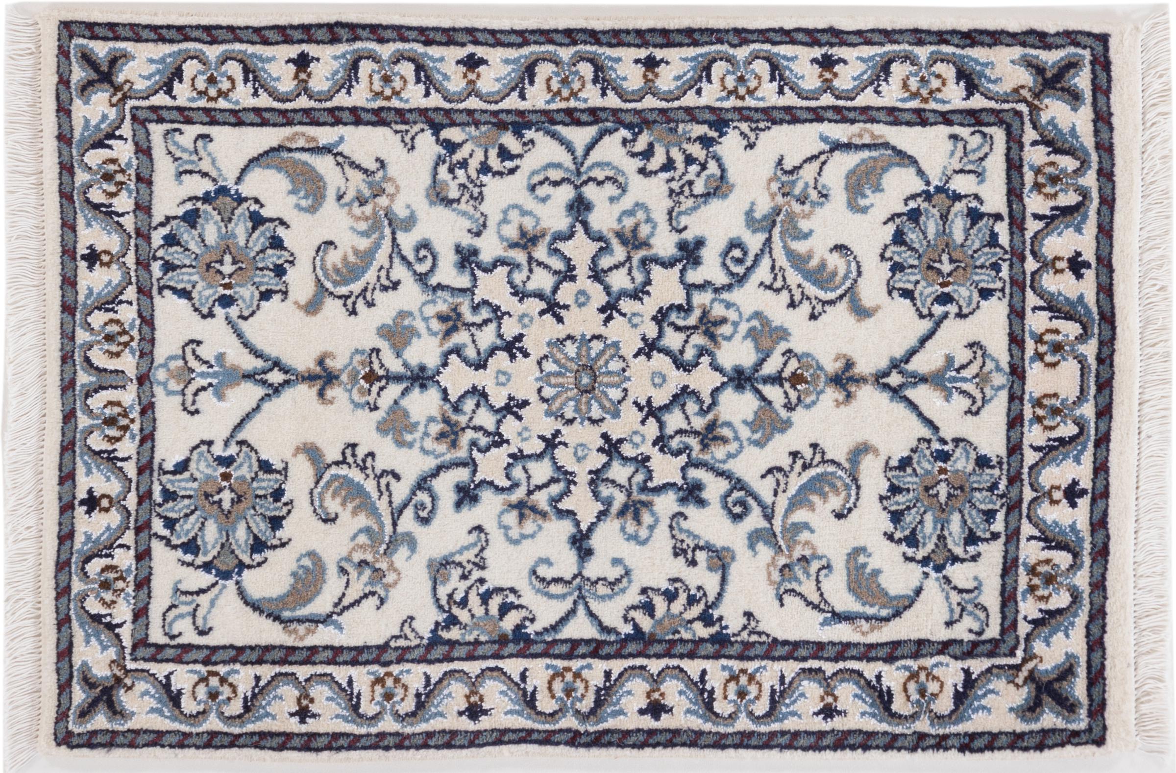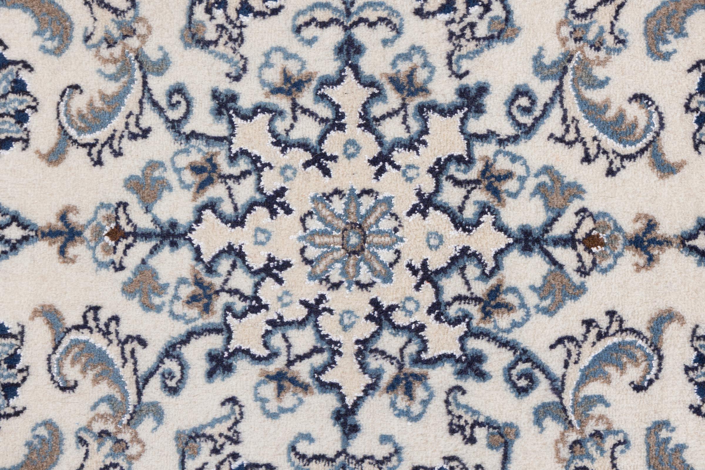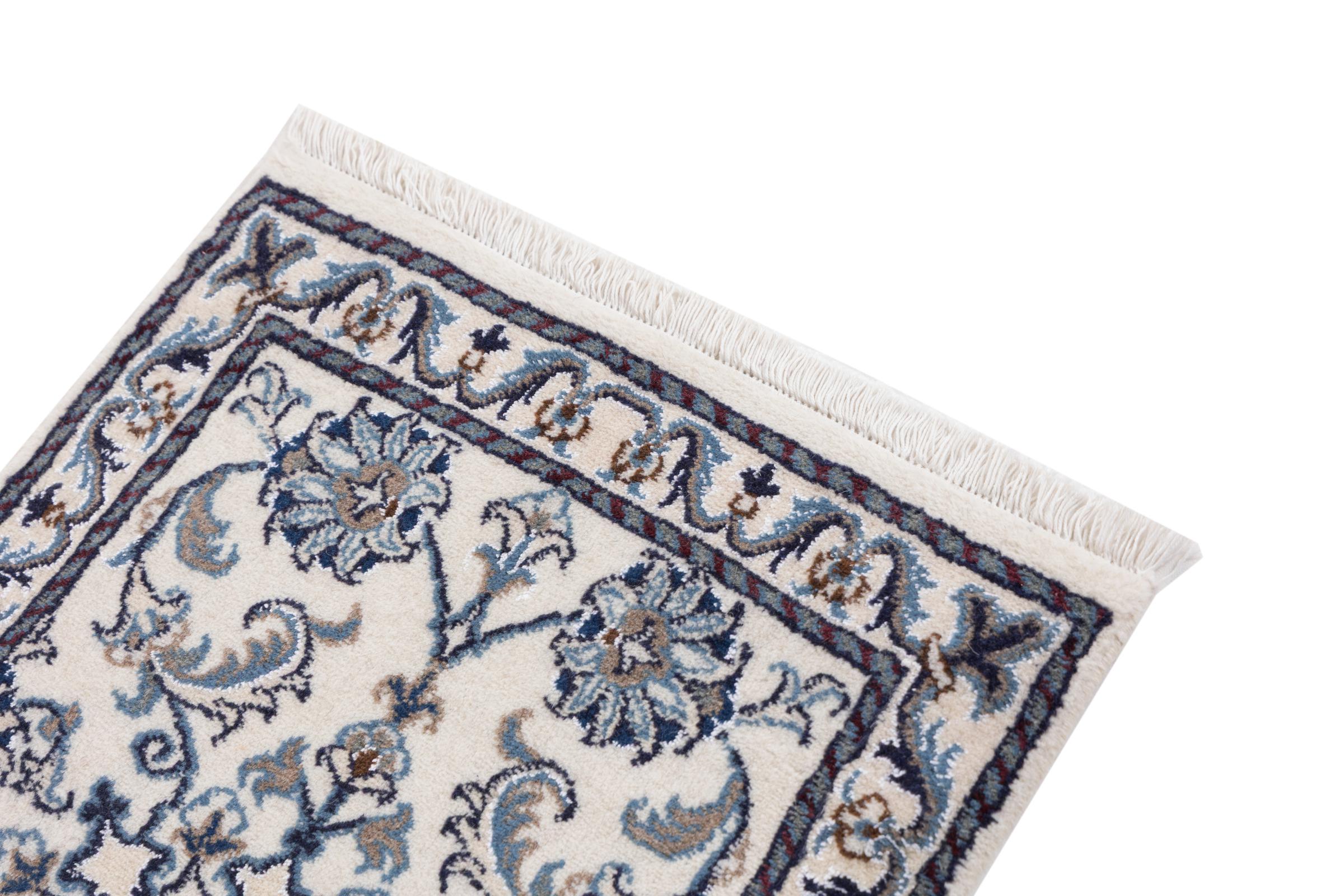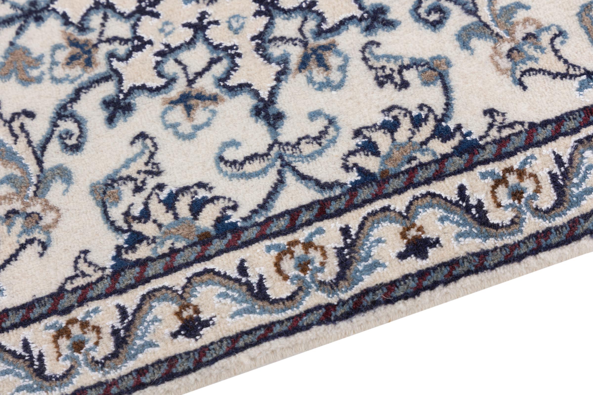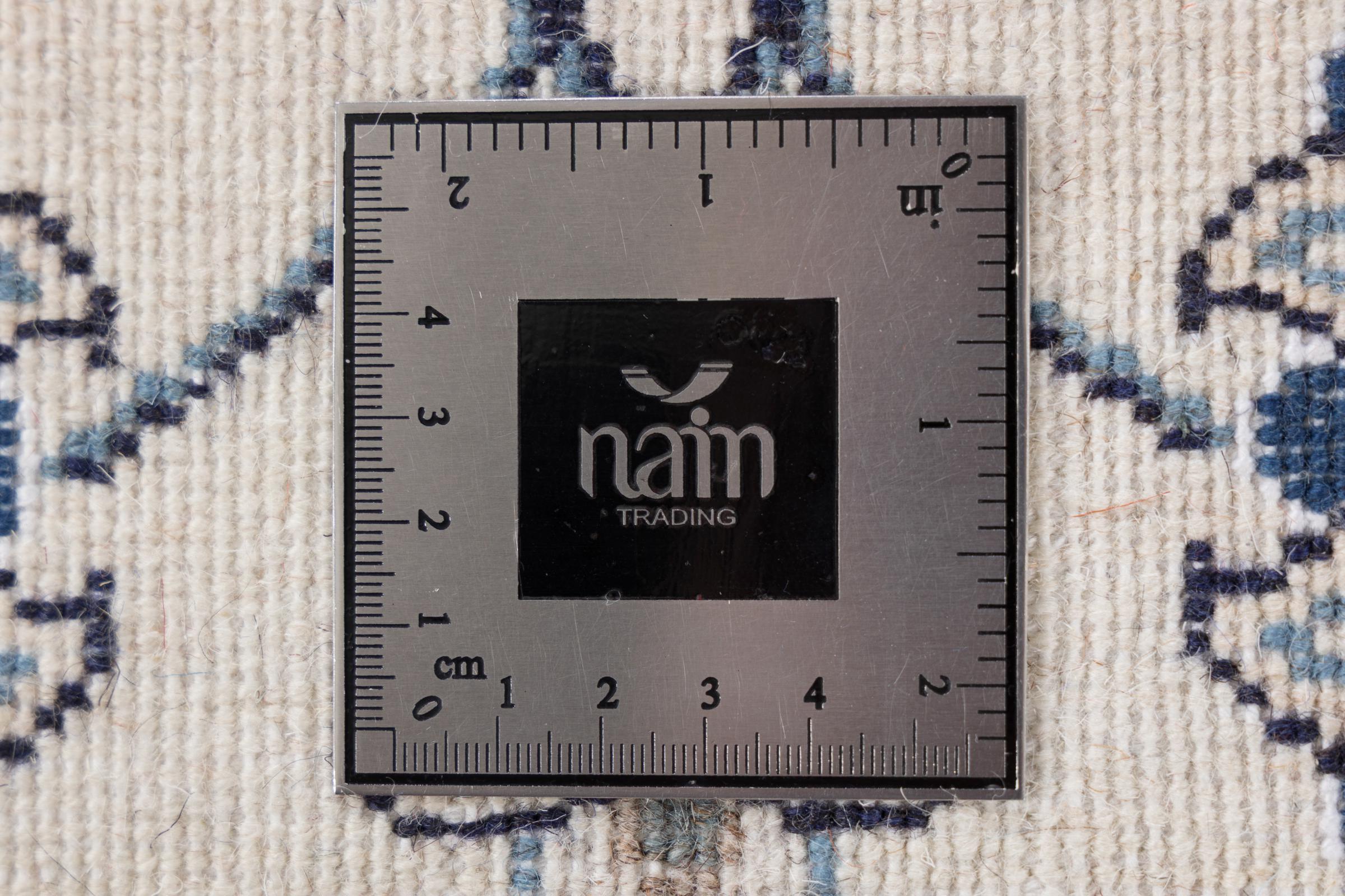 Dieser Nain-Teppich ist mit 12La klassifiziert. Elegant und edel wirkt er in seine typische Nain Farbgebung. Dieser Perserteppich wurde in der Stadt Nain, die am westlichen Rand der Wüste Dascht-e-Kavir liegt, aus hochwertige Wolle und Naturseide von Hand geknüpft. Mit 12La ist er nicht so fein und detailreich mit Ornamenten versehen, wie ein Nain 9La oder 6La.