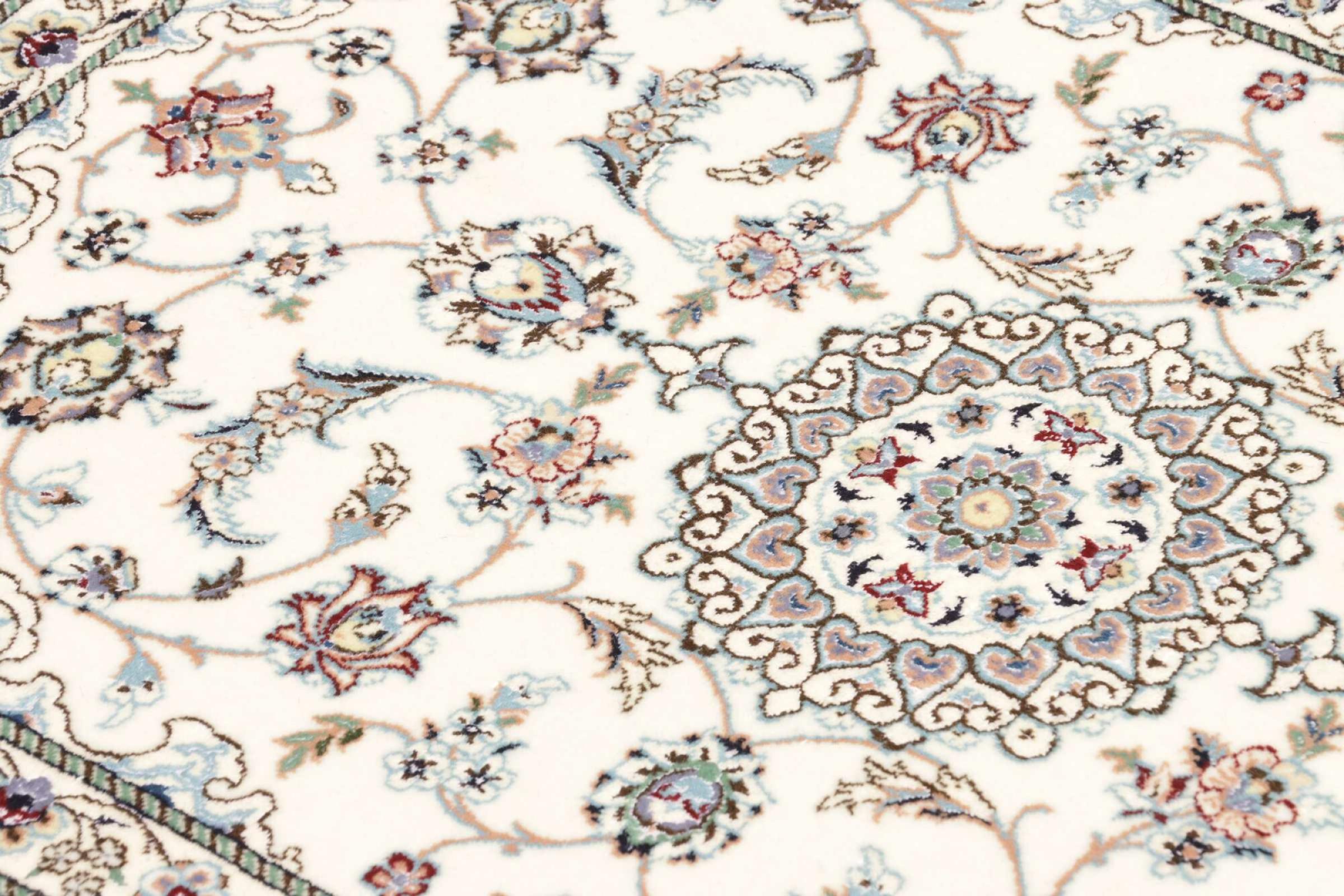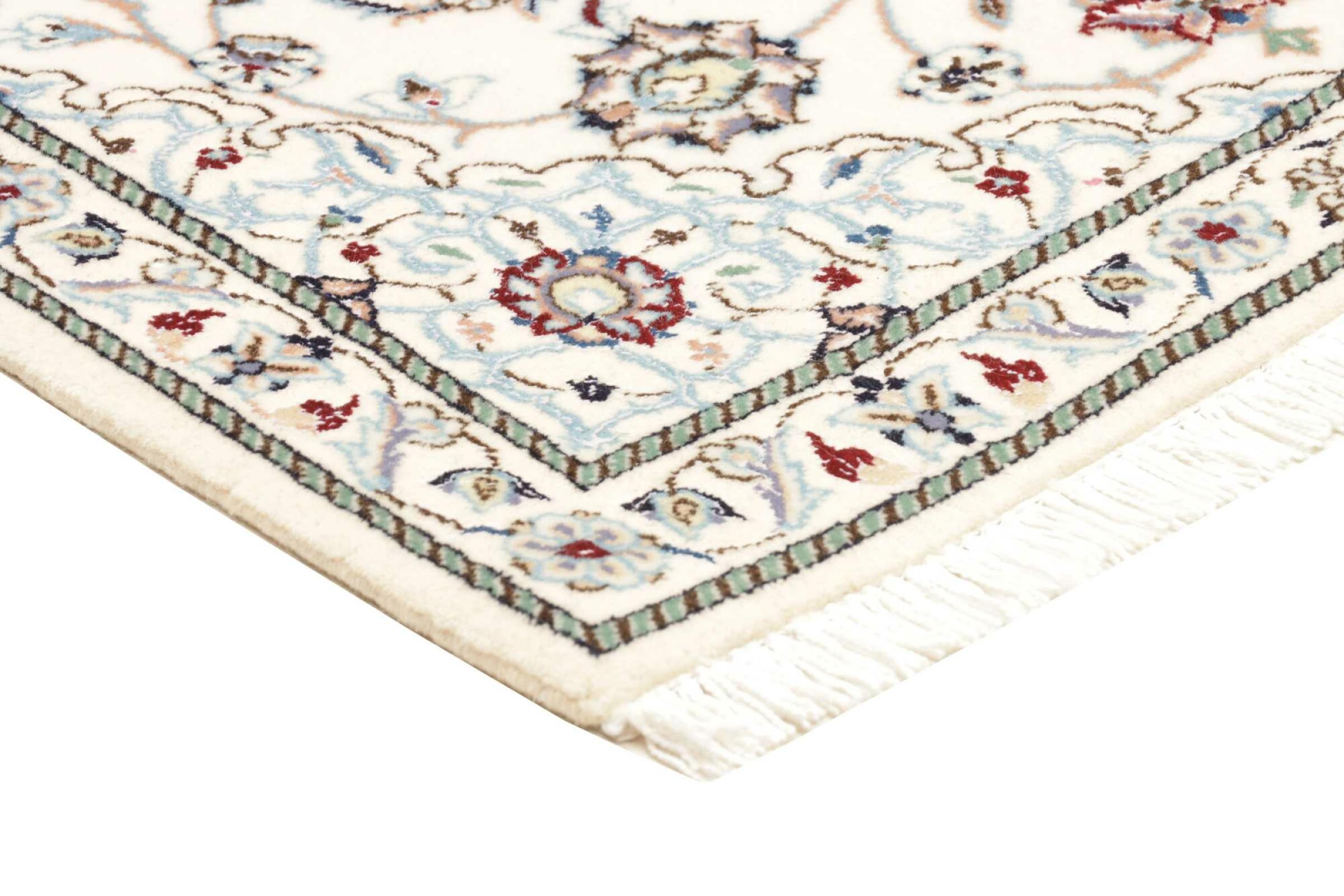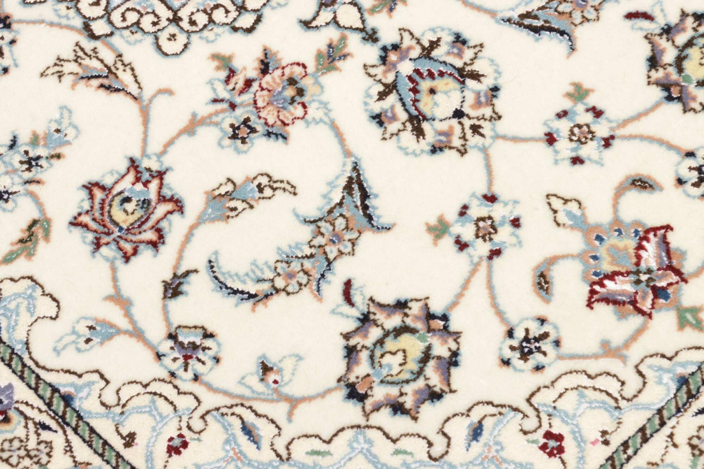Dieser Nain Teppich verbindet Qualität, Tradition und ein unverkennbares Design. Er wurde in der gleichnamigen Wüstenstadt Nain aus hochwertiger Korkwolle und Naturseide handgeknüpft. Liebhabern wertvoller Teppiche aus dem Iran wird dieser Perserteppich gefallen. Mit Nain Teppichen der 6La und 4La Klassifikation besitzt man ein echtes Kunstwerk mit einem unglaublichen Detailgrad, in dem man sich regelrecht verlieren kann. Nain 4La Teppiche sind heute kaum noch zu finden, da sie extrem aufwändig in der Fertigung sind.