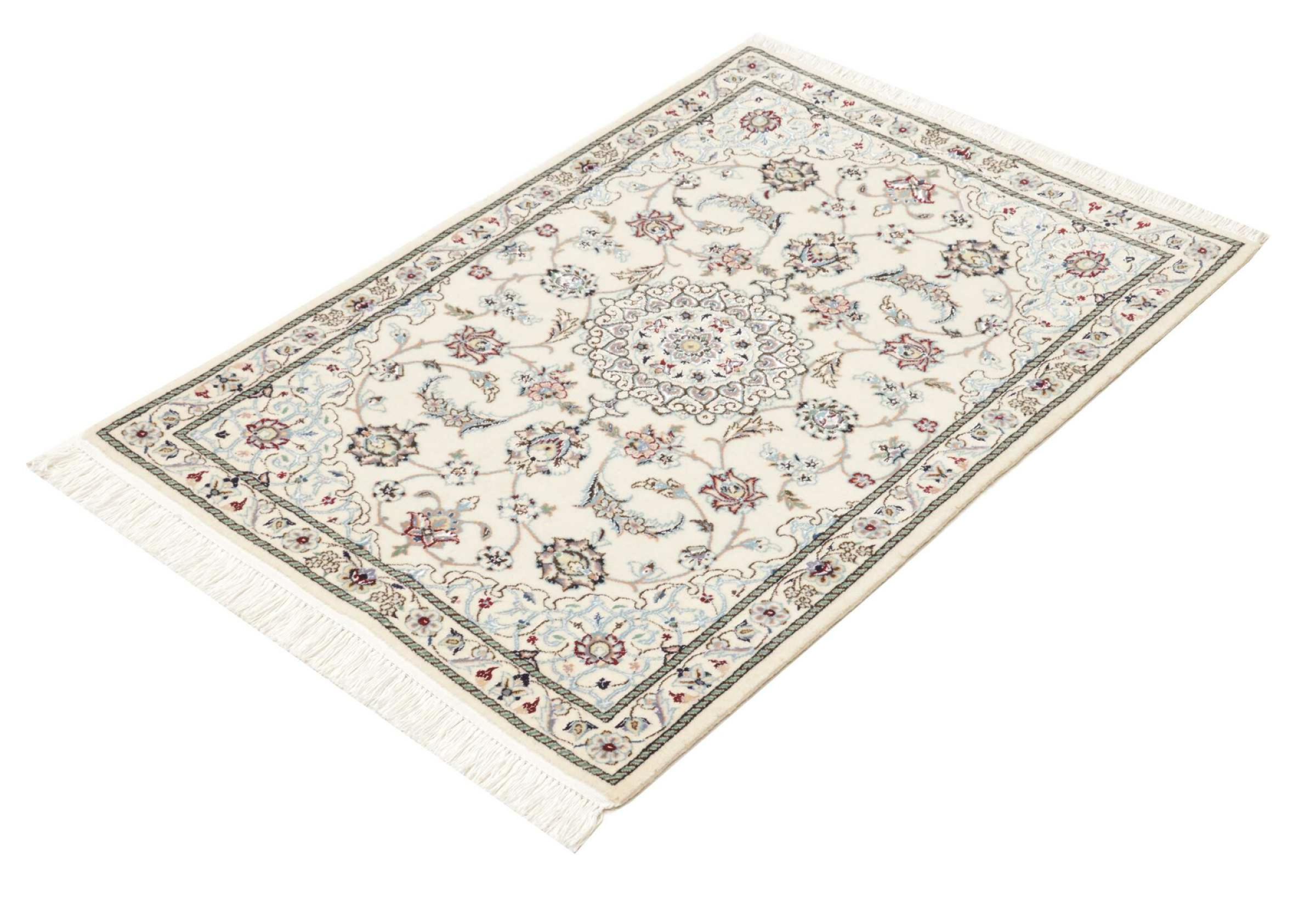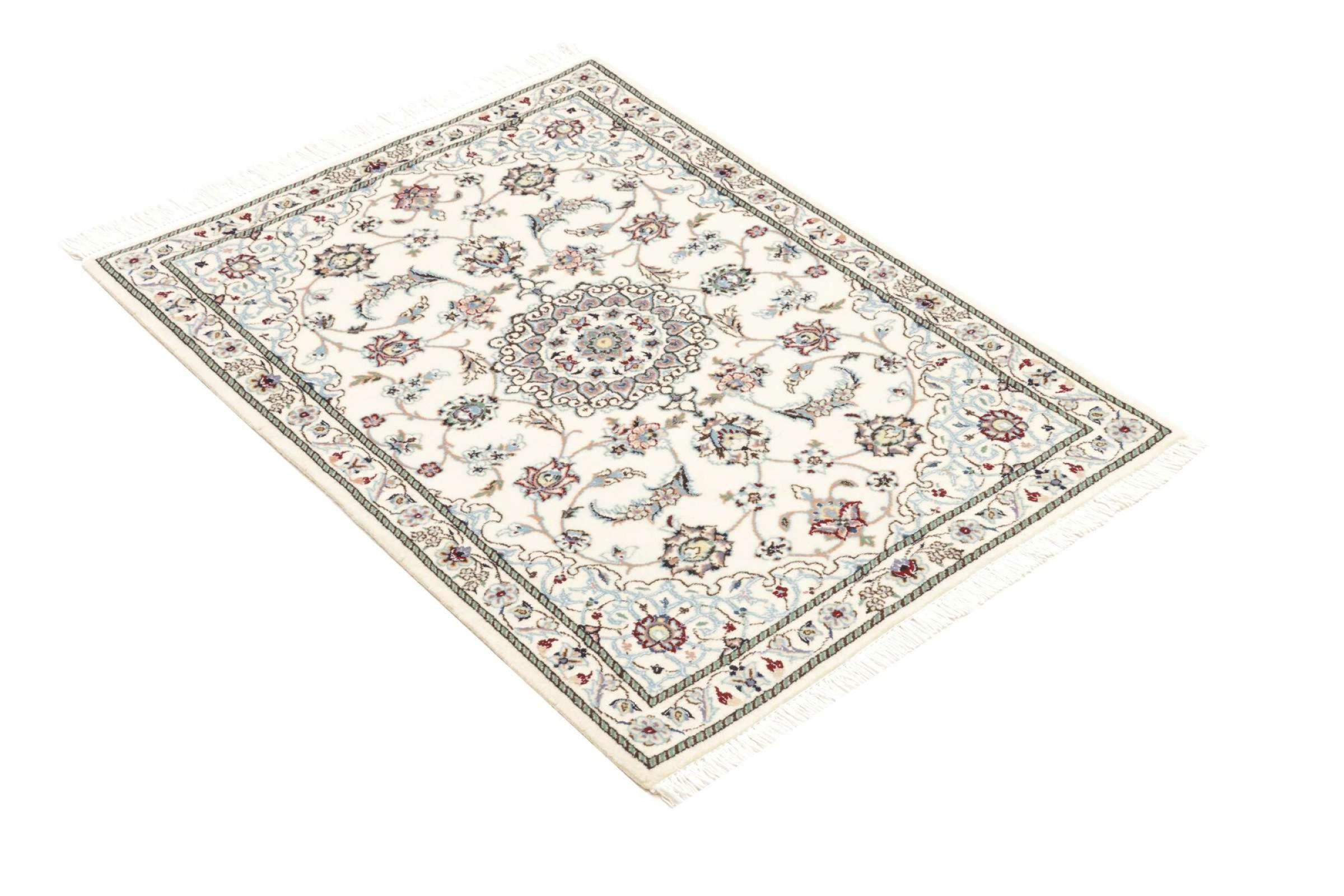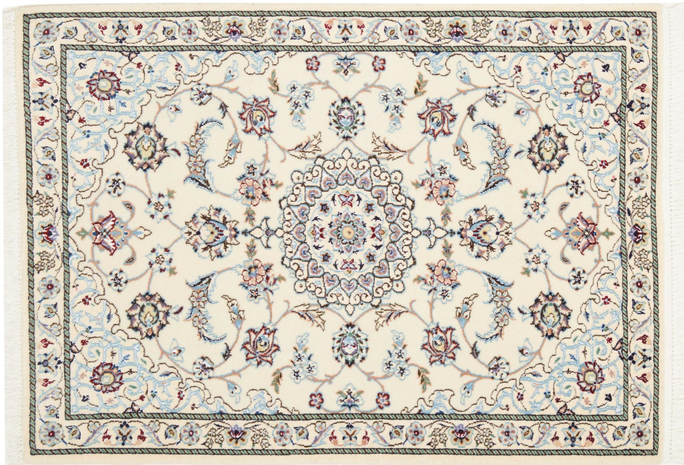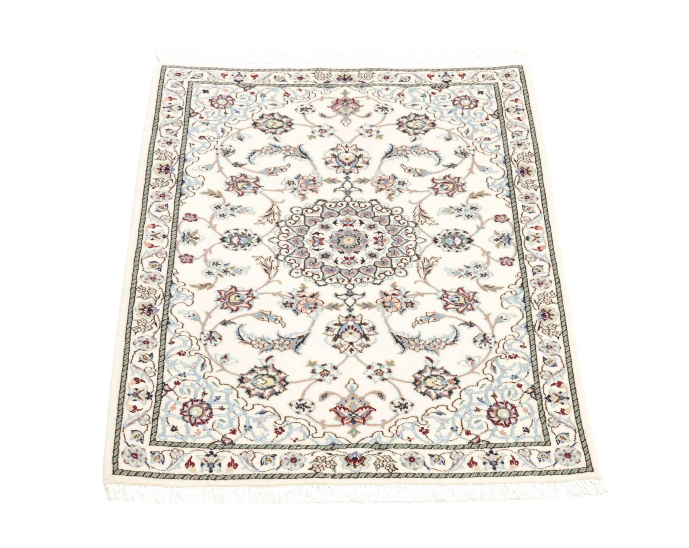 Dieser Nain Teppich verbindet Qualität, Tradition und ein unverkennbares Design. Er wurde in der gleichnamigen Wüstenstadt Nain aus hochwertiger Korkwolle und Naturseide handgeknüpft. Liebhabern wertvoller Teppiche aus dem Iran wird dieser Perserteppich gefallen. Mit Nain Teppichen der 6La und 4La Klassifikation besitzt man ein echtes Kunstwerk mit einem unglaublichen Detailgrad, in dem man sich regelrecht verlieren kann. Nain 4La Teppiche sind heute kaum noch zu finden, da sie extrem aufwändig in der Fertigung sind.