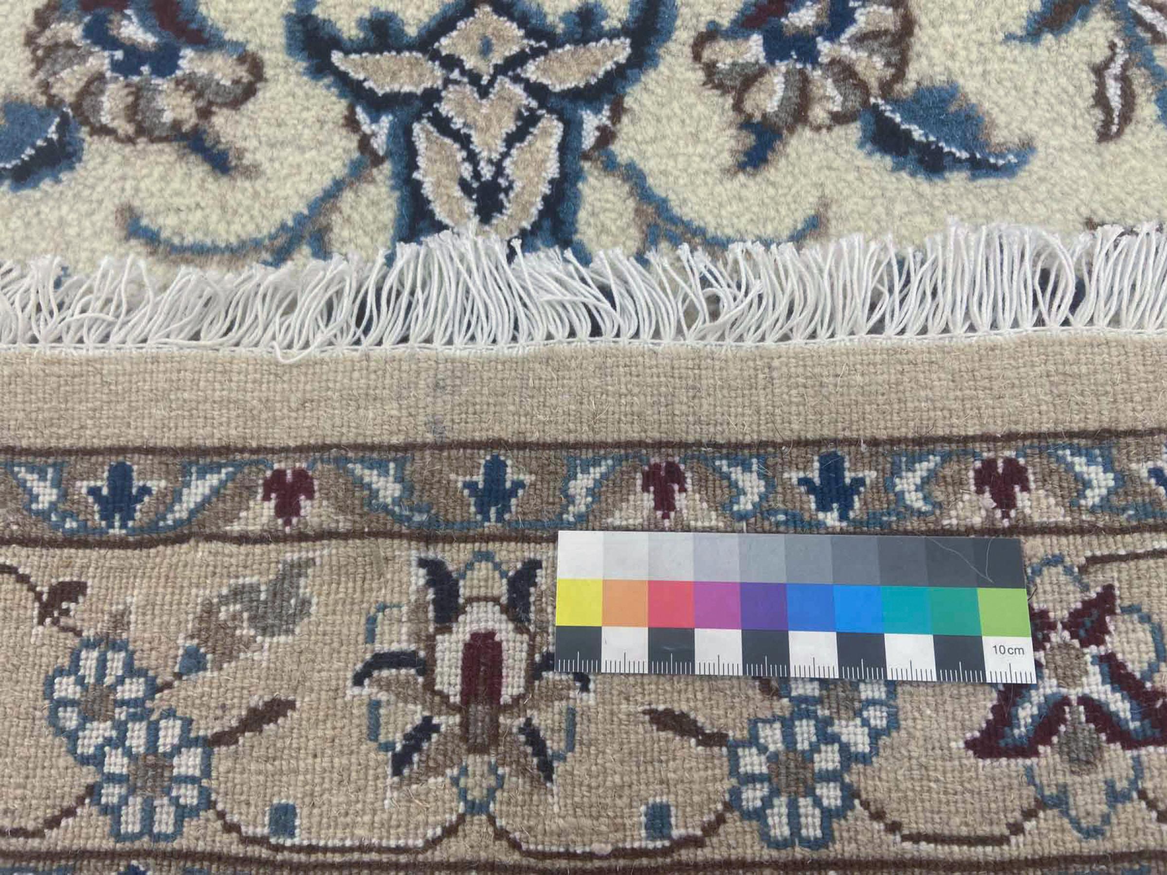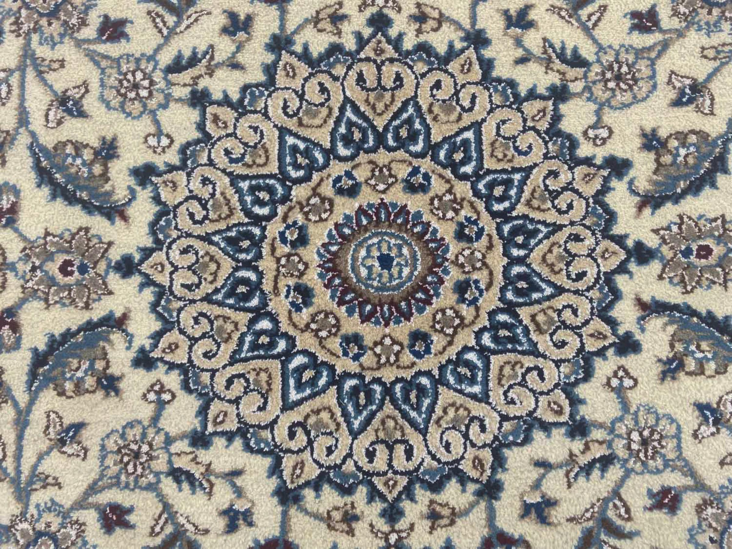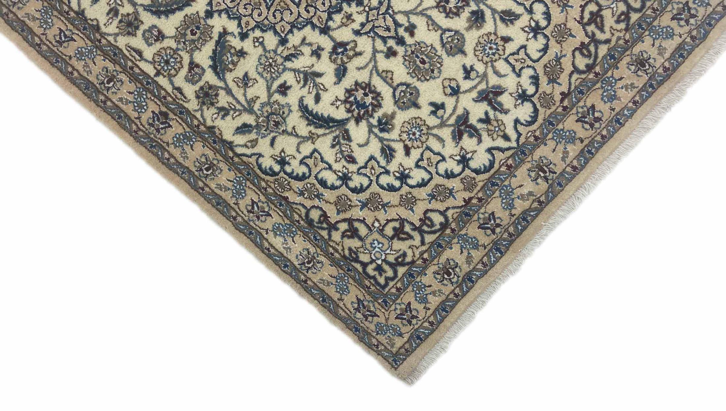 Dieser Nain Teppich ist mit 9La klassifiziert. Die ausgezeichnete Qualität, das schöne orientalische Design mit seinen kurvilinearen Mustern begeistert jeden Käufer. Dieser Perserteppich wurde in der Stadt Nain, die am westlichen Rand der Wüste Dascht-e-Kavir liegt, aus hochwertiger Wolle und Naturseide handgeknüpft. 9La Nain sind deutlich feiner als ein 12La und zeigen bereits schöne Details.