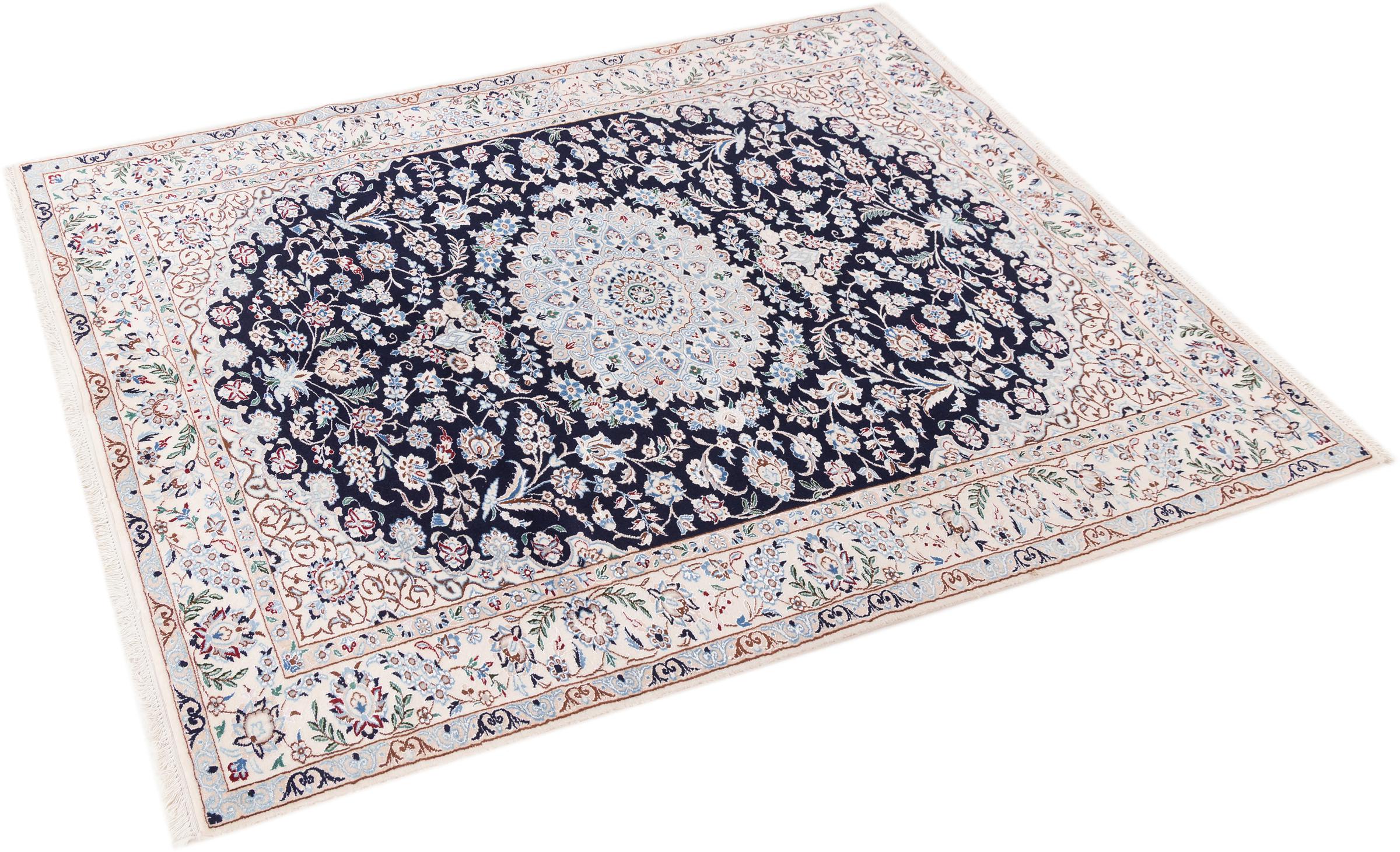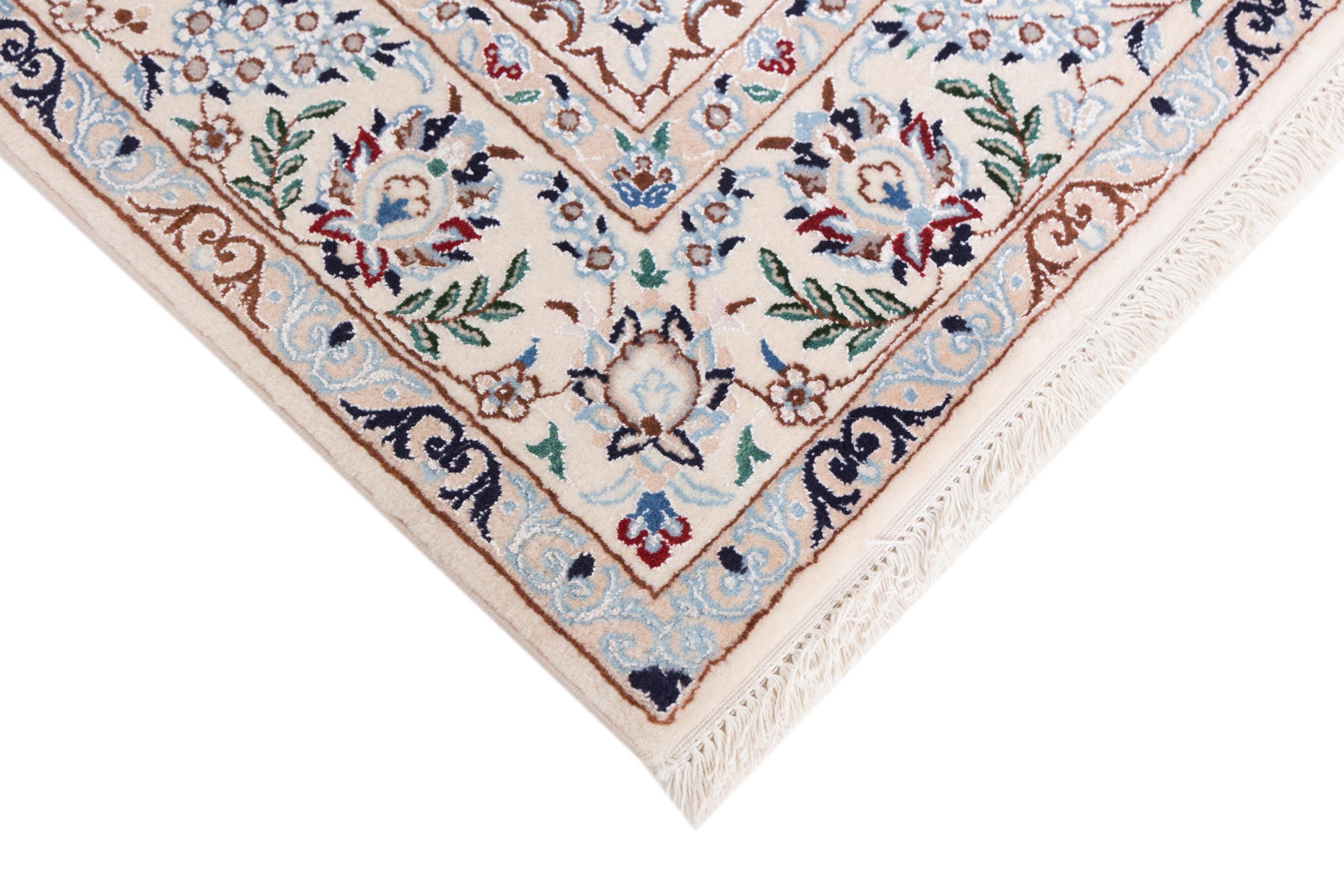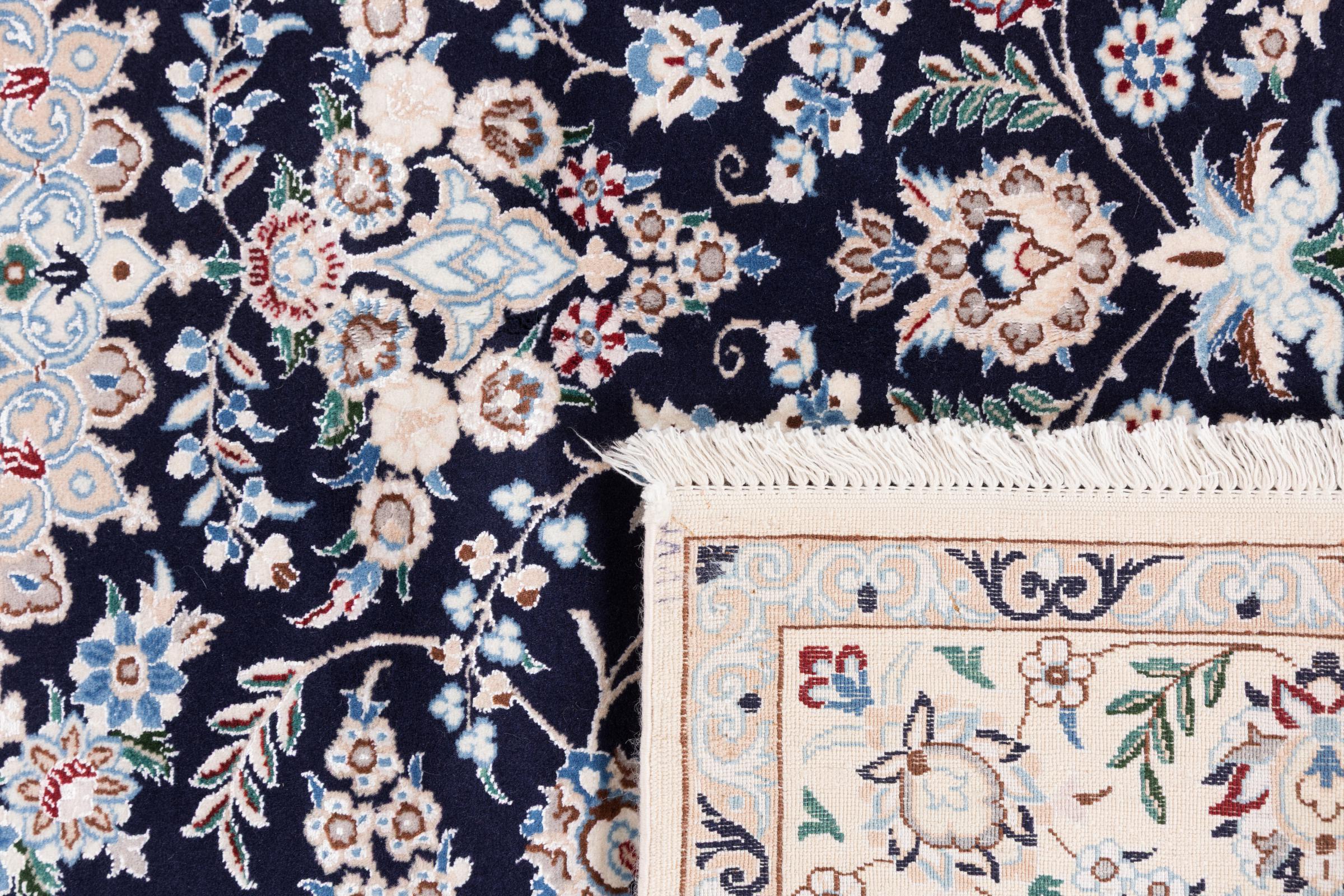 Dieser Nain Teppich verbindet Qualität, Tradition und ein unverkennbares Design. Er wurde in der gleichnamigen Wüstenstadt Nain aus hochwertiger Korkwolle und Naturseide handgeknüpft. Liebhabern wertvoller Teppiche aus dem Iran wird dieser Perserteppich gefallen. Mit Nain Teppichen der 6La und 4La Klassifikation besitzt man ein echtes Kunstwerk mit einem unglaublichen Detailgrad, in dem man sich regelrecht verlieren kann. Nain 4La Teppiche sind heute kaum noch zu finden, da sie extrem aufwändig in der Fertigung sind.