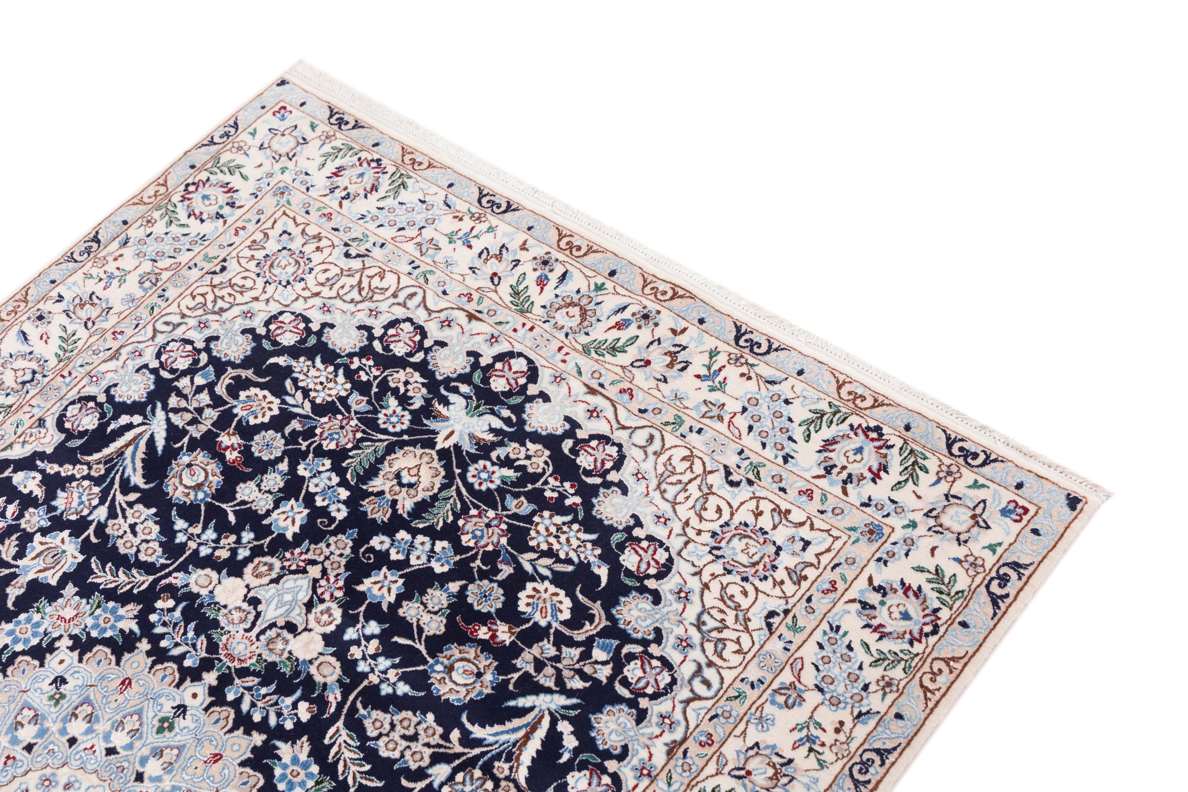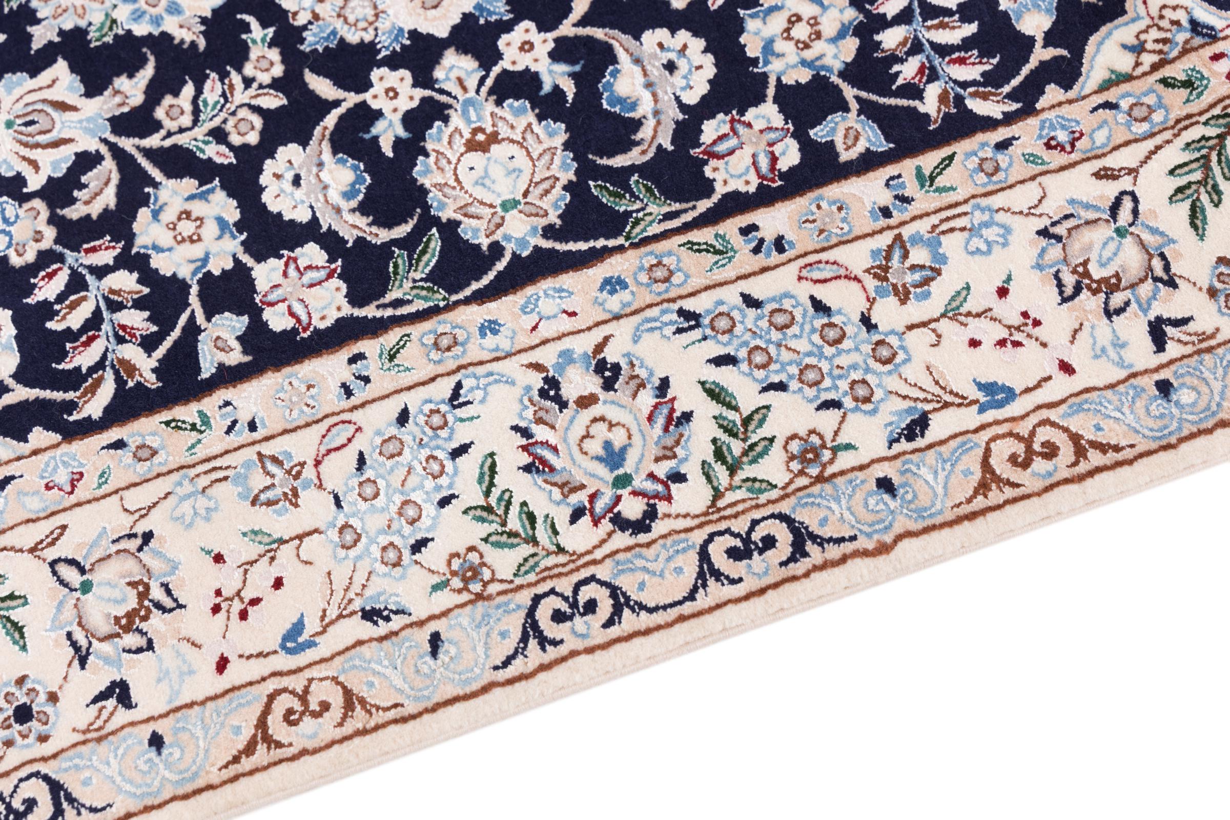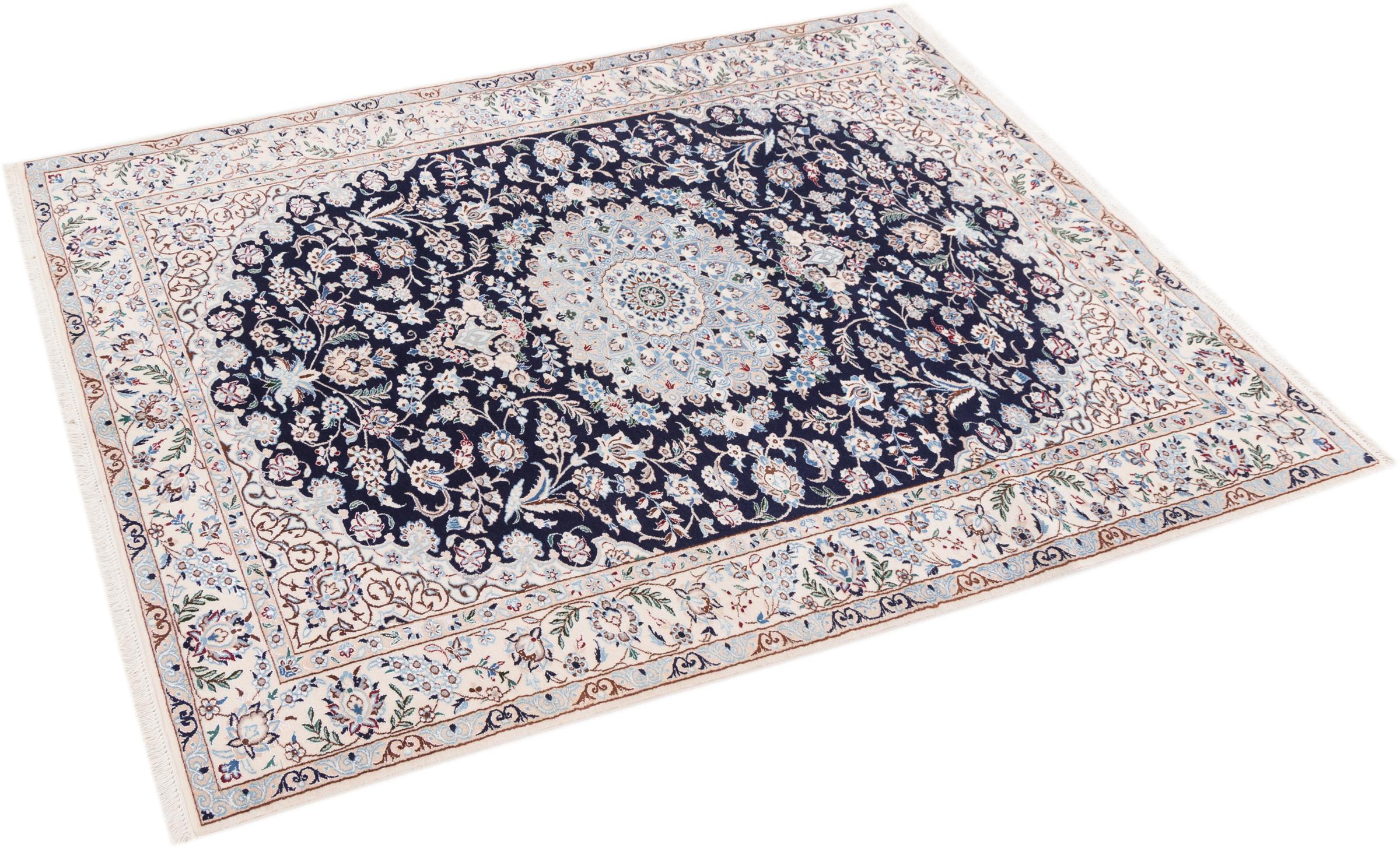Dieser Nain Teppich verbindet Qualität, Tradition und ein unverkennbares Design. Er wurde in der gleichnamigen Wüstenstadt Nain aus hochwertiger Korkwolle und Naturseide handgeknüpft. Liebhabern wertvoller Teppiche aus dem Iran wird dieser Perserteppich gefallen. Mit Nain Teppichen der 6La und 4La Klassifikation besitzt man ein echtes Kunstwerk mit einem unglaublichen Detailgrad, in dem man sich regelrecht verlieren kann. Nain 4La Teppiche sind heute kaum noch zu finden, da sie extrem aufwändig in der Fertigung sind.
