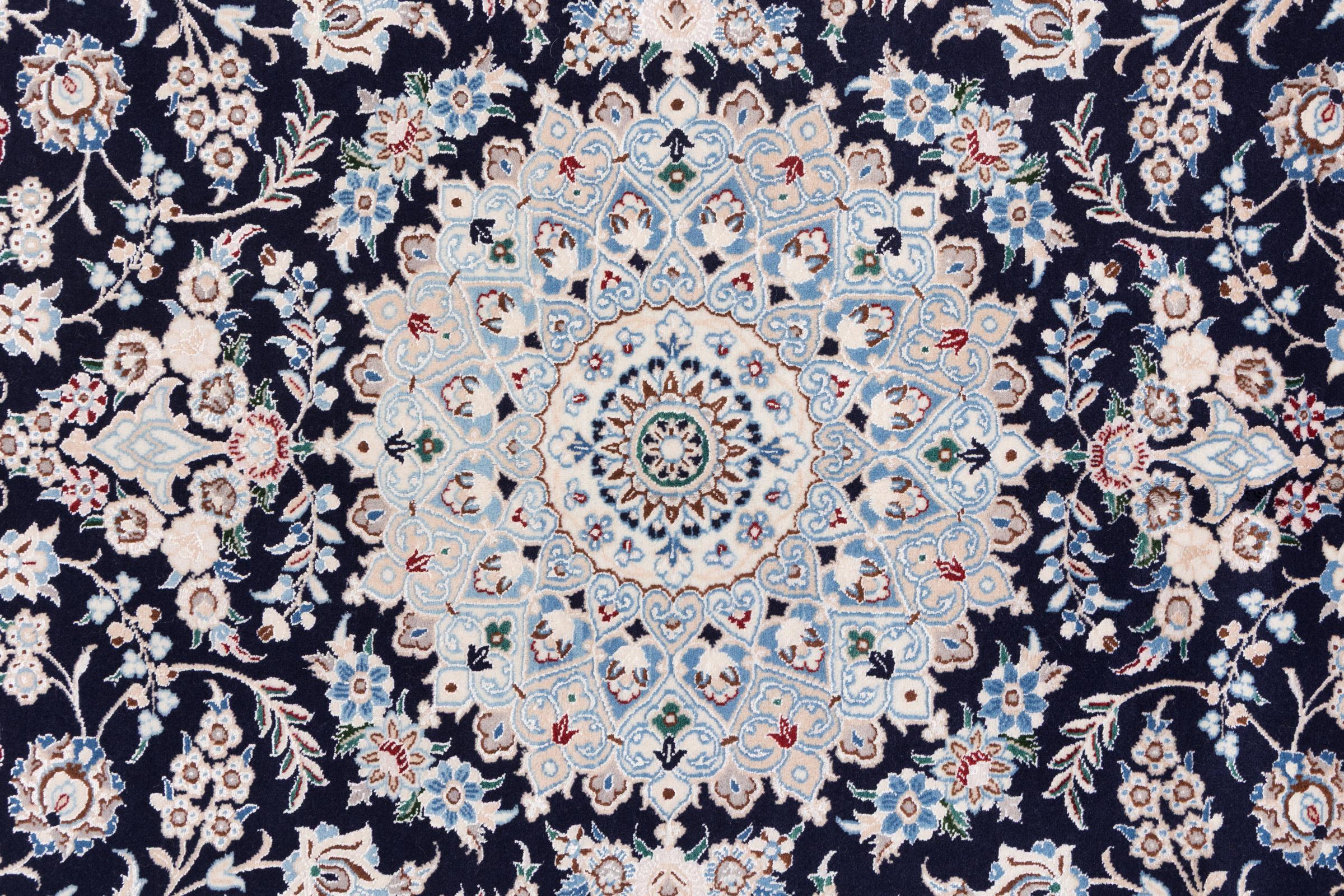 Teppiche aus der Stadt Nain, von der Grenze einer der größten Wüsten des Irans, gehören zu den wohl bekanntesten Perserteppichen weltweit. Ihr typisches Design ist unverwechselbar mit floralen Ornamenten, einem Mittelmedallion sowie beigen und roten oder blauen Farbtönen gehalten. Dank ihrer Bezeichnungen 4La, 6La, 9La und 12La lassen sich die Feinheiten eines Nain Teppichs auf einen Blick erkennen. Dabei gilt, je geringer die „La“ Zahl, desto höher die Knotendichte und somit auch die Feinheit des Teppichs.
