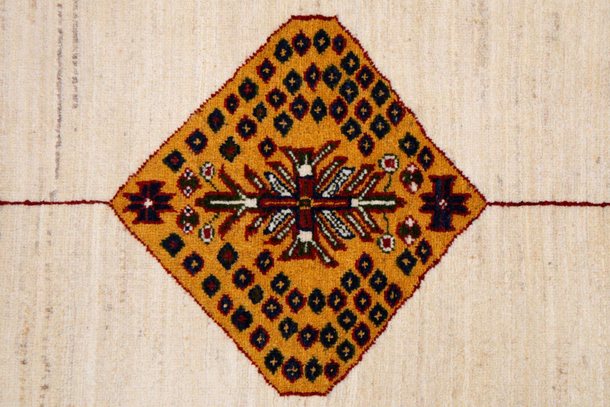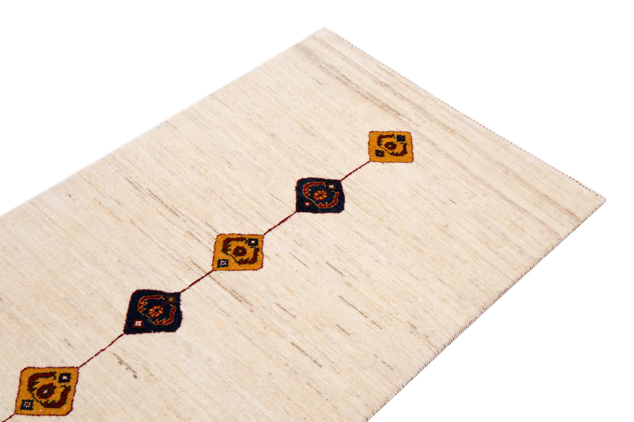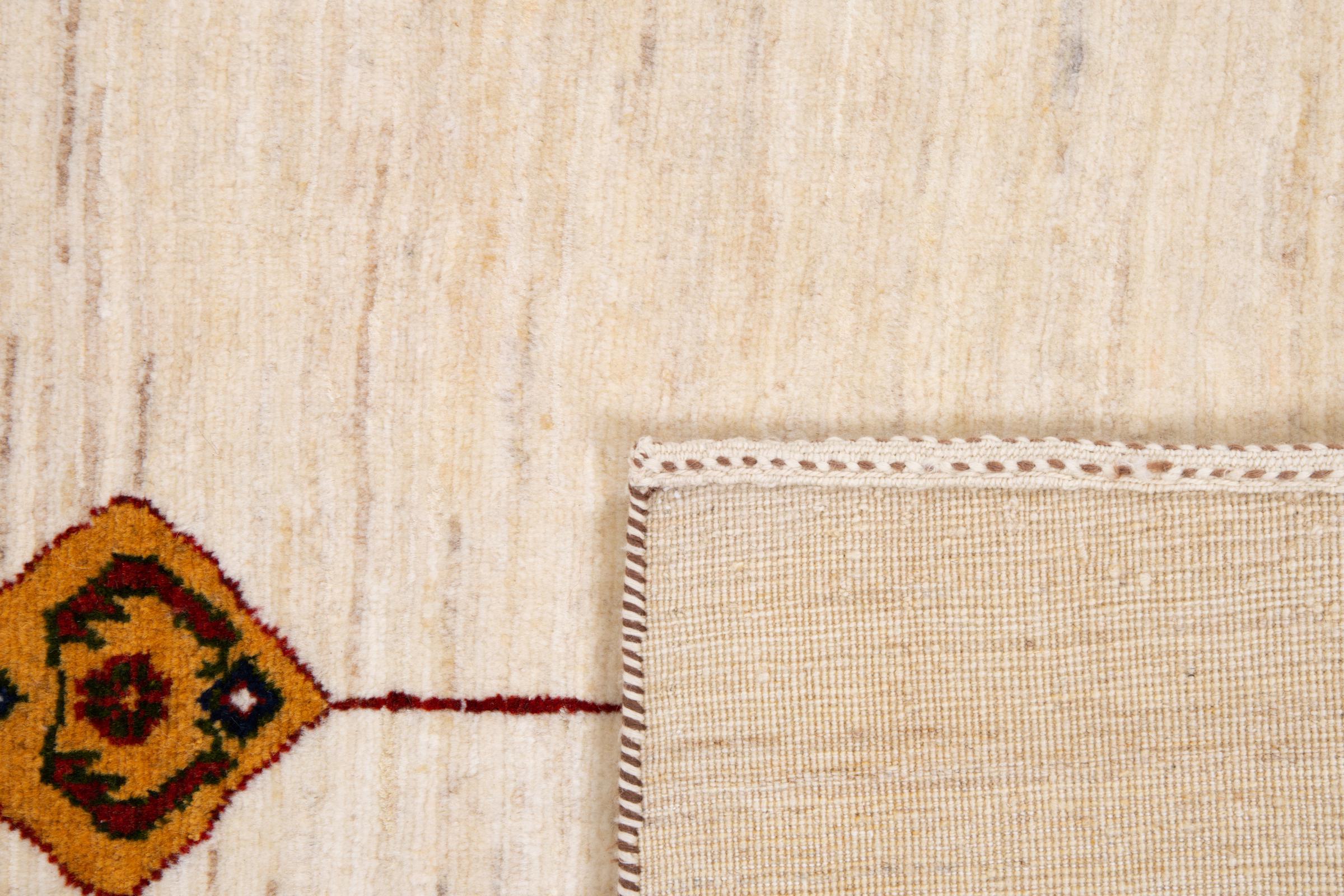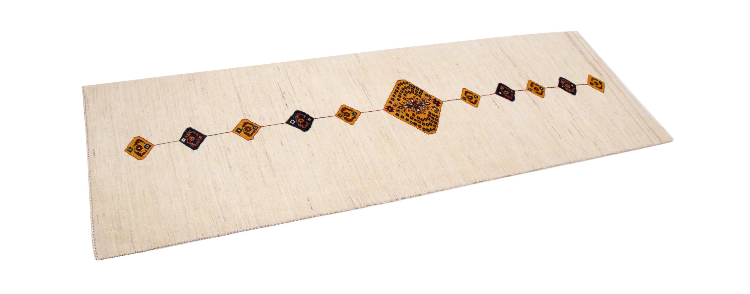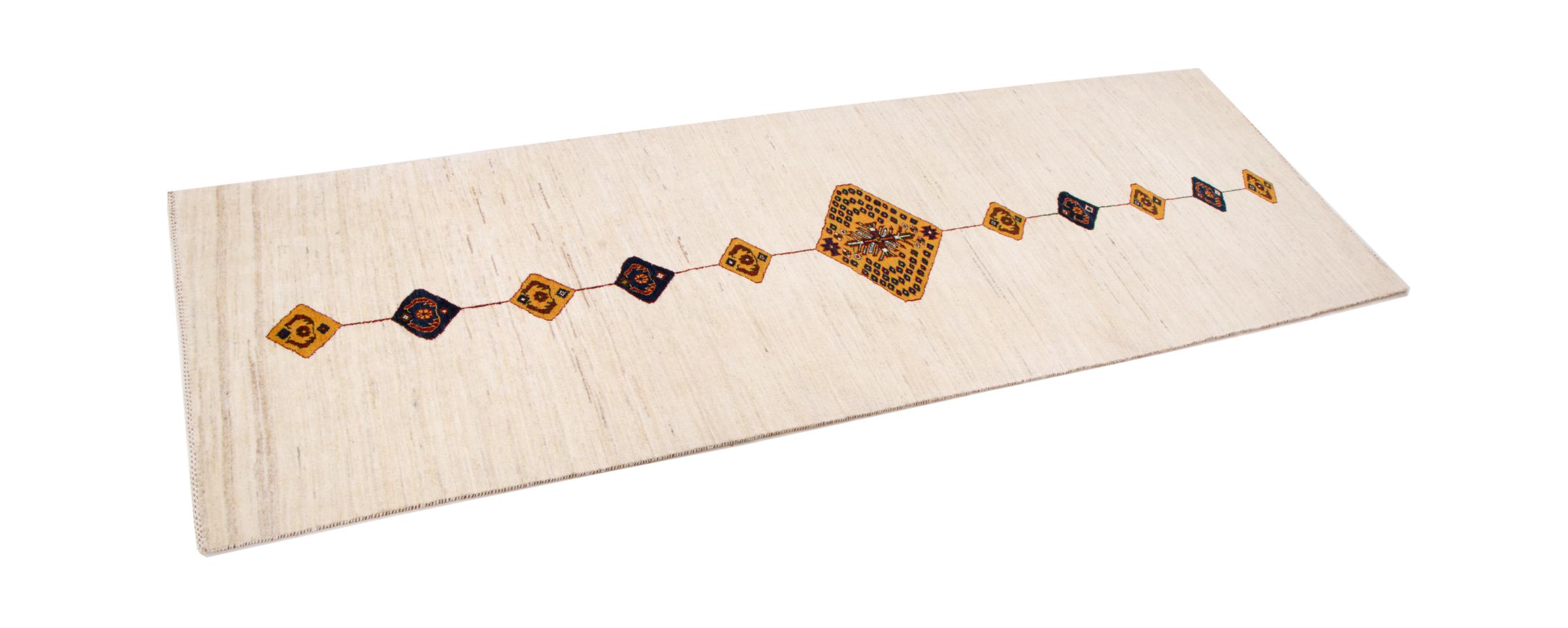 Dieser schöne Teppich ist ein persischer Gabbeh und gehört damit zu den hochwertigsten Gabbeh Teppichen. Die Teppiche werden von Nomaden oder Halbnomaden im Iran nach traditionellem Kunsthandwerk geknüpft. Die schlichten Motive und Muster sind meist aus der unmittelbaren Umgebung der Nomaden inspiriert. So sind beispielsweise Kamele, Bäume oder Büsche auf den traditionellen Teppichen zu finden. Perser Gabbeh Teppiche bestehen aus Wolle von lokal gehaltenen Schafherden. Die Wolle ist daher meist noch von Hand gesponnen. So verkörpert jeder dieser Orientteppiche einen einzigartigen Charakter jahrhundertealter Kultur.