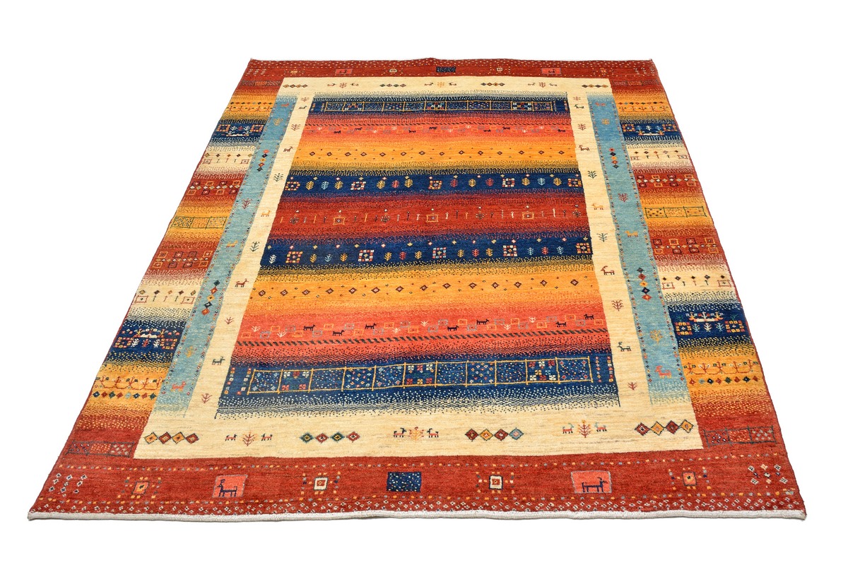 Dieser schöne Teppich ist ein persischer Gabbeh und gehört damit zu den hochwertigsten Gabbeh Teppichen. Die Teppiche werden von Nomaden oder Halbnomaden im Iran nach traditionellem Kunsthandwerk geknüpft. Die schlichten Motive und Muster sind meist aus der unmittelbaren Umgebung der Nomaden inspiriert. So sind beispielsweise Kamele, Bäume oder Büsche auf den traditionellen Teppichen zu finden. Perser Gabbeh Teppiche bestehen aus Wolle von lokal gehaltenen Schafherden. Die Wolle ist daher meist noch von Hand gesponnen. So verkörpert jeder dieser Orientteppiche einen einzigartigen Charakter jahrhundertealter Kultur.