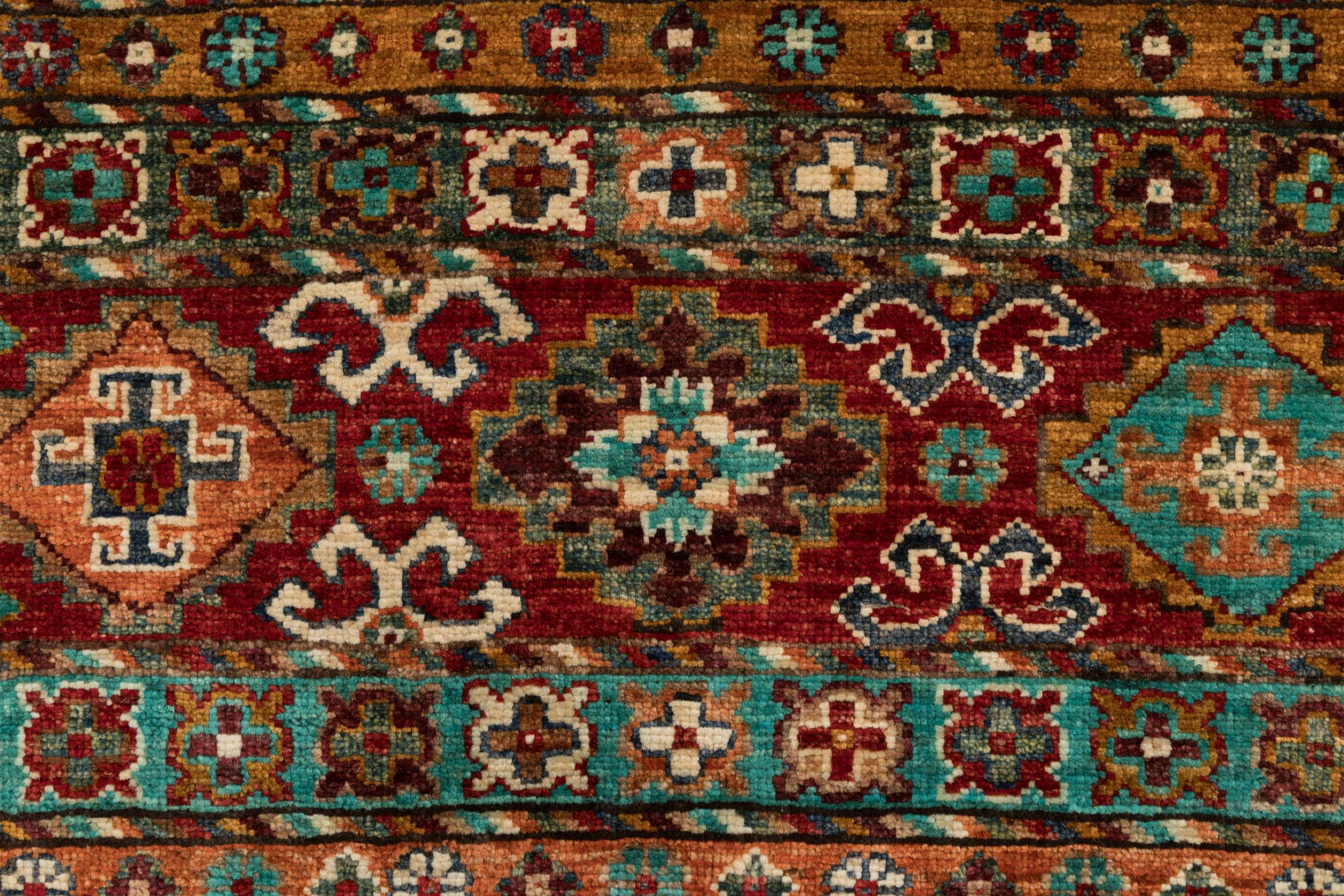 Dieser handgeknüpfte Kazak wurde im Stil der Kaukasus Teppiche von Hand geknüpft und überzeugt mit seiner hohen Robustheit und seinen lebhaften Farbtönen. Somit spiegelt er die Kultur des Kaukasus in einer wunderschönen Komposition wider. Eine Kultur, die seit Jahrhunderten die Kunst des Teppichknüpfens beherrscht und mit reizvoll schlichten Formen in beeindruckend lebendigen Farben nach Außen trägt.