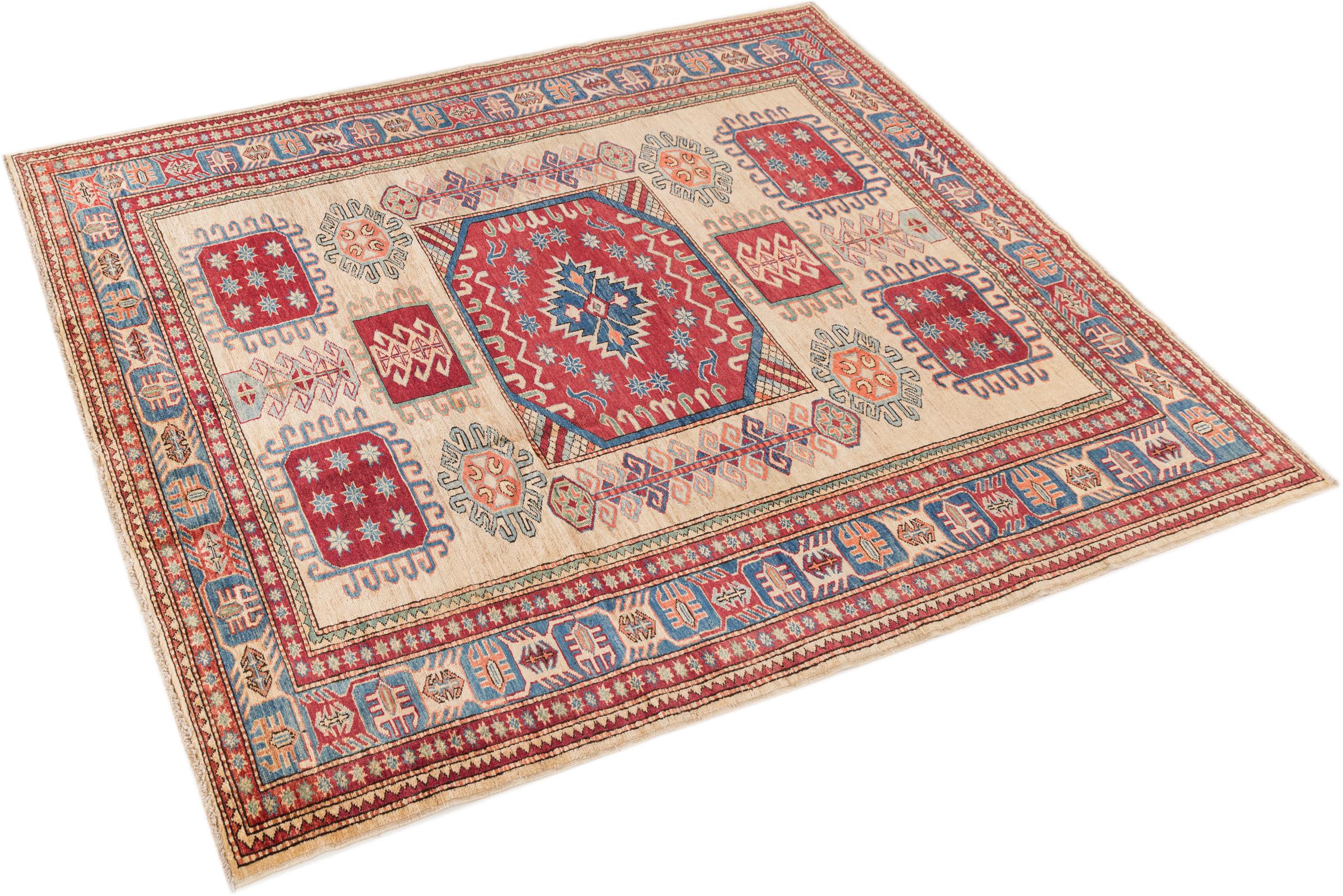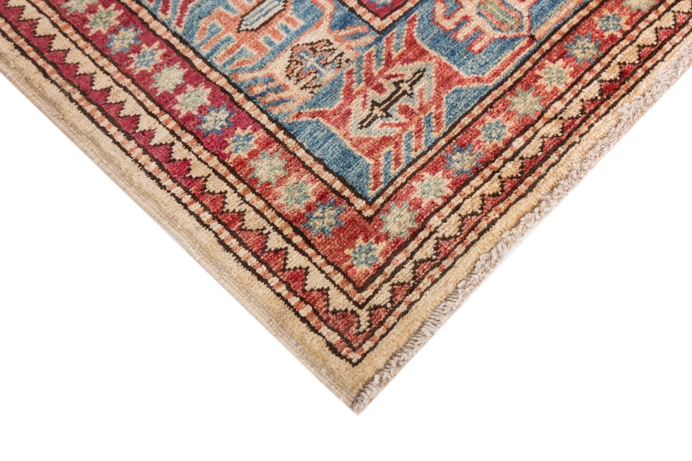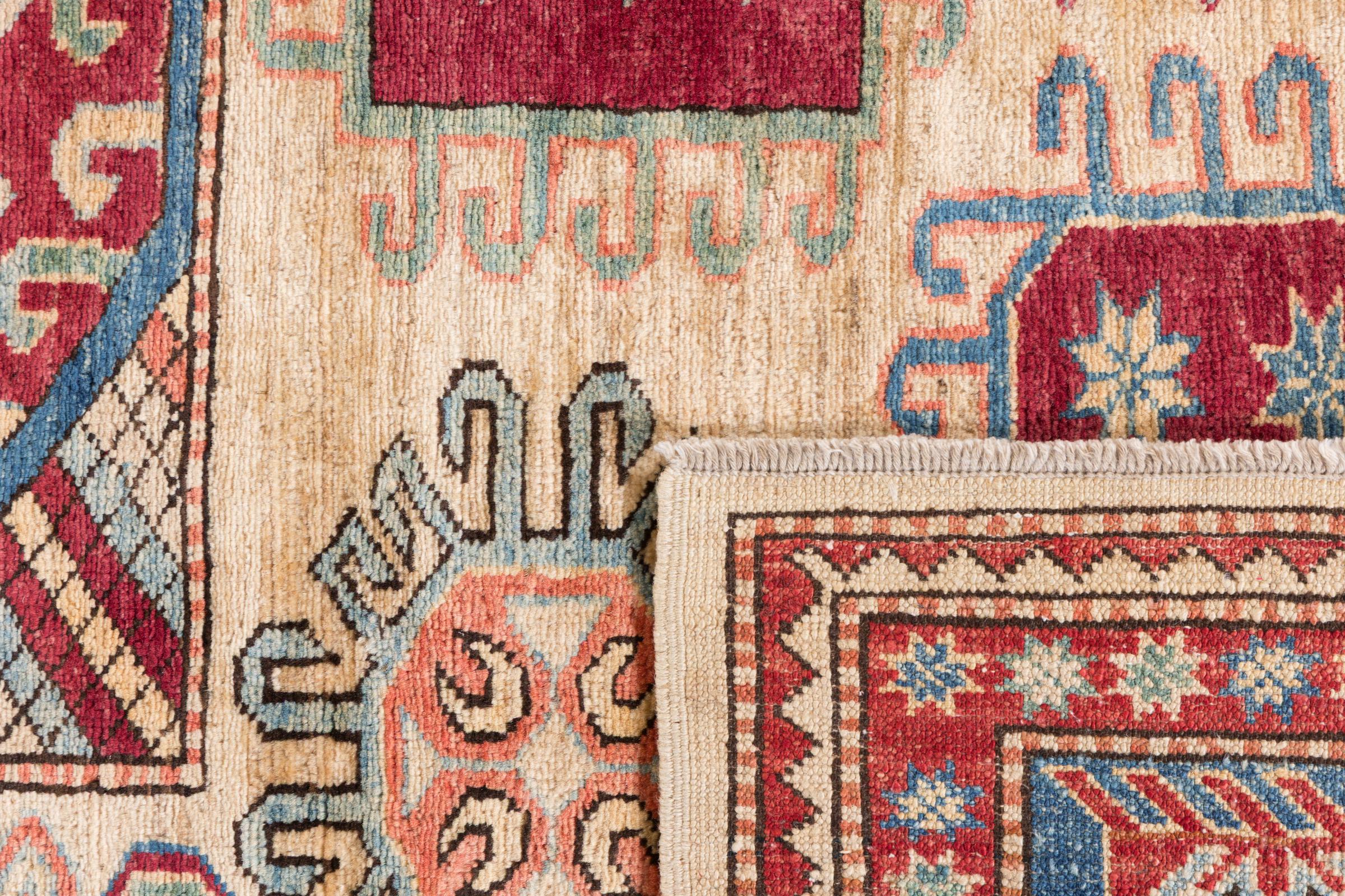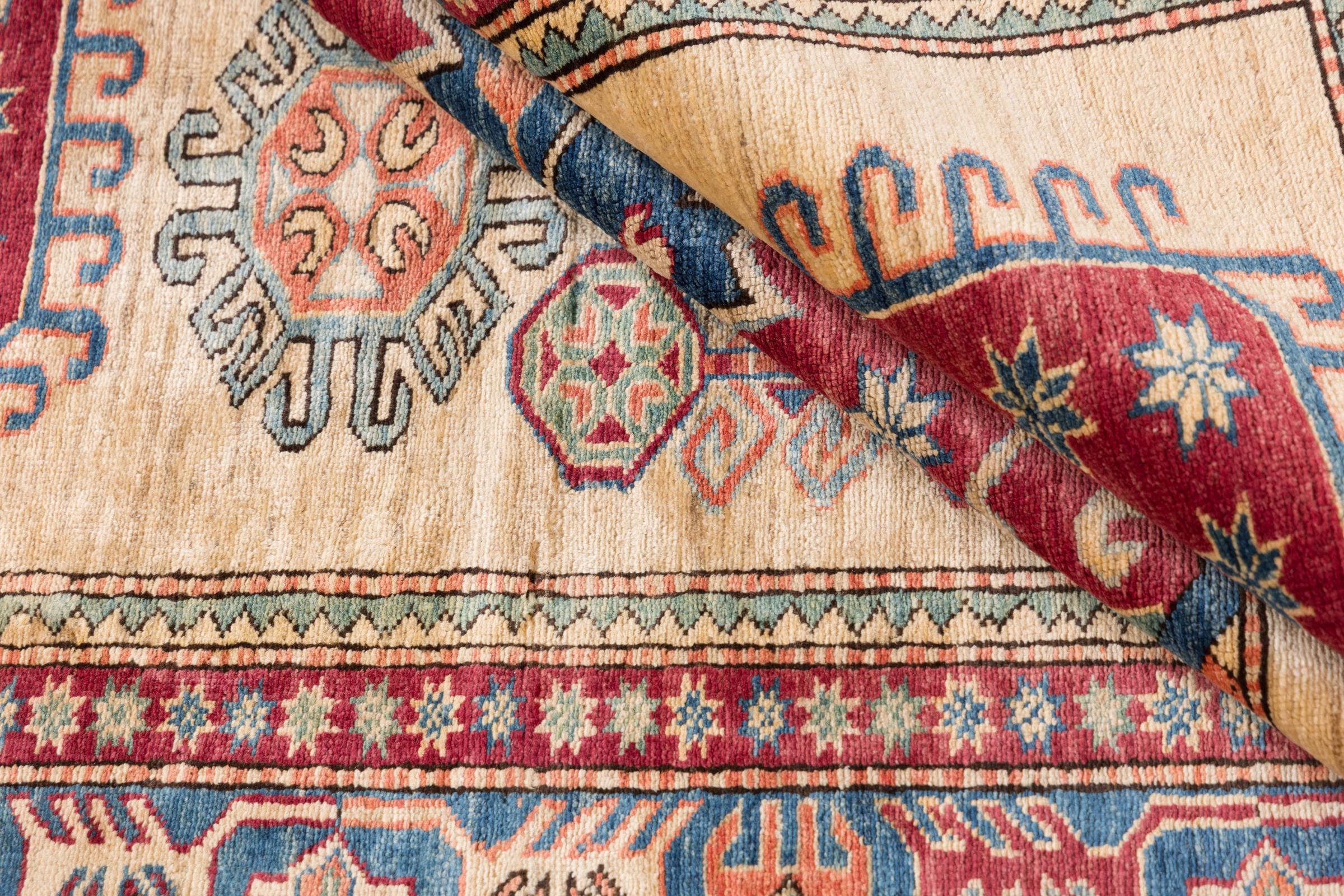 Dieser handgeknüpfte Kazak wurde im Stil der Kaukasus Teppiche von Hand geknüpft und überzeugt mit seiner hohen Robustheit und seinen lebhaften Farbtönen. Somit spiegelt er die Kultur des Kaukasus in einer wunderschönen Komposition wider. Eine Kultur, die seit Jahrhunderten die Kunst des Teppichknüpfens beherrscht und mit reizvoll schlichten Formen in beeindruckend lebendigen Farben nach Außen trägt.