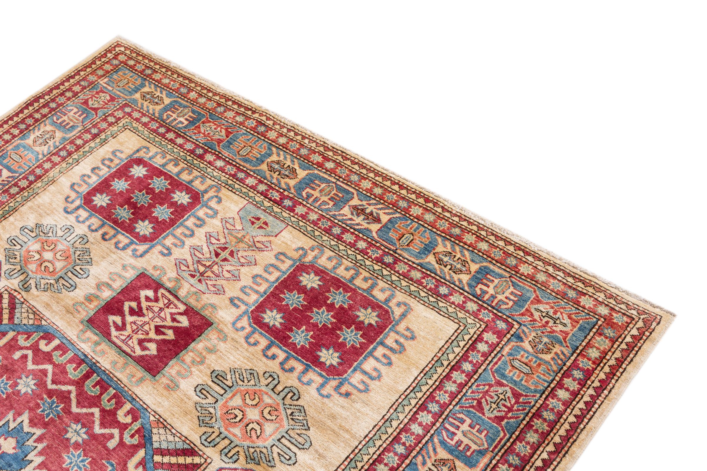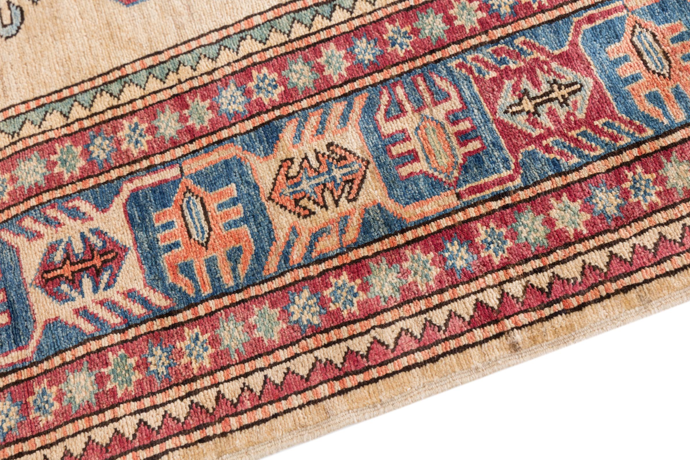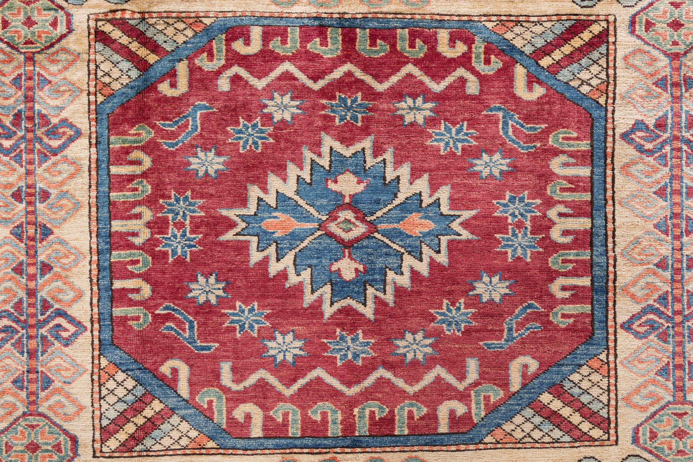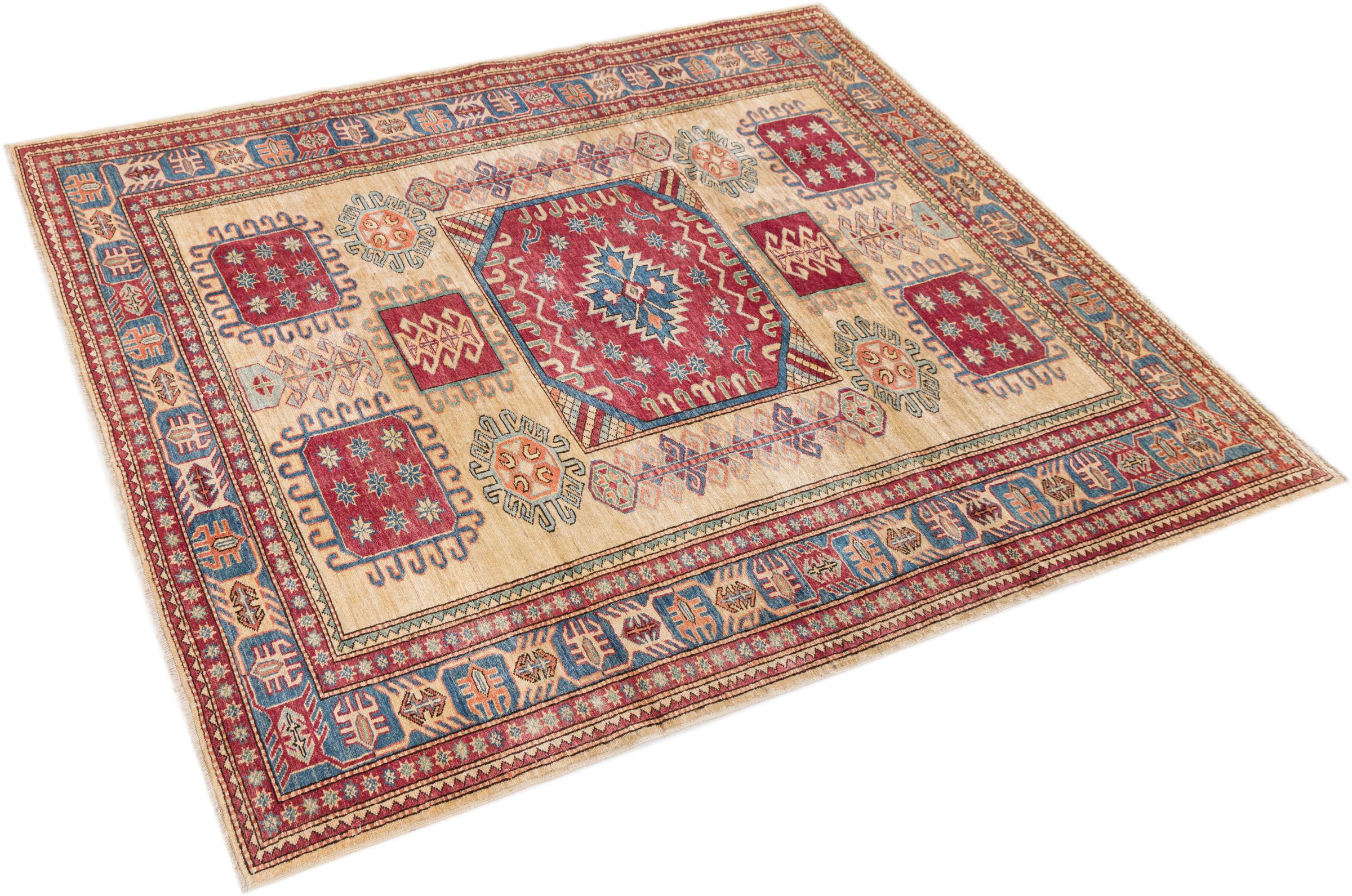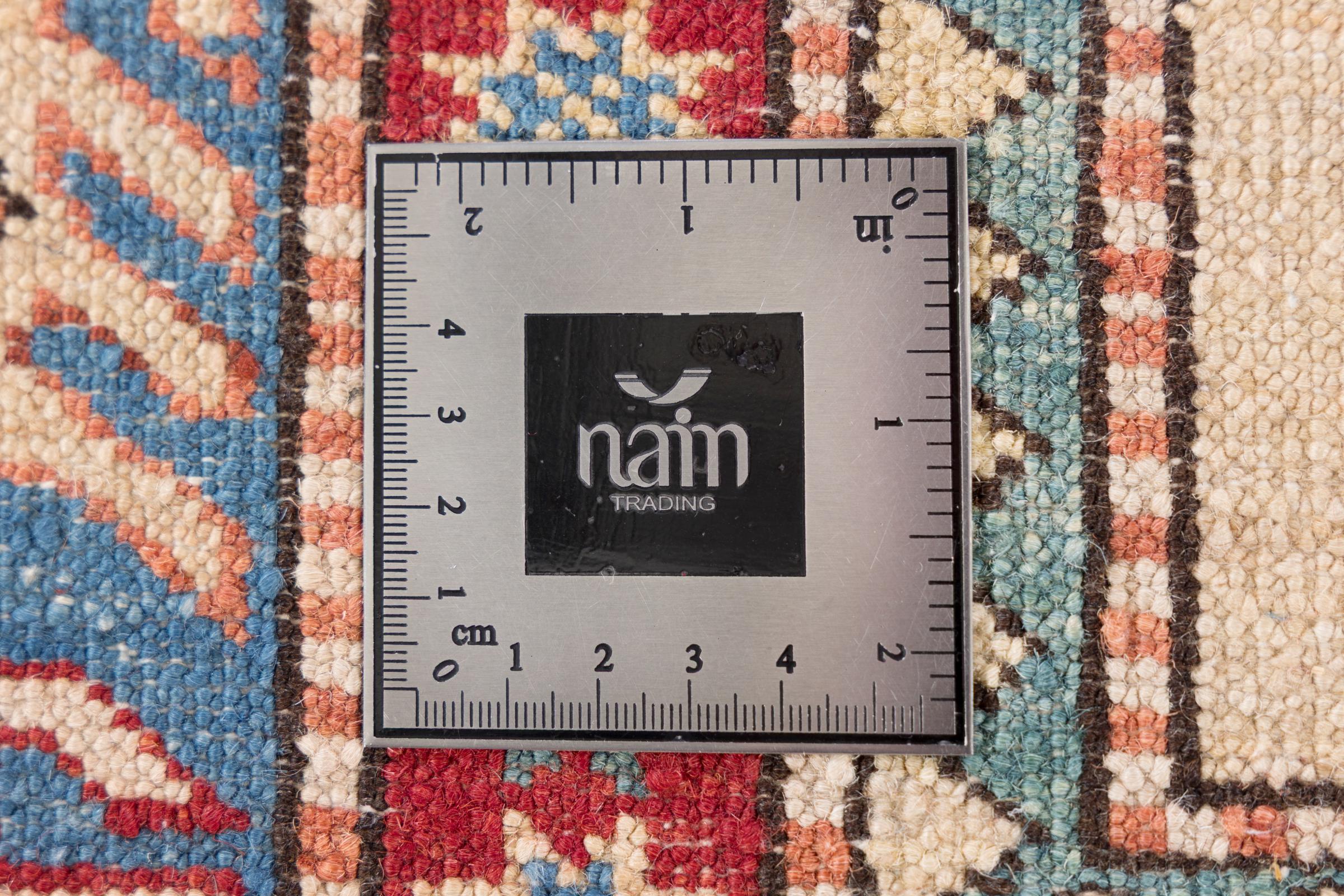 Dieser handgeknüpfte Kazak wurde im Stil der Kaukasus Teppiche von Hand geknüpft und überzeugt mit seiner hohen Robustheit und seinen lebhaften Farbtönen. Somit spiegelt er die Kultur des Kaukasus in einer wunderschönen Komposition wider. Eine Kultur, die seit Jahrhunderten die Kunst des Teppichknüpfens beherrscht und mit reizvoll schlichten Formen in beeindruckend lebendigen Farben nach Außen trägt.