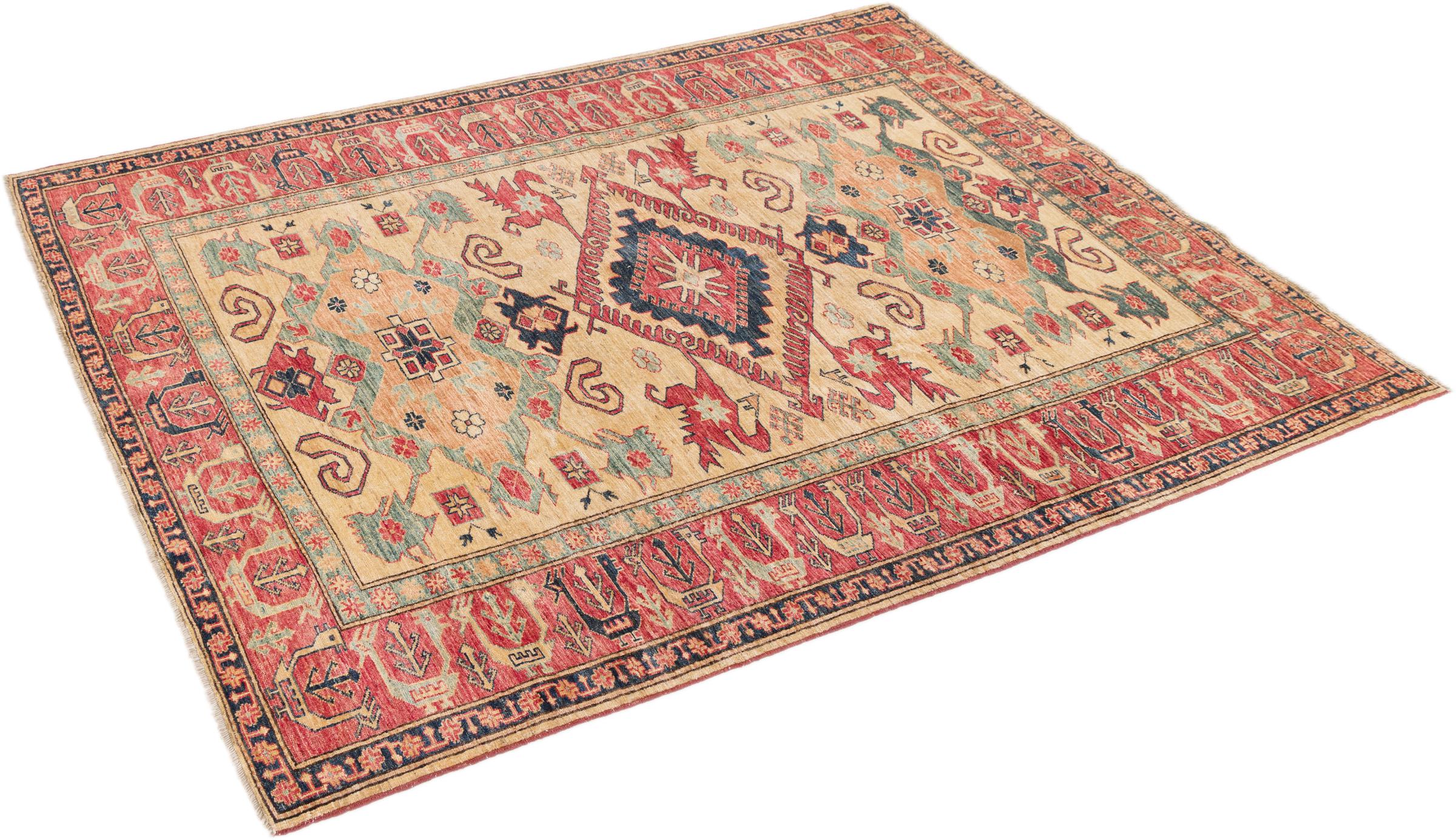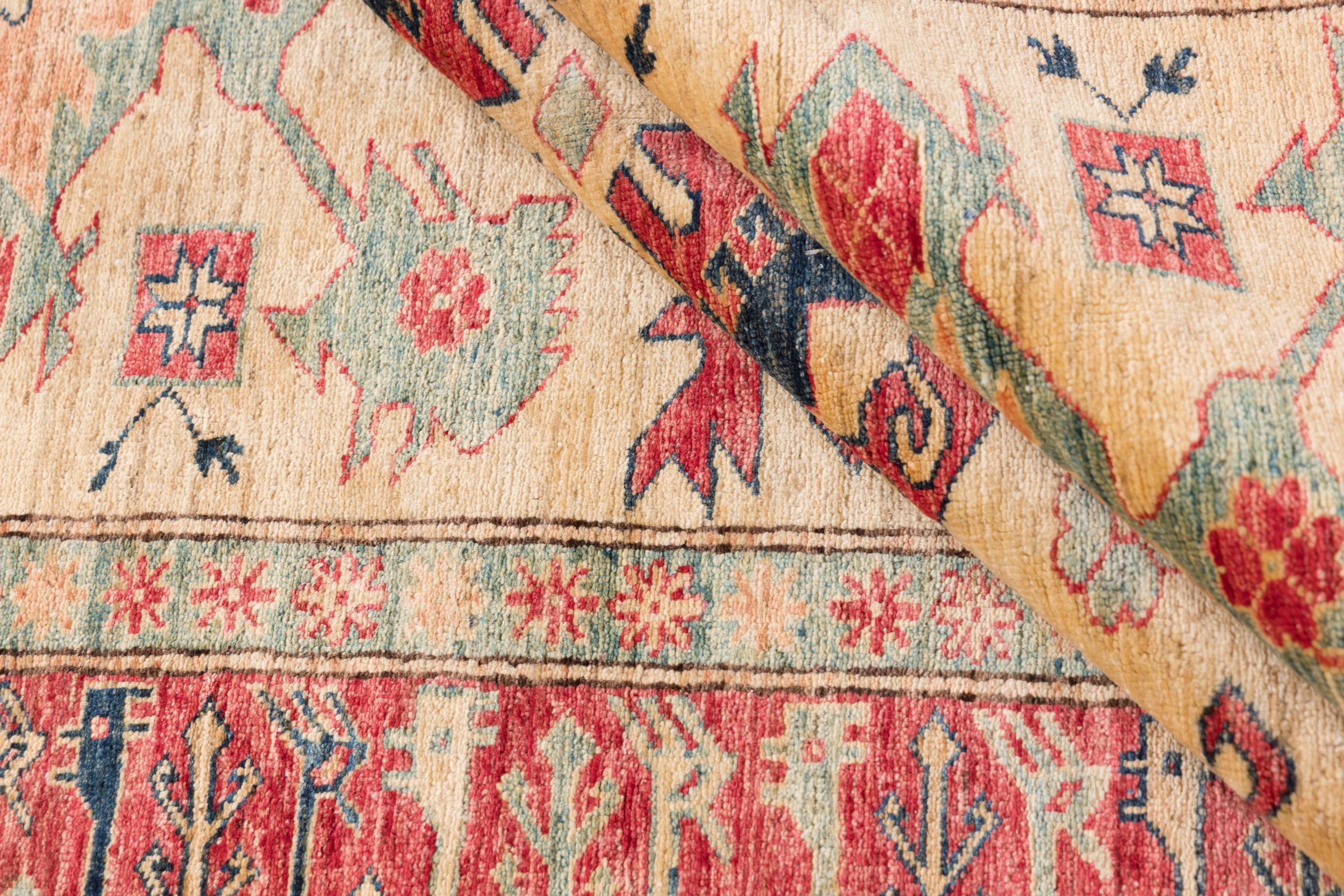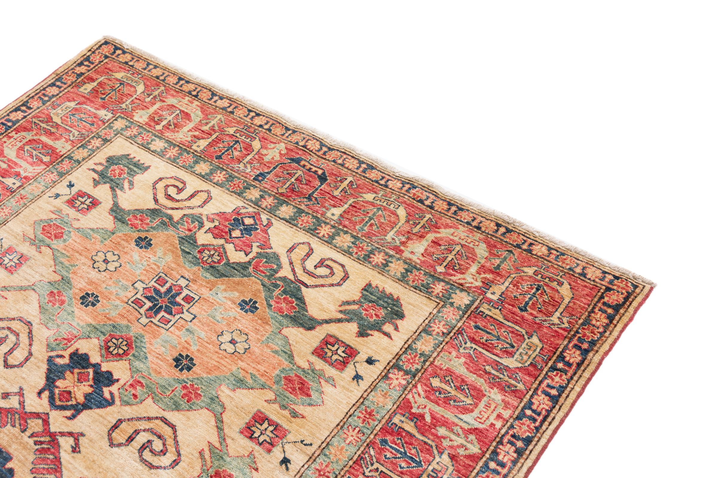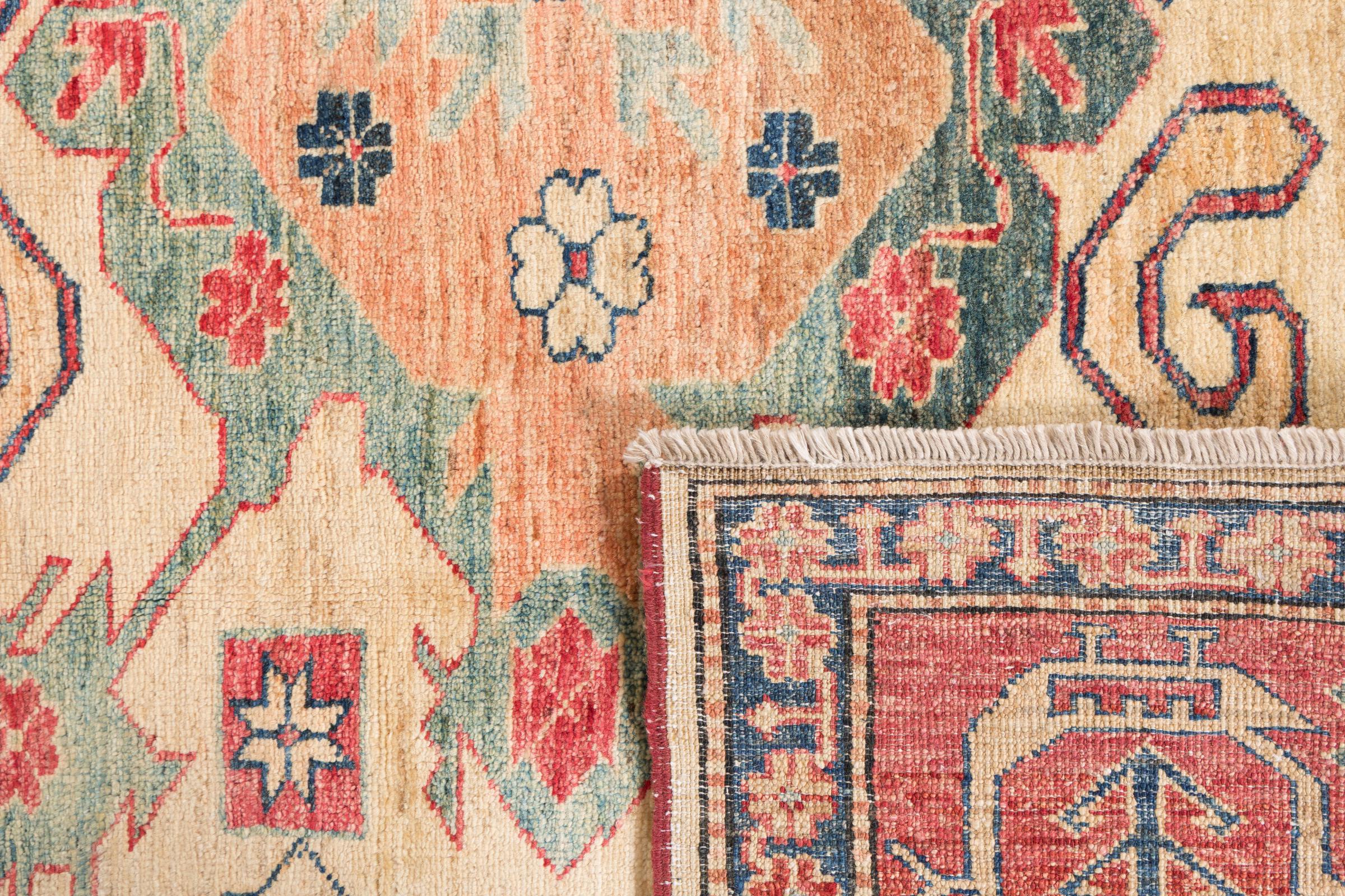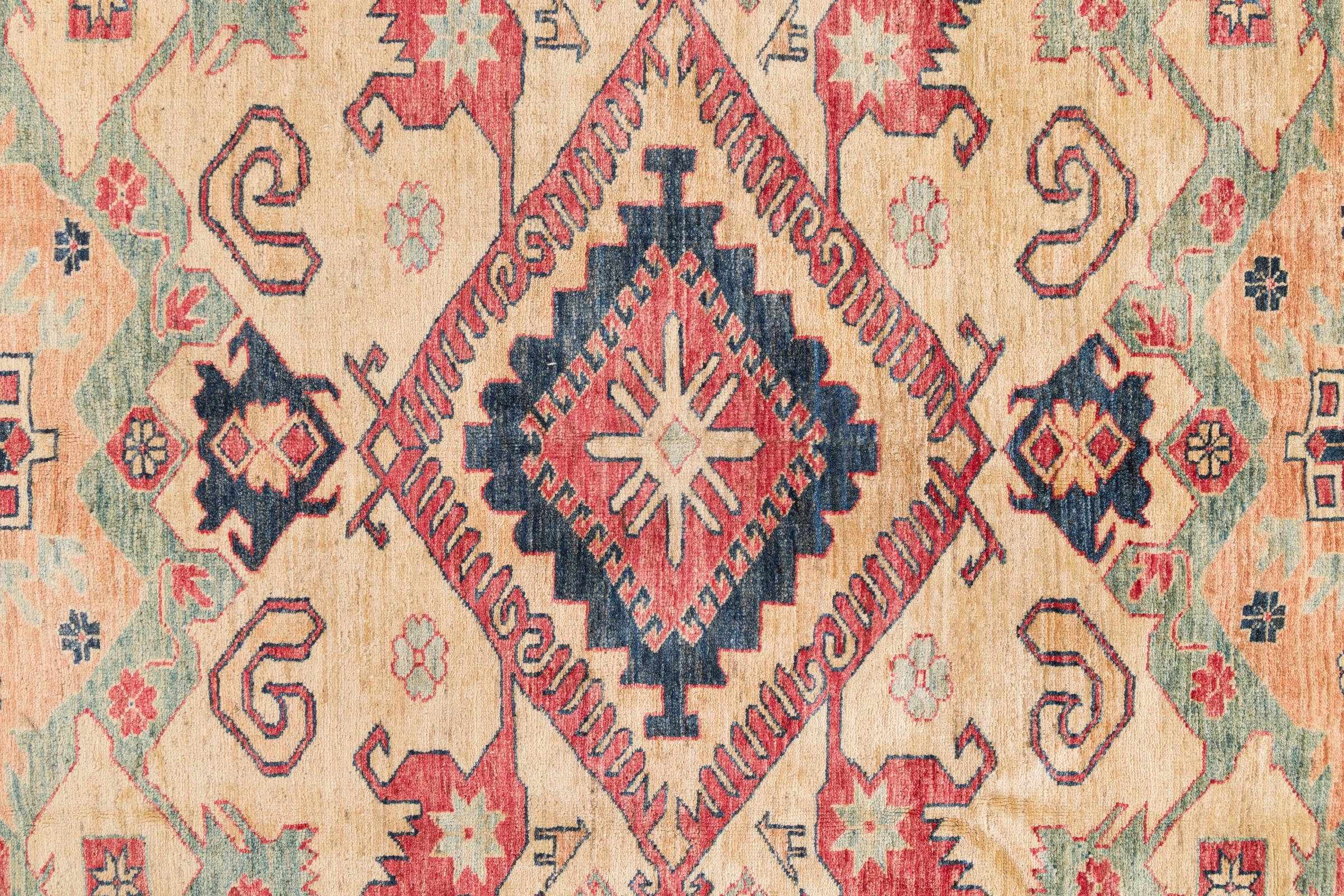 Dieser handgeknüpfte Kazak wurde im Stil der Kaukasus Teppiche von Hand geknüpft und überzeugt mit seiner hohen Robustheit und seinen lebhaften Farbtönen. Somit spiegelt er die Kultur des Kaukasus in einer wunderschönen Komposition wider. Eine Kultur, die seit Jahrhunderten die Kunst des Teppichknüpfens beherrscht und mit reizvoll schlichten Formen in beeindruckend lebendigen Farben nach Außen trägt.