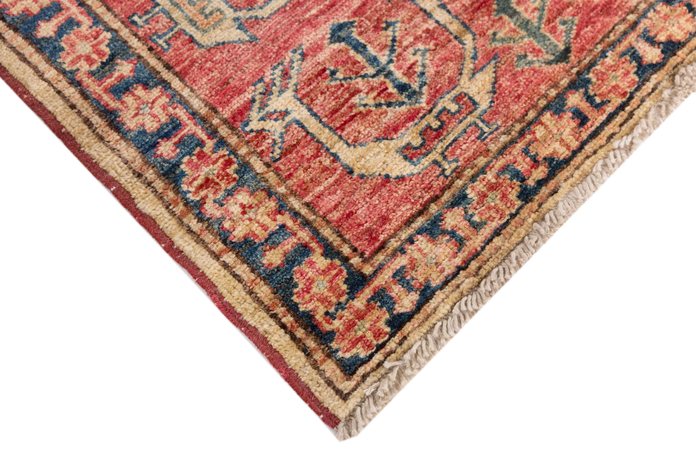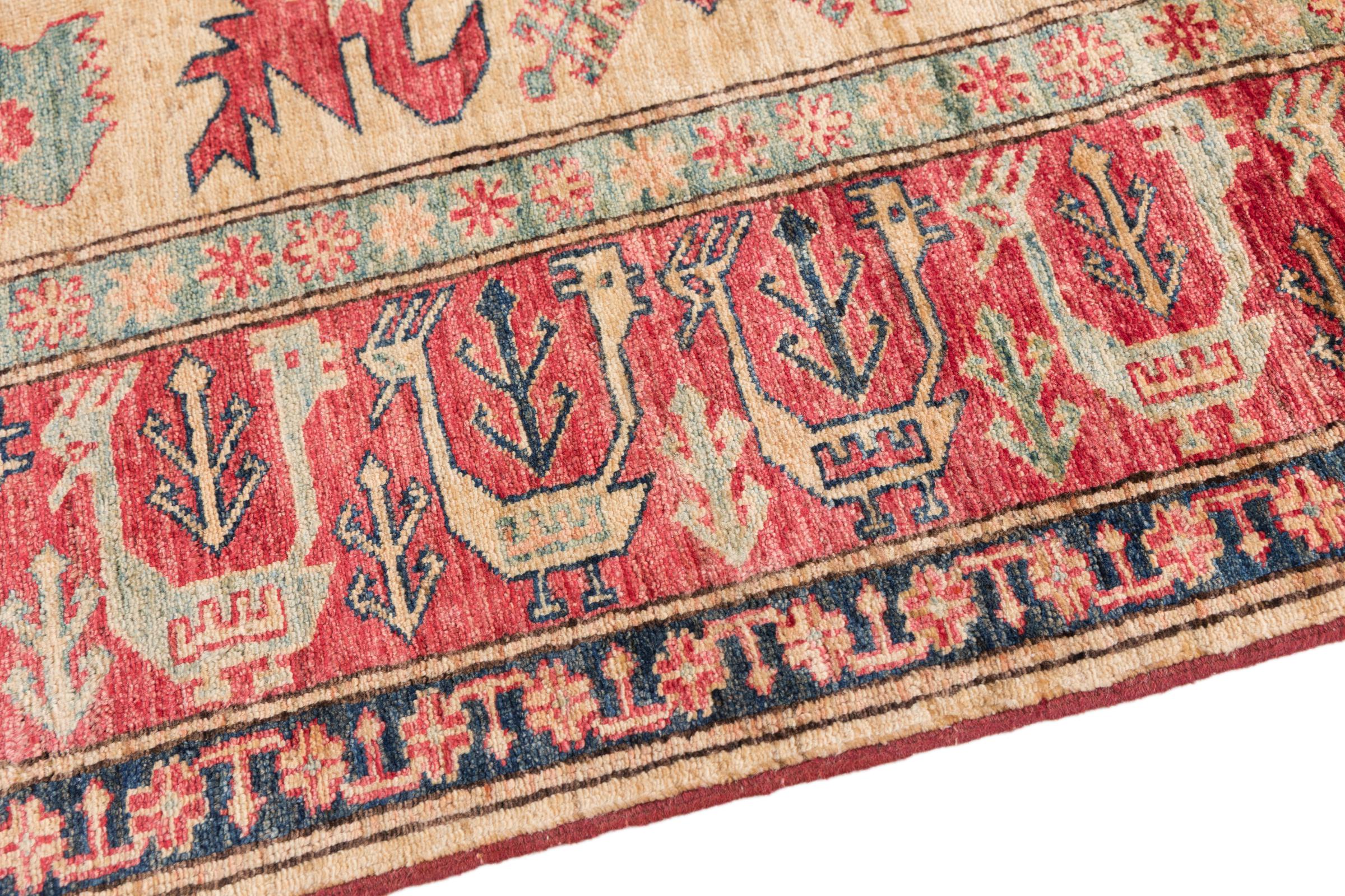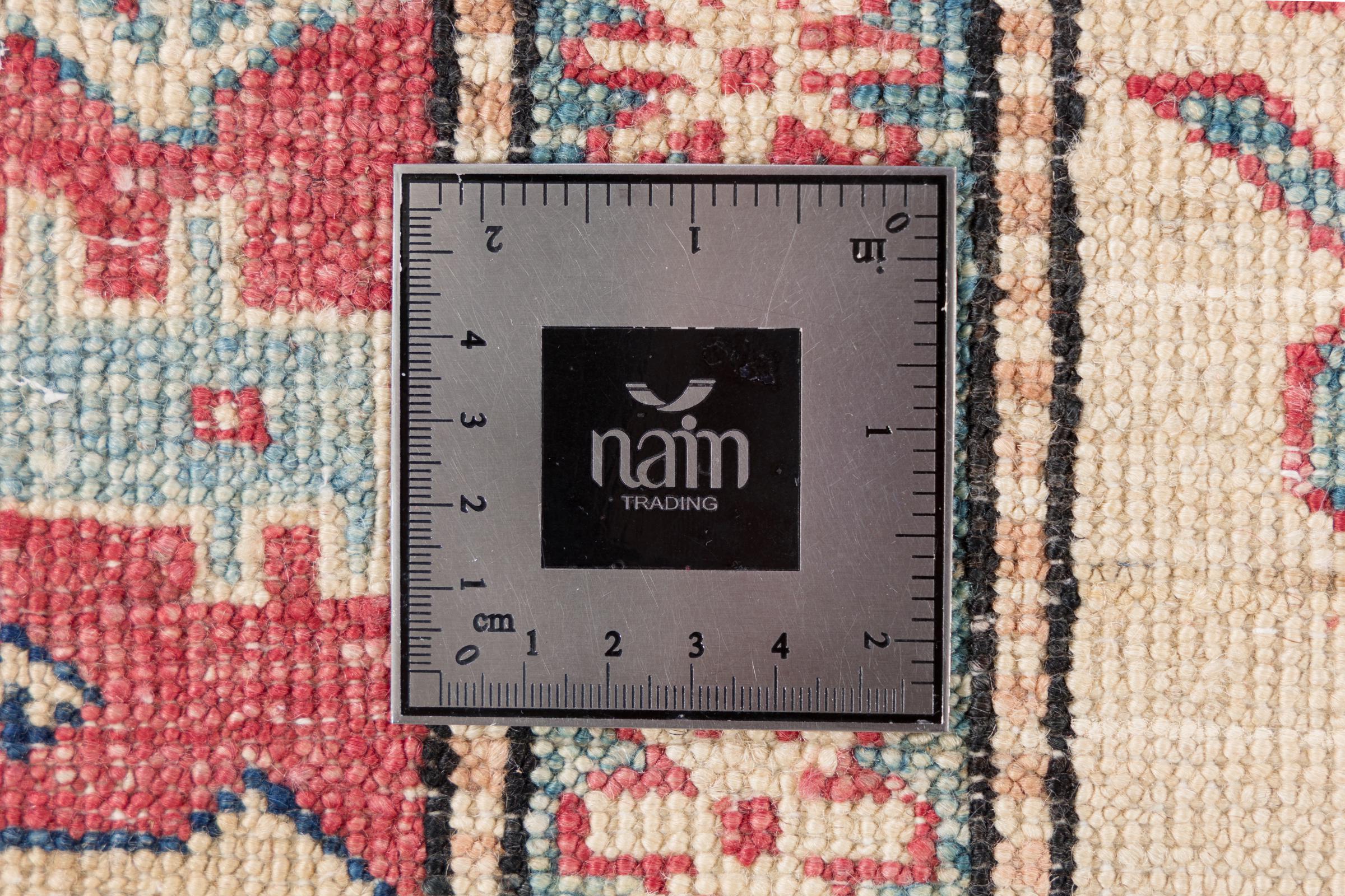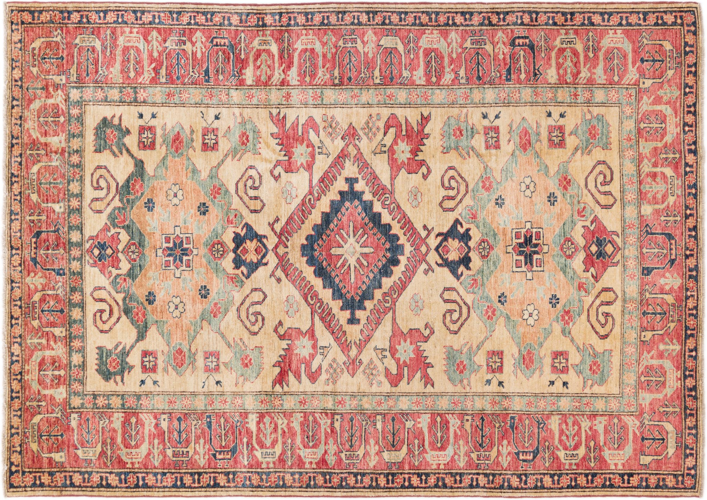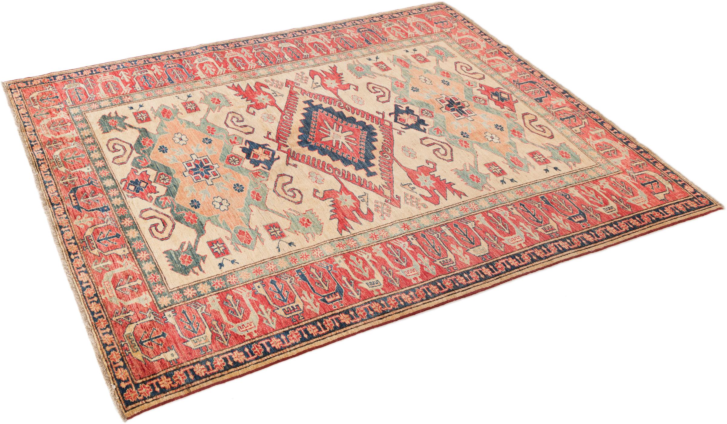 Dieser handgeknüpfte Kazak wurde im Stil der Kaukasus Teppiche von Hand geknüpft und überzeugt mit seiner hohen Robustheit und seinen lebhaften Farbtönen. Somit spiegelt er die Kultur des Kaukasus in einer wunderschönen Komposition wider. Eine Kultur, die seit Jahrhunderten die Kunst des Teppichknüpfens beherrscht und mit reizvoll schlichten Formen in beeindruckend lebendigen Farben nach Außen trägt.