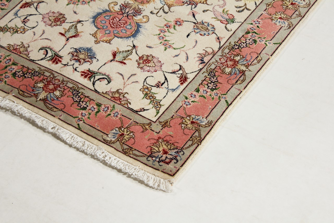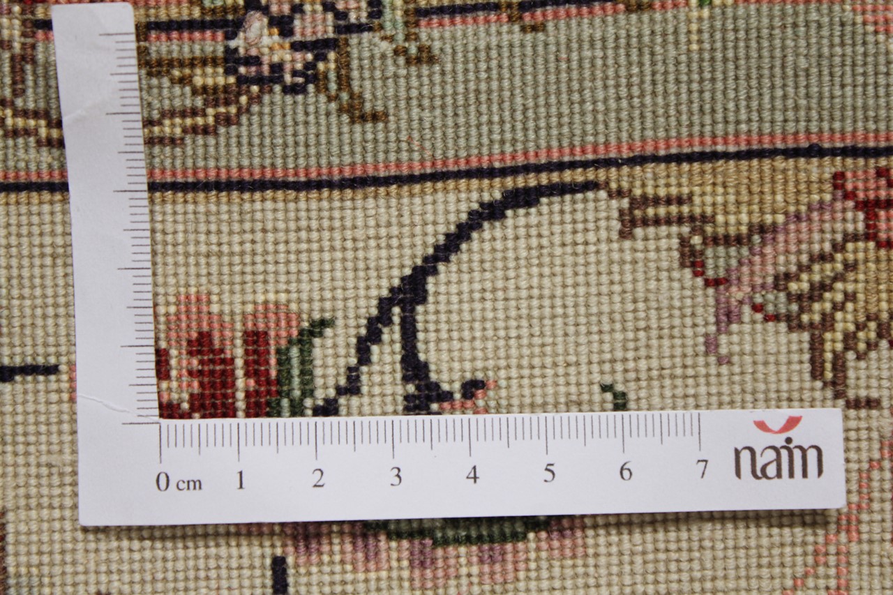 Dieser Täbriz wurde im Nordwesten des Iran, in der handwerklichen und gleichnamigen Stadt Tabriz handgeknüpft. Dabei wurde nur hochwertige Wolle und Naturseide verwendet. Er spiegelt mit seinen Mustern und dekorativen Elementen den Orient in seiner schönsten Form wieder. Lassen Sie ein Kunstwerk Einzug in Ihr Haus halten: Ein echtes Highlight für Sie und Ihre Gäste. Die Raj Anzahl gibt bei diesen Teppichen die Menge der Knoten auf einer Länge von 7cm wieder. So hat ein Täbriz 50Raj zum Beispiel grob 500.000 Knoten pro m2, ein 70Raj sogar ca. 1.000.000 Knoten pro m2.