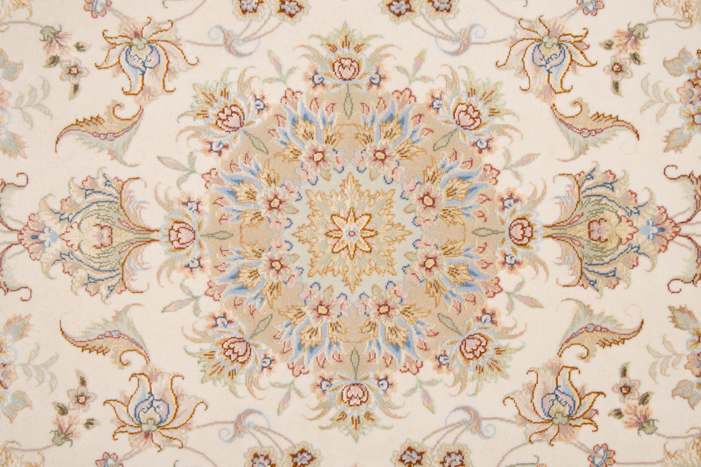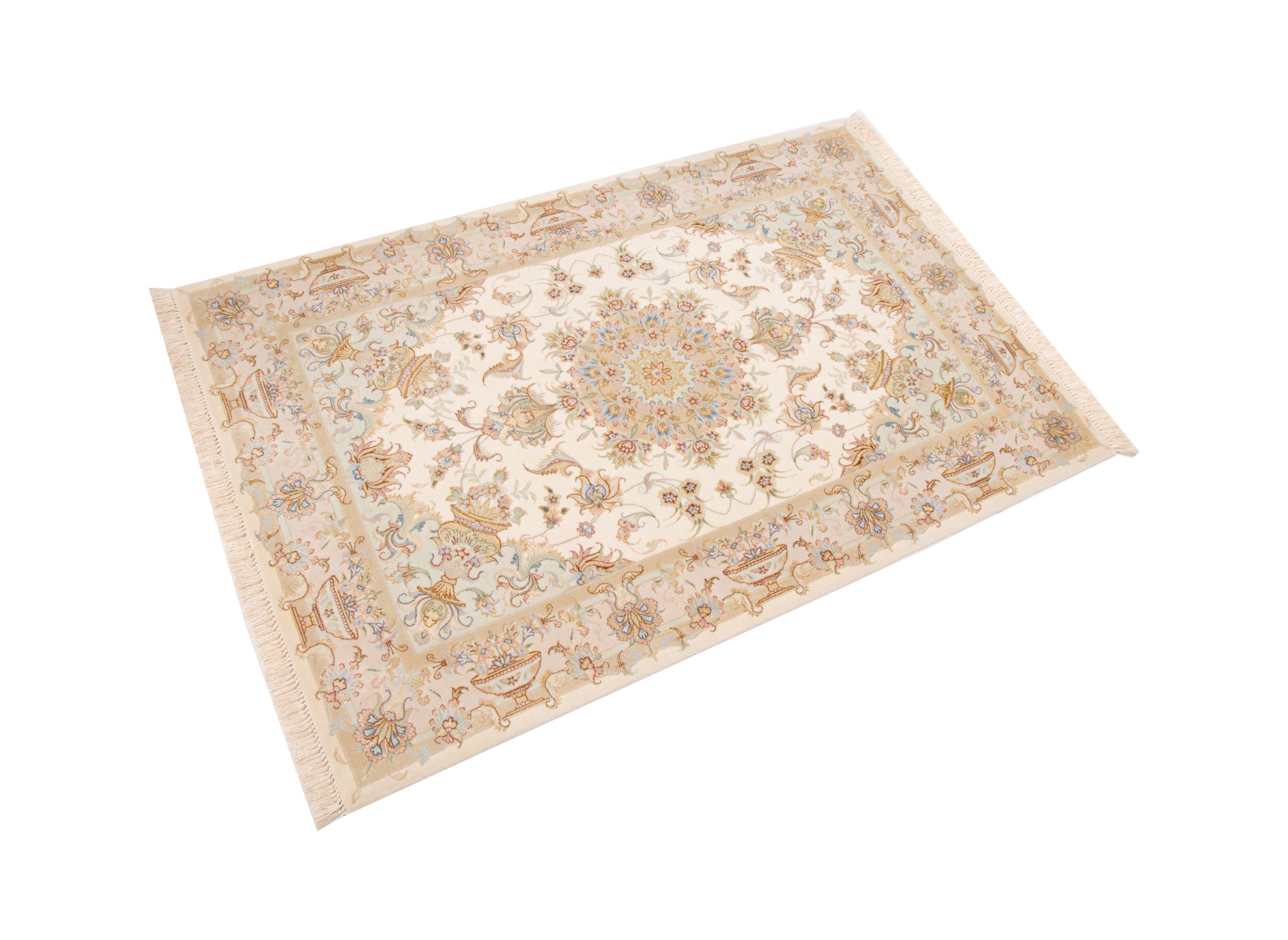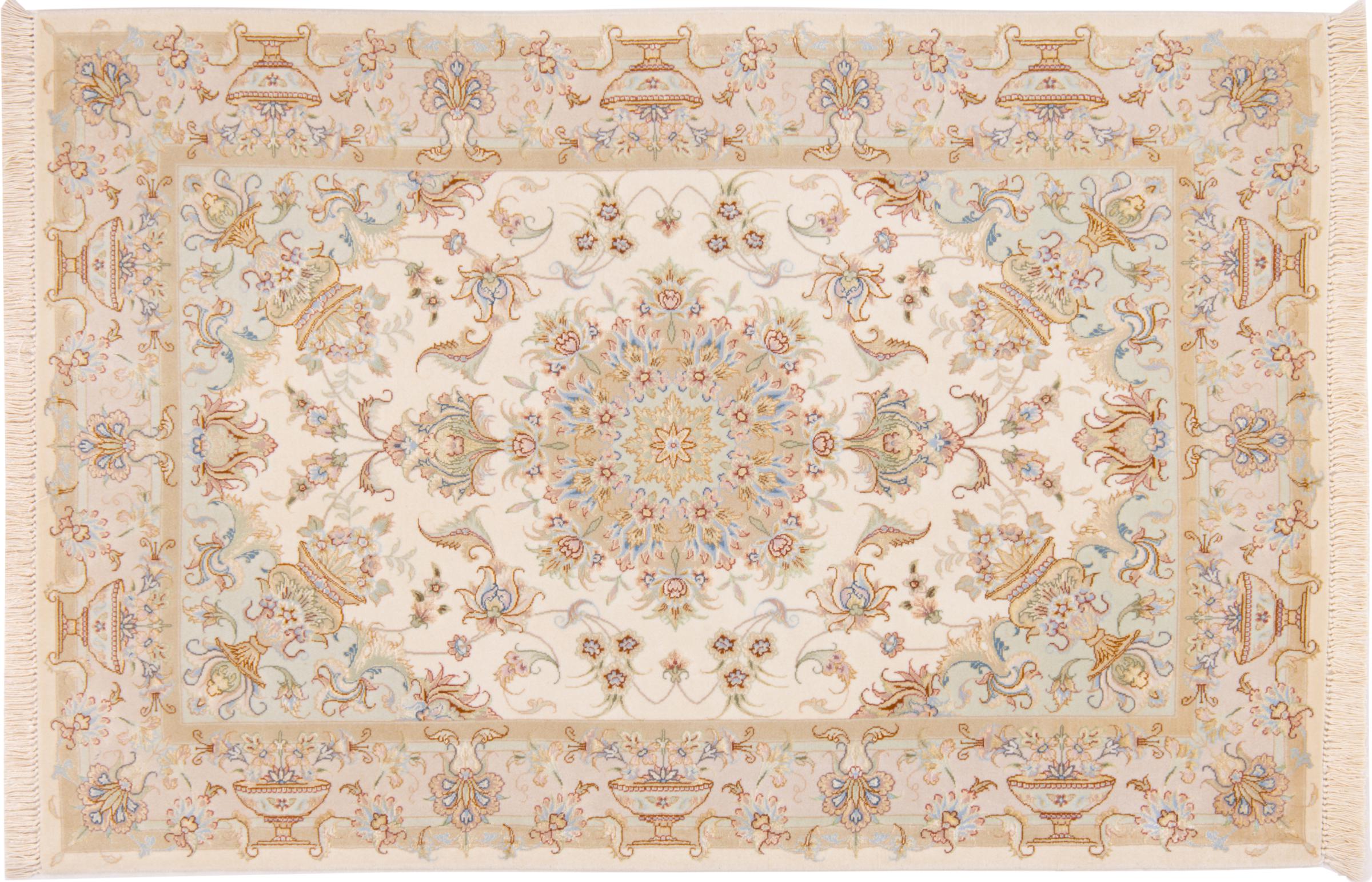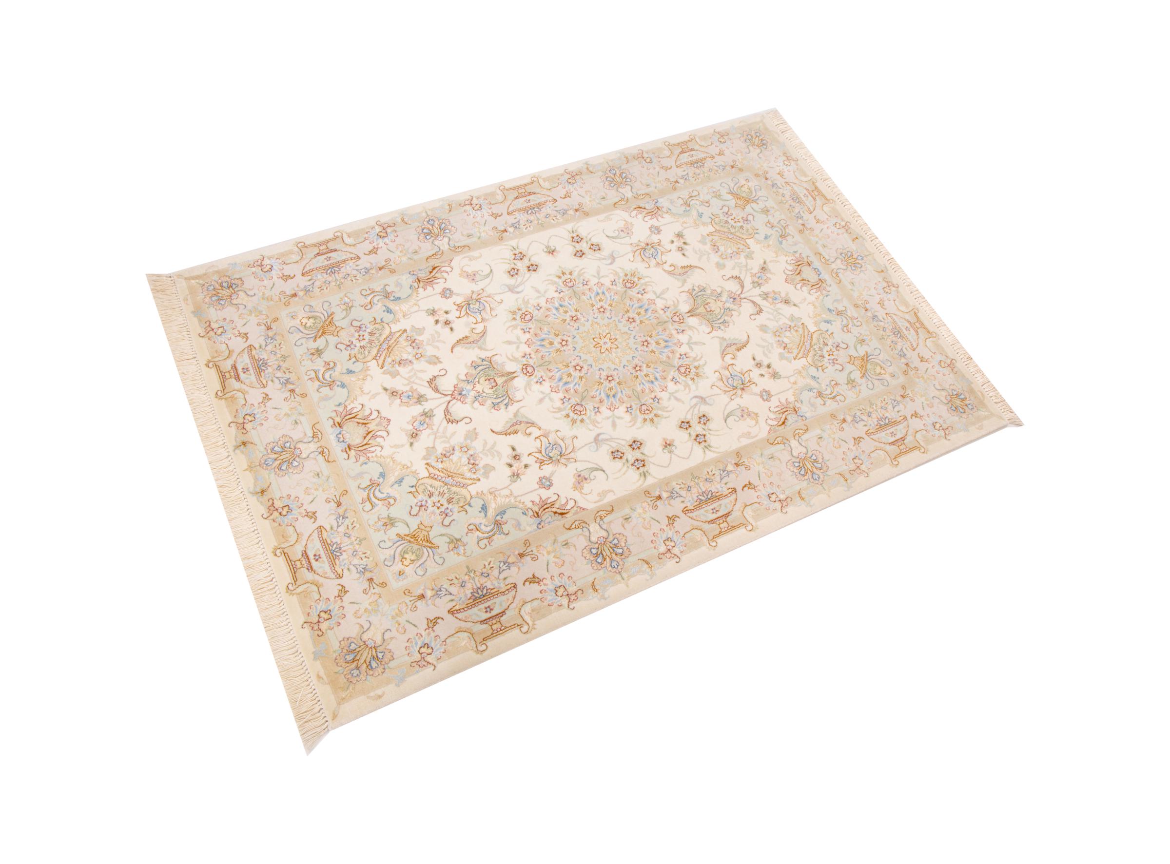 Teppich-Nr.: 292520003128204 Größe: 152x101 cm Dicke: ca. 7 mm Knoten: 440 000 - 490 000 / m² Verarbeitung: Handgeknüpft Flor: Wolle mit Seide Kette: Seide Ursprung: Persien Alter: Neu Gewicht: ca. 5 kg Auch bekannt als Tabriz, Tabris, Täbris, Tebriz, Tebris, 40Raj, 50Raj Anzahl auf Lager: Unikat - Nur 1 auf Lager