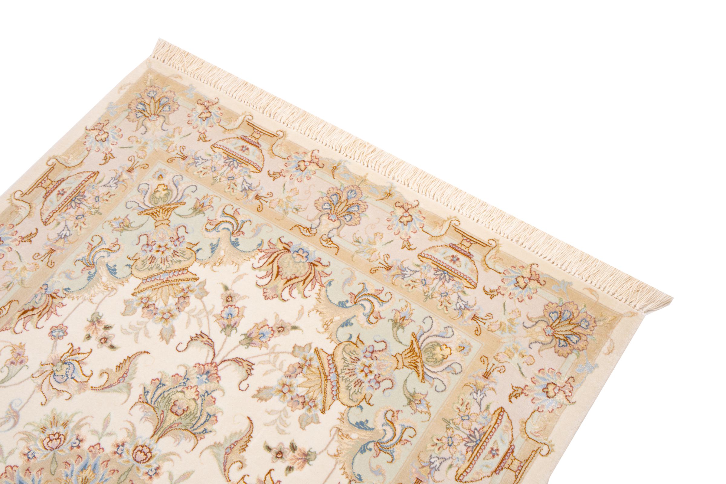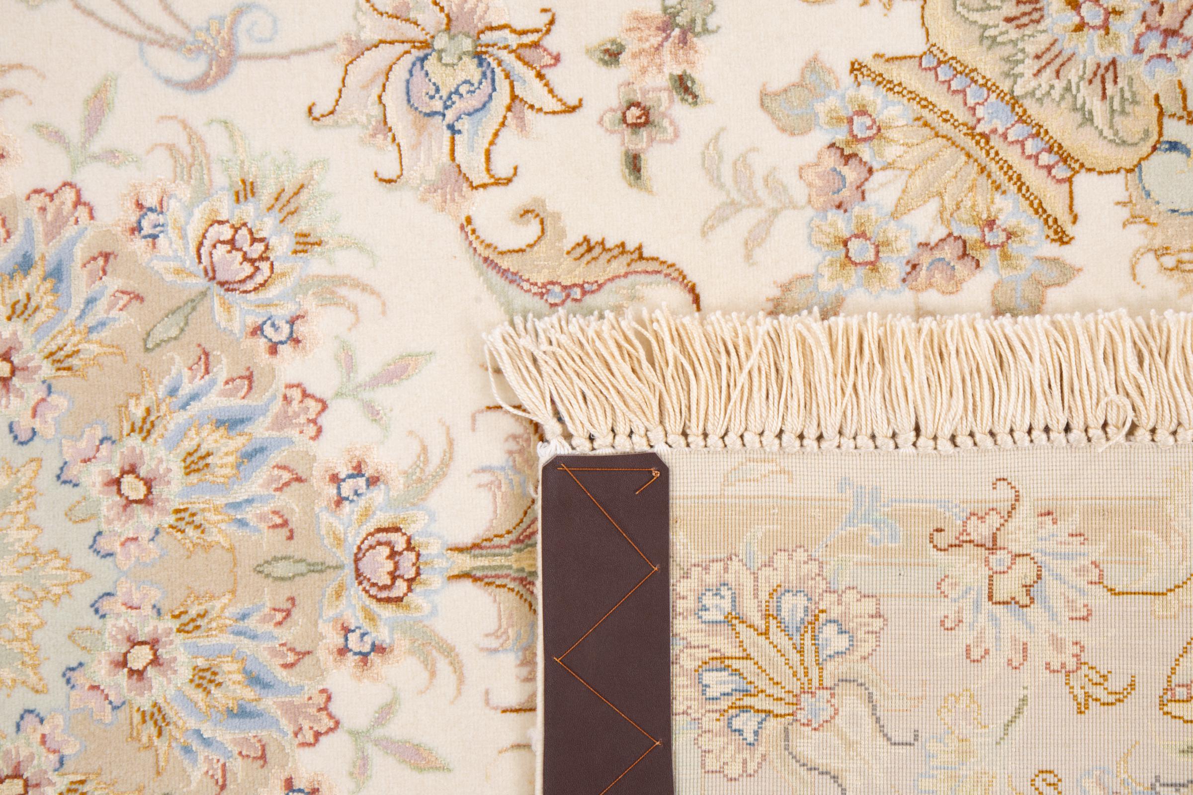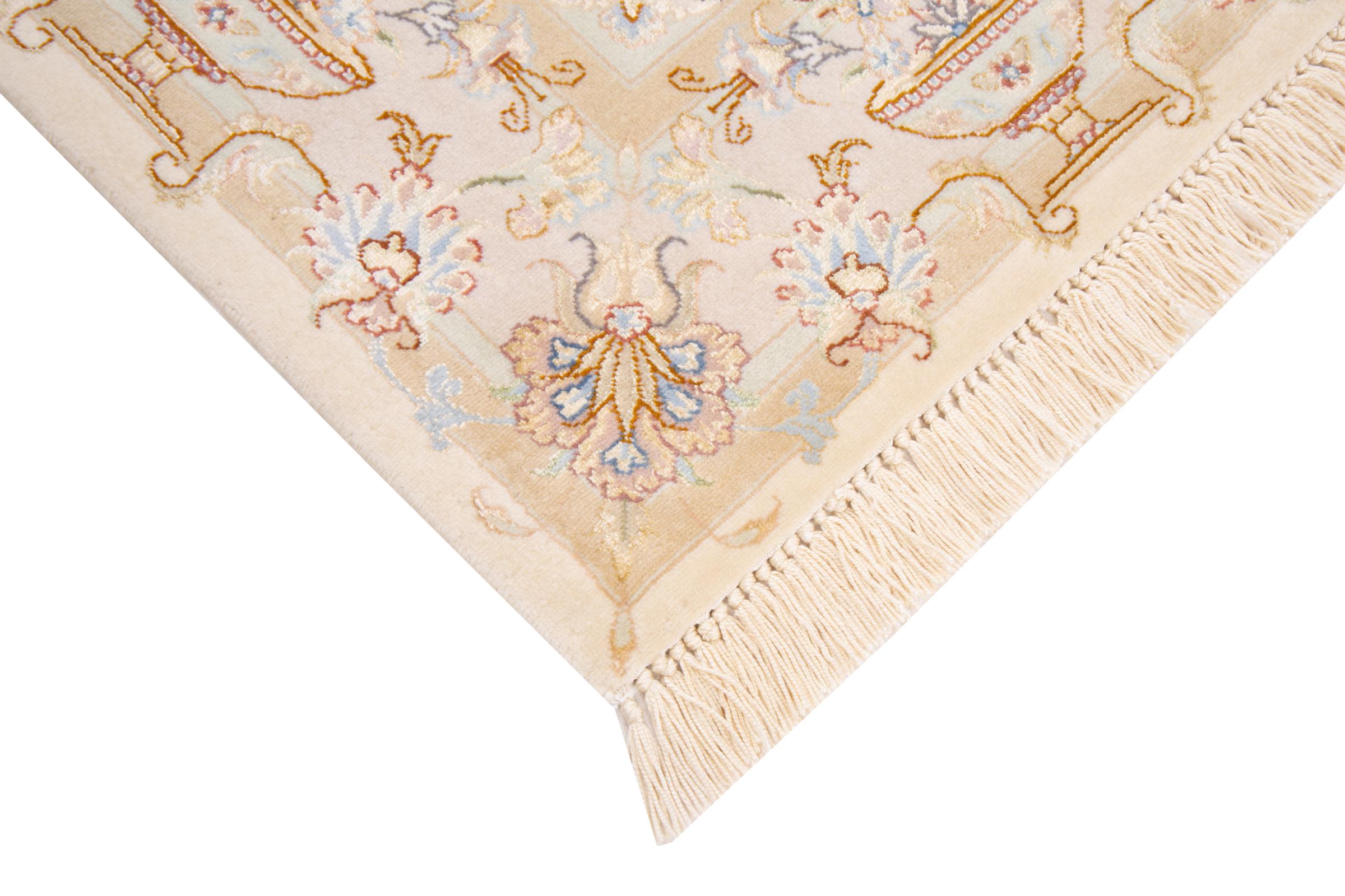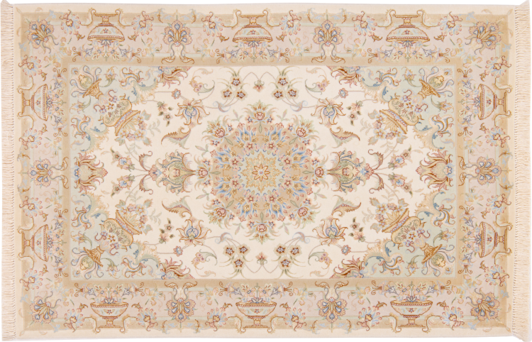 Teppich-Nr.: 292520003128204 Größe: 152x101 cm Dicke: ca. 7 mm Knoten: 440 000 - 490 000 / m² Verarbeitung: Handgeknüpft Flor: Wolle mit Seide Kette: Seide Ursprung: Persien Alter: Neu Gewicht: ca. 5 kg Auch bekannt als Tabriz, Tabris, Täbris, Tebriz, Tebris, 40Raj, 50Raj Anzahl auf Lager: Unikat - Nur 1 auf Lager