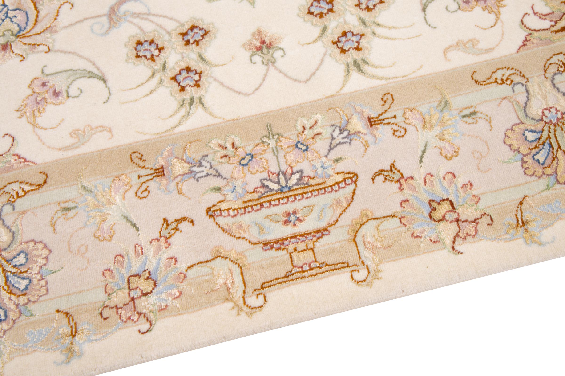 Dieser Täbriz wurde im Nordwesten des Iran, in der handwerklichen und gleichnamigen Stadt Tabriz handgeknüpft. Dabei wurde nur hochwertige Wolle und Naturseide verwendet. Er spiegelt mit seinen Mustern und dekorativen Elementen den Orient in seiner schönsten Form wieder. Lassen Sie ein Kunstwerk Einzug in Ihr Haus halten: Ein echtes Highlight für Sie und Ihre Gäste. Die Raj Anzahl gibt bei diesen Teppichen die Menge der Knoten auf einer Länge von 7cm wieder. So hat ein Täbriz 50Raj zum Beispiel grob 500.000 Knoten pro m2, ein 70Raj sogar ca. 1.000.000 Knoten pro m2.