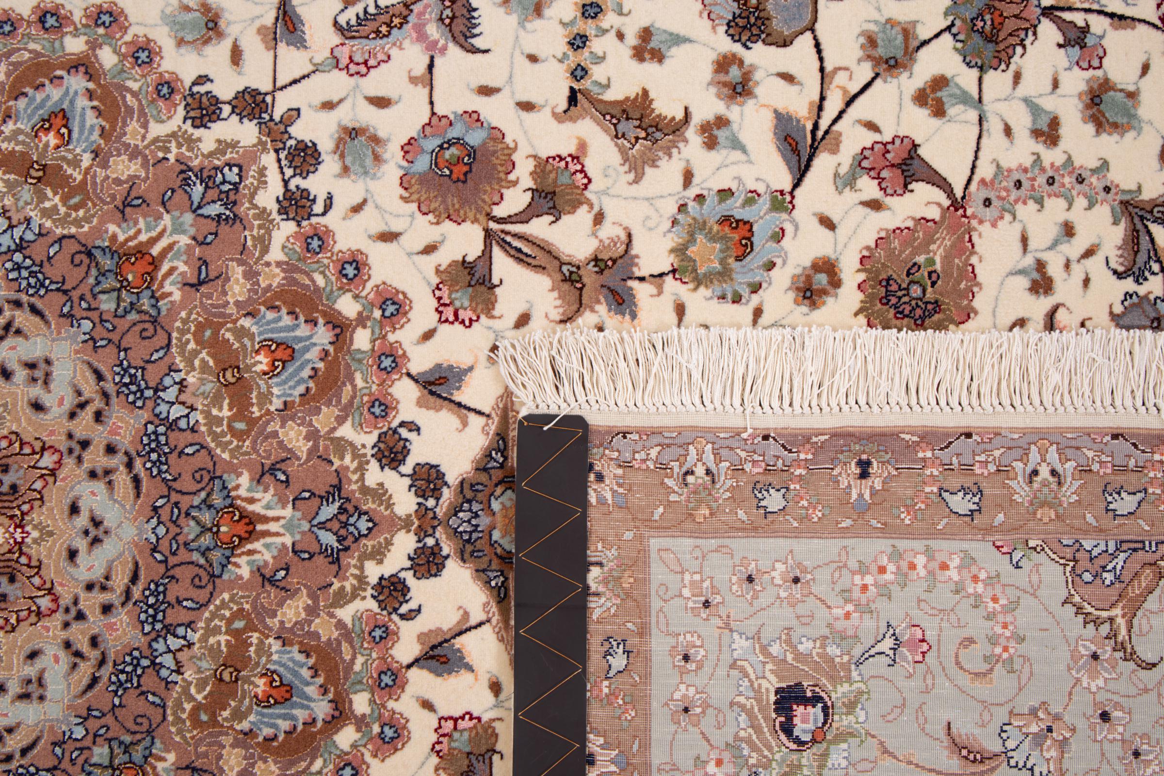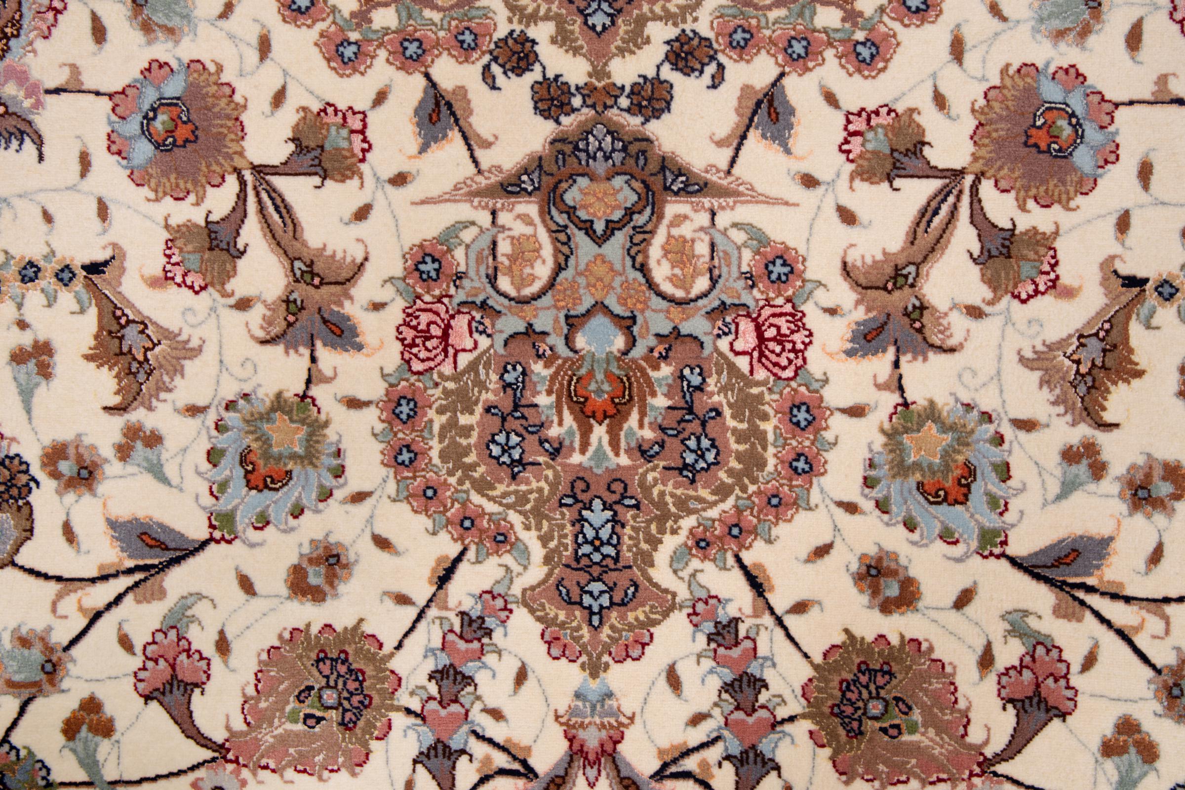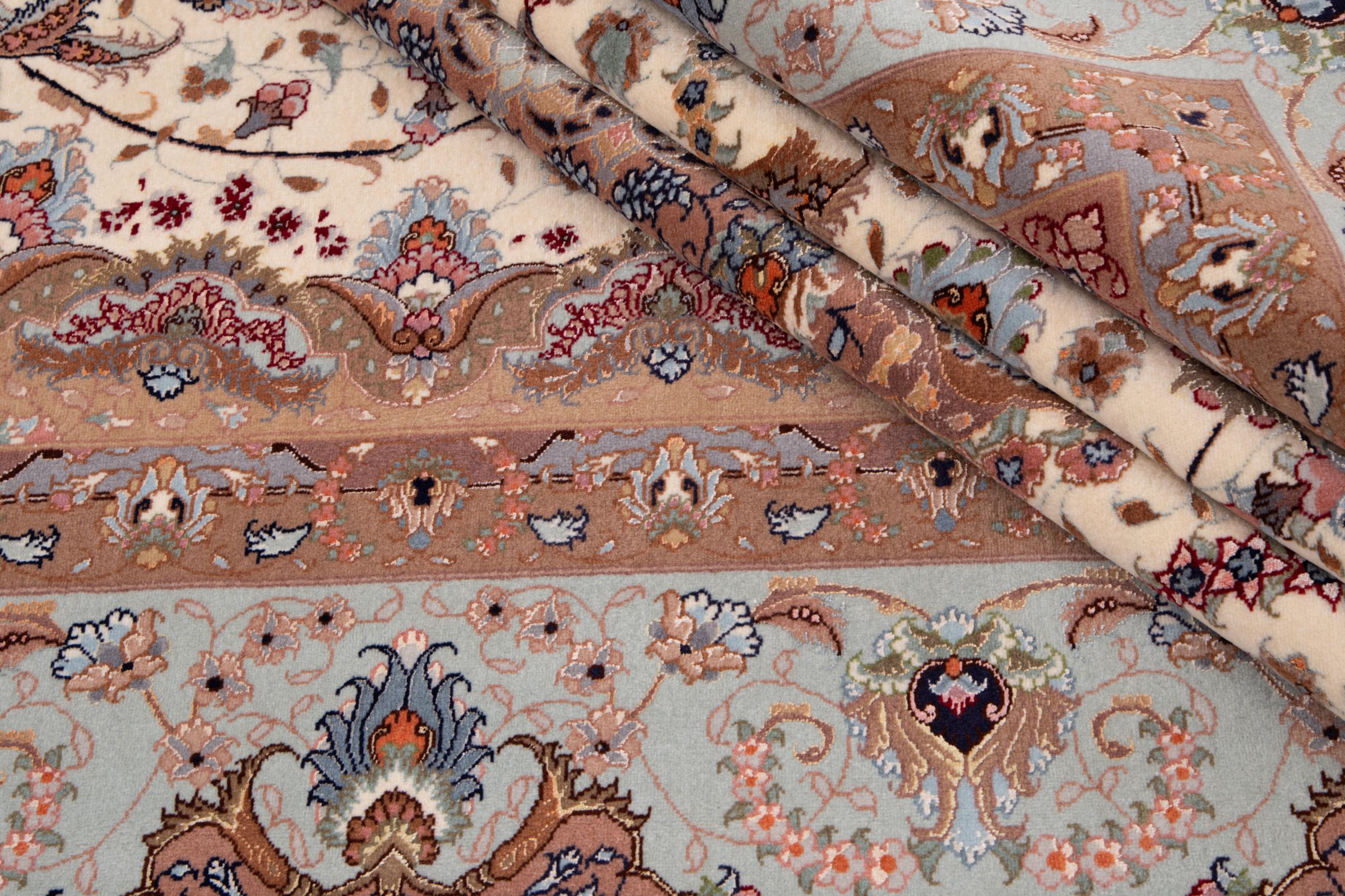 Dieser Täbriz wurde im Nordwesten des Iran, in der handwerklichen und gleichnamigen Stadt Tabriz handgeknüpft. Dabei wurde nur hochwertige Wolle und Naturseide verwendet. Er spiegelt mit seinen Mustern und dekorativen Elementen den Orient in seiner schönsten Form wieder. Lassen Sie ein Kunstwerk Einzug in Ihr Haus halten: Ein echtes Highlight für Sie und Ihre Gäste. Die Raj Anzahl gibt bei diesen Teppichen die Menge der Knoten auf einer Länge von 7cm wieder. So hat ein Täbriz 50Raj zum Beispiel grob 500.000 Knoten pro m2, ein 70Raj sogar ca. 1.000.000 Knoten pro m2.