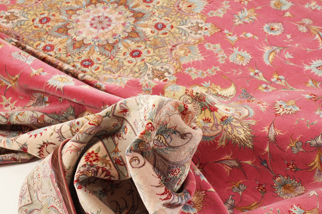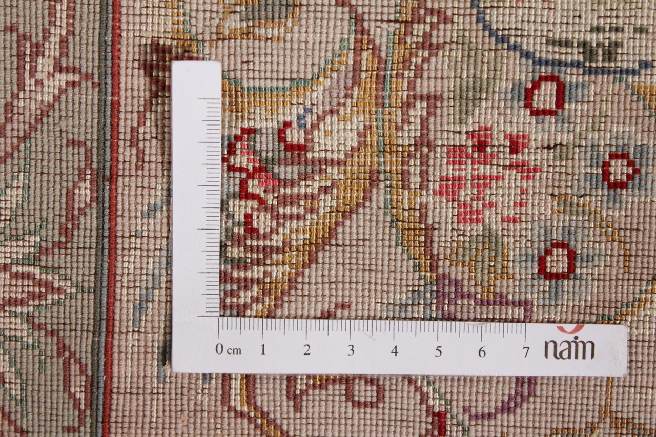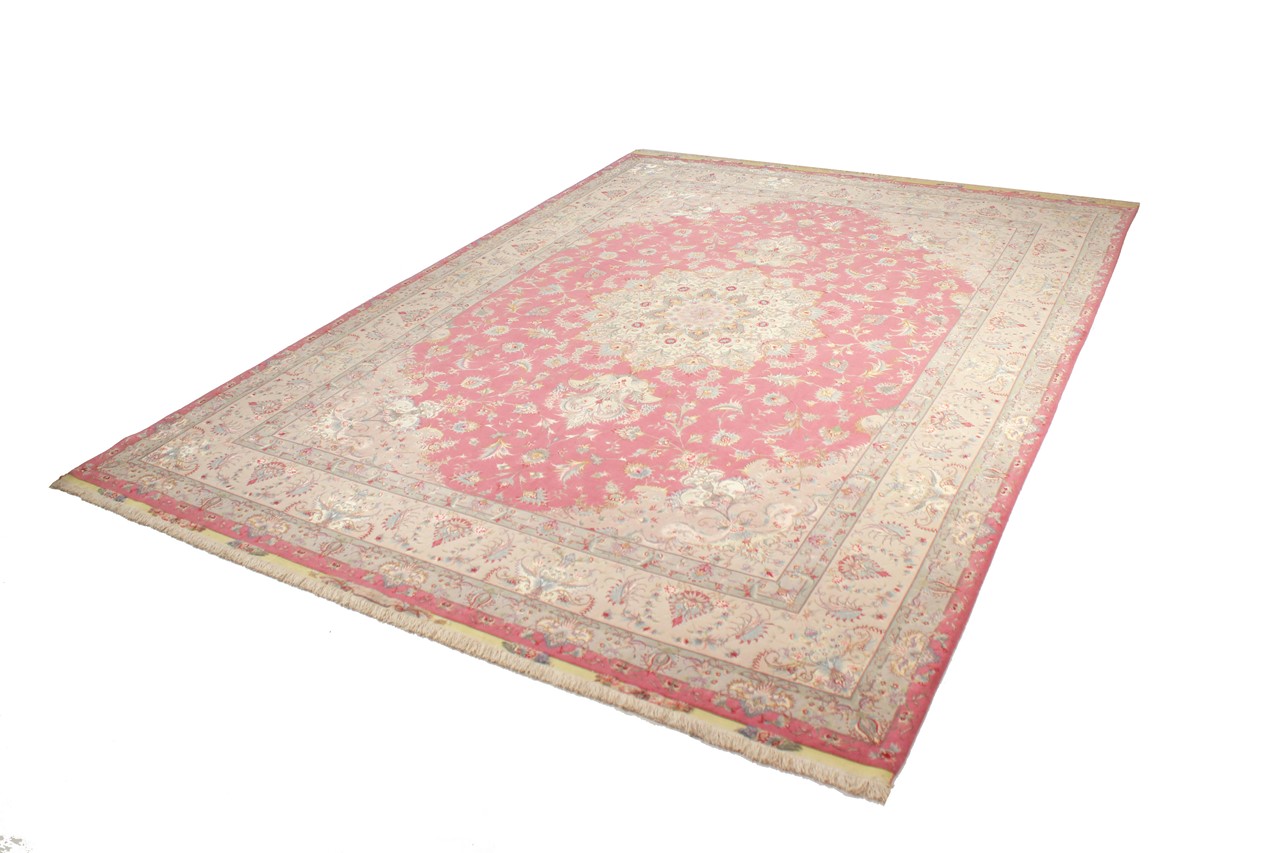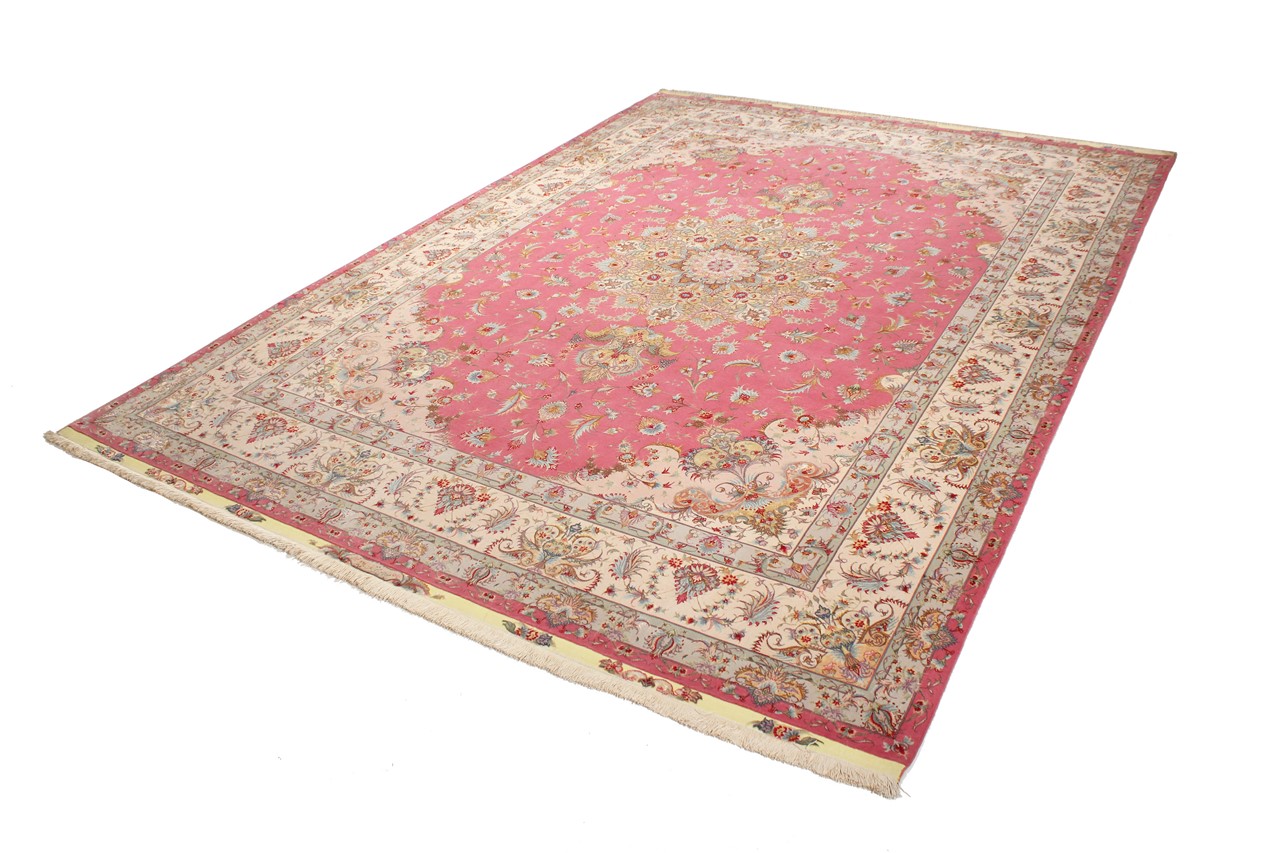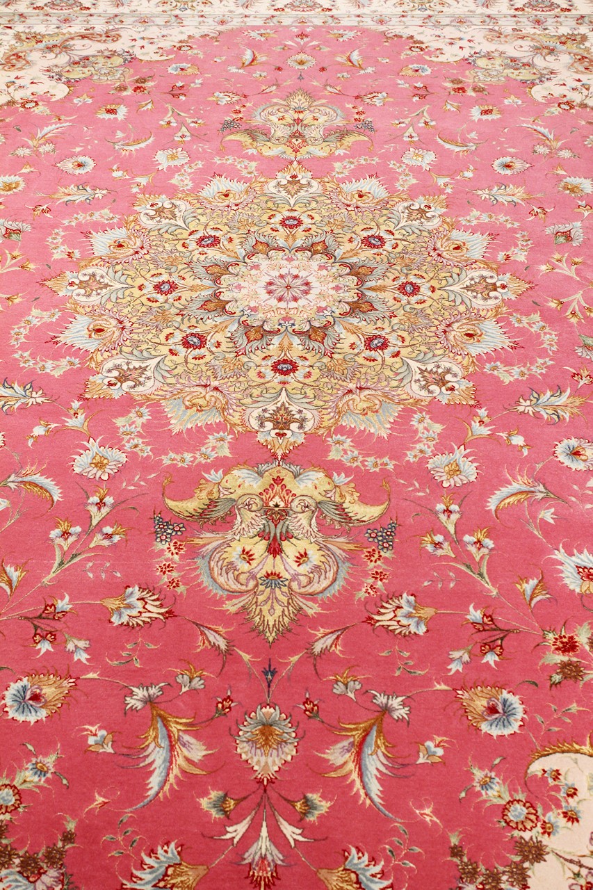 Dieser Täbriz wurde im Nordwesten des Iran, in der handwerklichen und gleichnamigen Stadt Tabriz handgeknüpft. Dabei wurde nur hochwertige Wolle und Naturseide verwendet. Er spiegelt mit seinen Mustern und dekorativen Elementen den Orient in seiner schönsten Form wieder. Täbriz Teppiche sind sehr bekannt und beliebt. Die Raj Anzahl gibt bei diesen Teppichen die Menge der Knoten auf einer Länge von 7cm wieder. So hat ein Täbriz 60Raj zum Beispiel ca. 700.000 Knoten pro Quadratmeter.